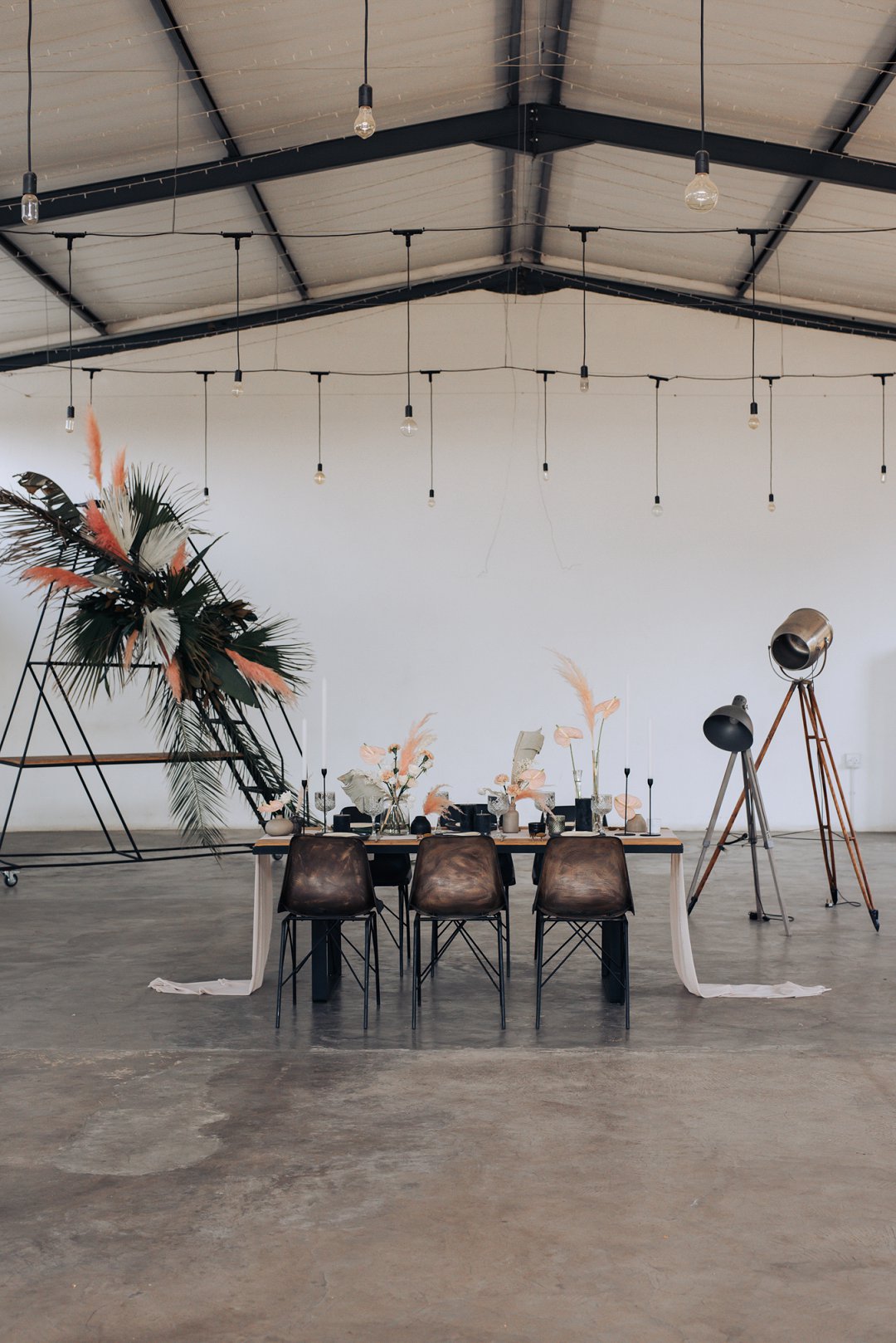 Hierdie industriële gestileerde fotosessie het ʼn baie moderne en luukse gevoel, perfek vir die moderne bruidspaar wat ʼn blywende herinnering wil skep. Die dekor is donker, maar sag kleurige elemente en het ʼn ietwat luukse gevoel tot dit. Alles lyk so simmetries en perfek geposisioneer.