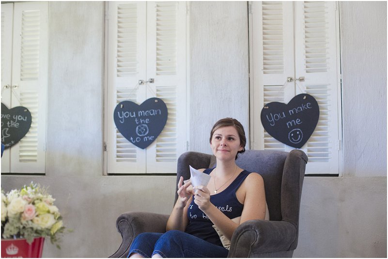 My pa het die naweek afgekom Kaap toe sodat Viljoen my pa die groot vraag kon vra. Min het ek daai Saterdag oggend geweet dat Viljoen klaar ‘n hele dag se verassings/bederfies gereël het. Eks wakker gemaak met ‘n briefie van Viljoen af wat my inlig vandag is ons groot dag. Ek het nog 5 briefies gekry deur die dag, waarvan ek die laaste een by my pa gekry het. Met mooi blink naels, ‘n nuwe uitrusting en trane van blydskap het ek af gestap strand toe waar die man van my drome vir my gewag het, op sy knieë.