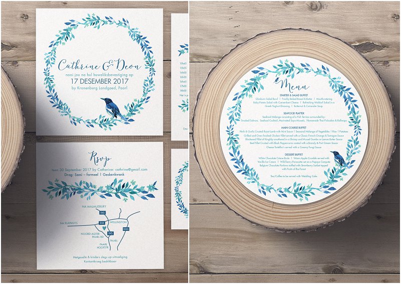 Jy kan kies en keur tussen honderde verskillende trou uitnodigings, spyskaarte, naam kaartjies en vele ander items. Indien jy opsoek is na skryfbehoefte ontwerpers wat Mooi Troues aanbeveel, Klik hier om ons Trougids te besoek.