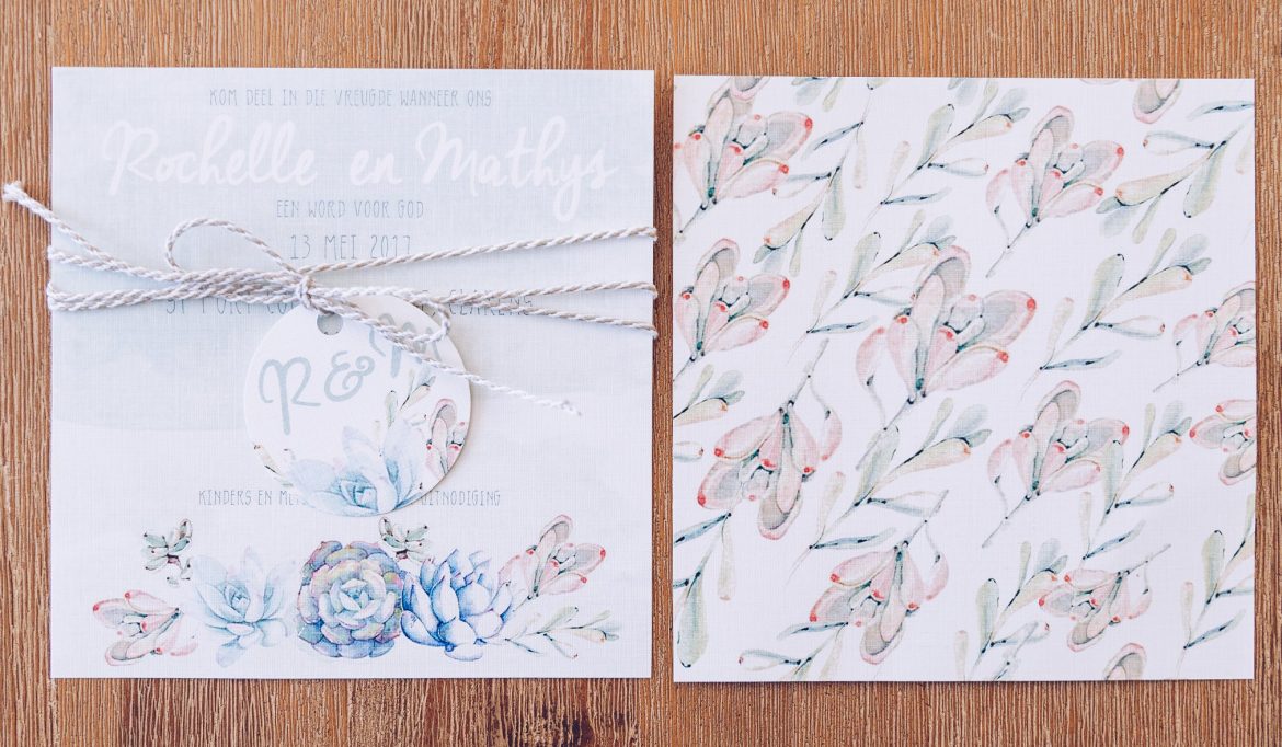 Woestynroos is ‘n plant wat gewoonlik in die Karoo area groei en kan in meeste weer omstandighede oorleef. Something Gold het hierdie plant en ander vetplante as inspirasie gebruik vir hierdie oulike uitnodiging wat sy ontwerp het. Die waterverf illustrasie van die Woestynroos is pragtig en gee ook ‘n baie mooi sagte gevoel aan die uitdaging. Die uitnodiging is perfek vir ‘n paartjie wat anders wil wees en bietjie wil wegbreek van die gewone roos tendens en opsoek is na iets wat nogsteeds mooi is, maar uniek. Dit sal fantasties by enige tipe troue werk, van informeel tot formeel.