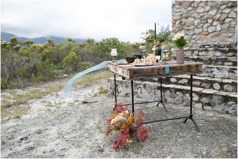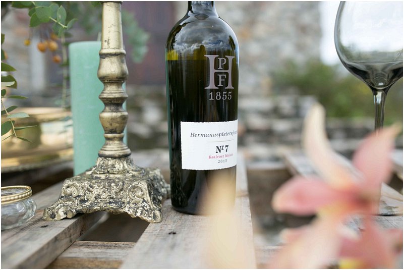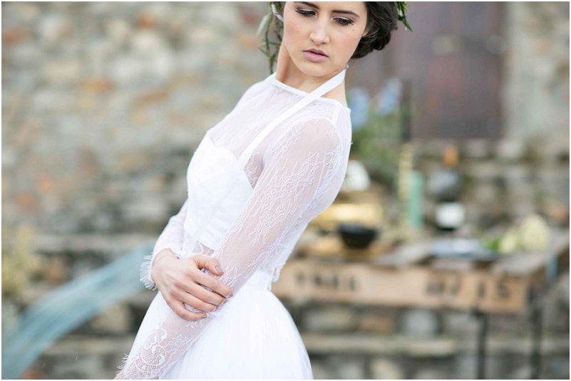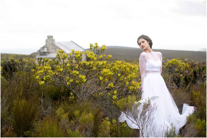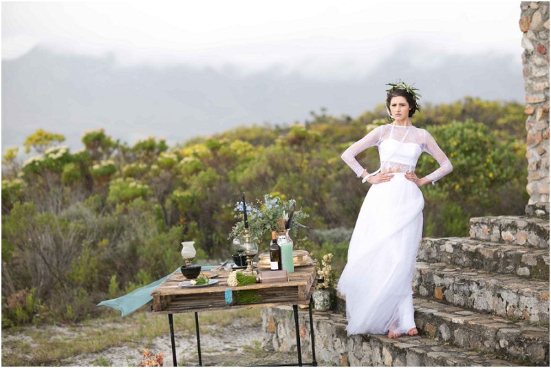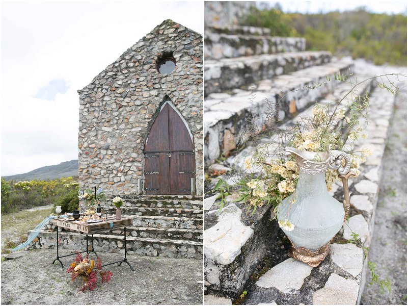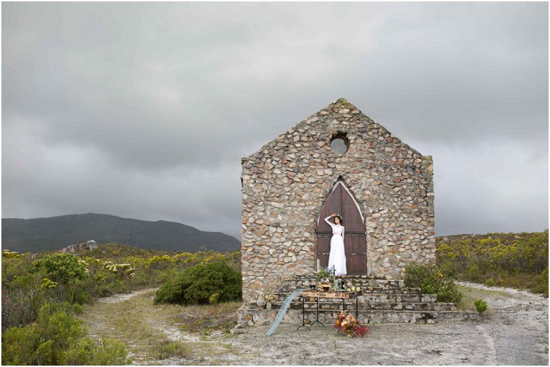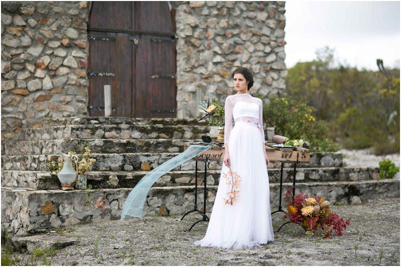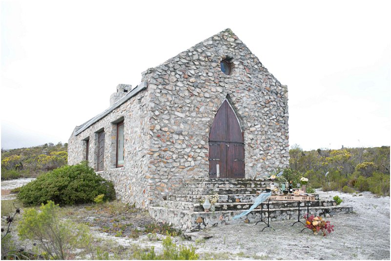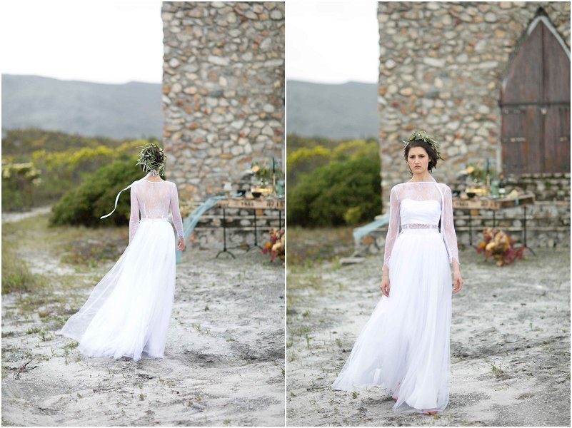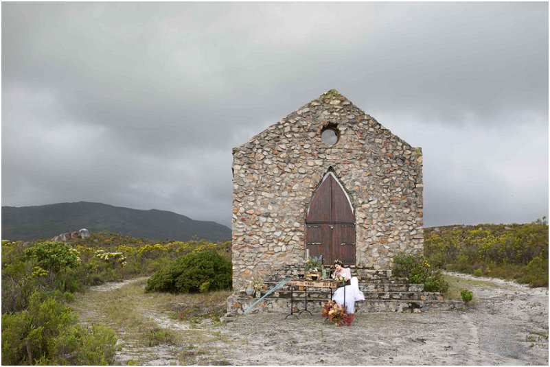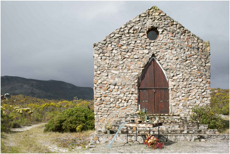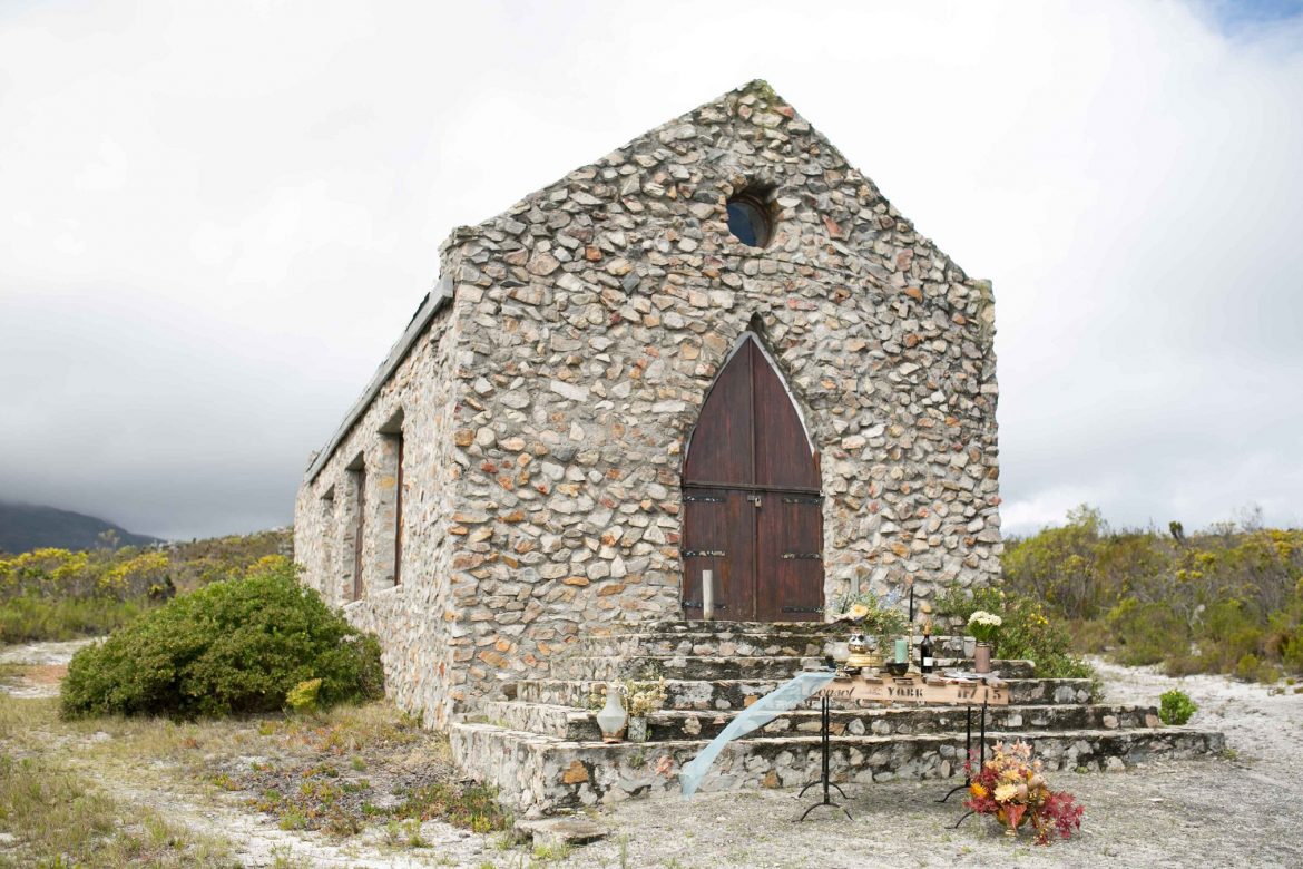 Die ou klip kapel, nou ‘n kuns studio, op die Hamilton Russell wynplaas, staan hoog bo die vallei uit. So ook die bruid wat wag vir haar bruidegom – onmisbaar deel van die landskap vol skoonheid – wag in haar Lubellos® ontwerp van Chantilly kant, Milano satyn en polyster tulle. Die bruid se juwele is diamante en roos goud – die kenmerkende edelgesteentes van Suid-Afrika en vervaardig deur die kunssinnige oog van Marion Rehwinkel. Die tafels van eenvoudige palette en natuurlike kleure – verskuif die aandag na die inheemse blomme van die Weskaap en herinner ons, dat die huwelik ‘n heilige geleentheid is en dat Godgegewe skoonheid onbetaalbaar duur vertoon.
