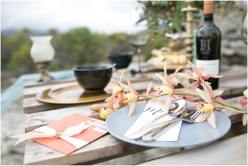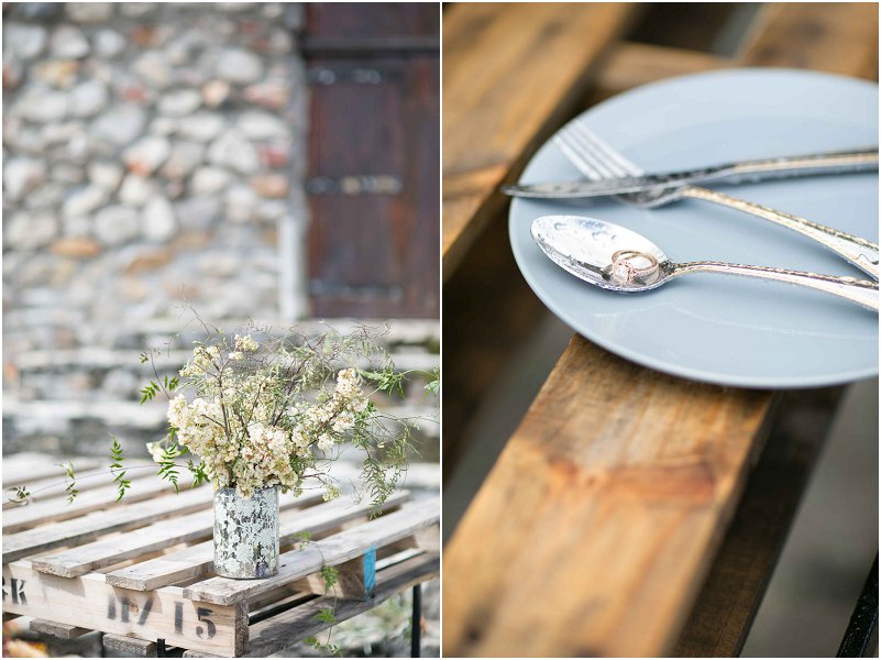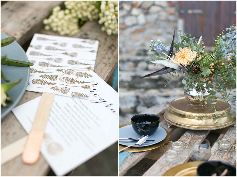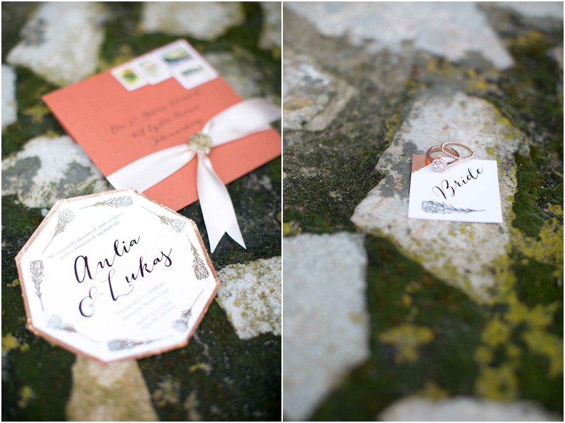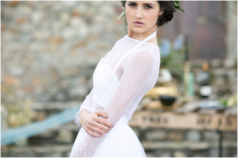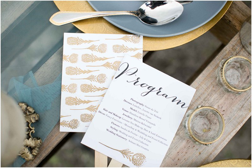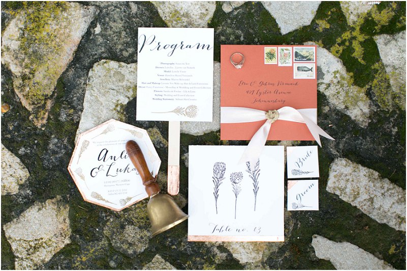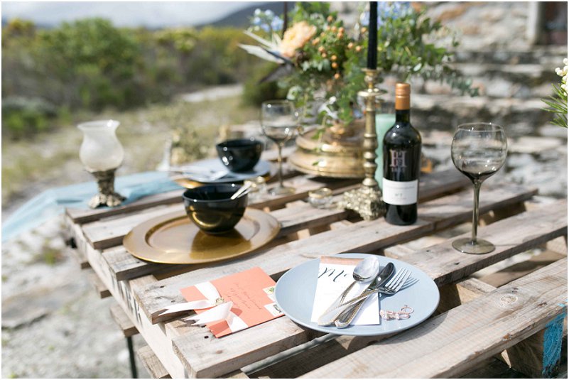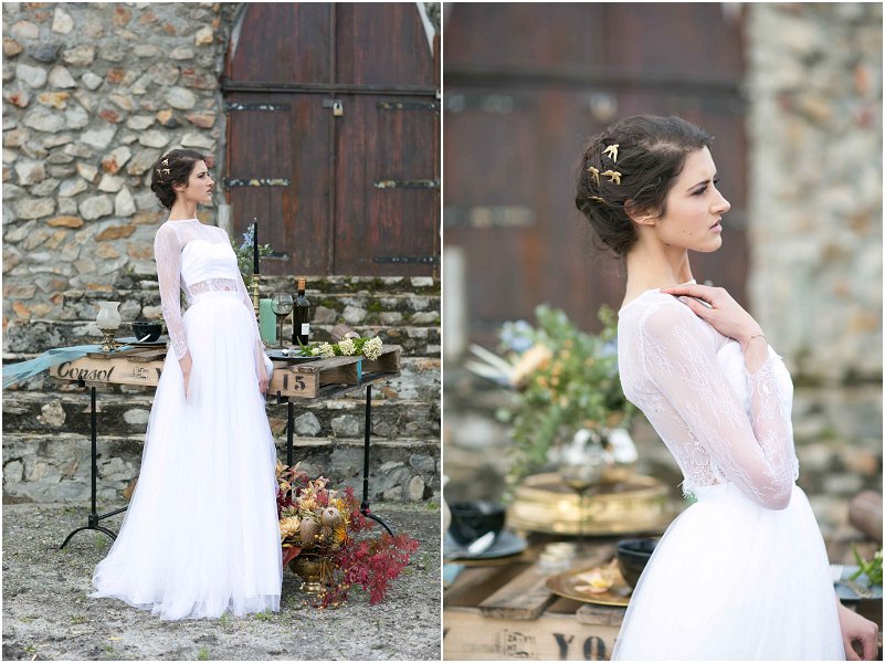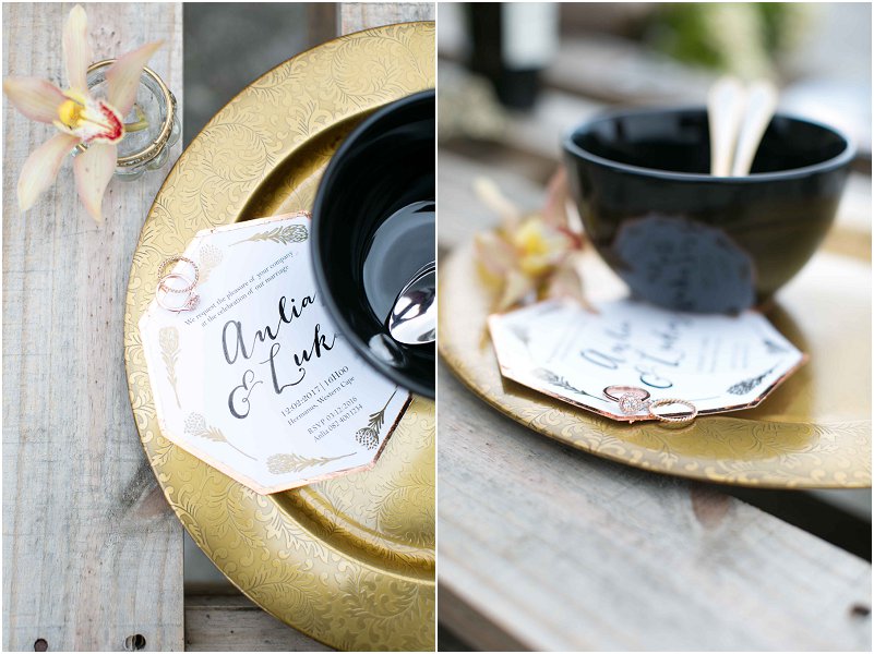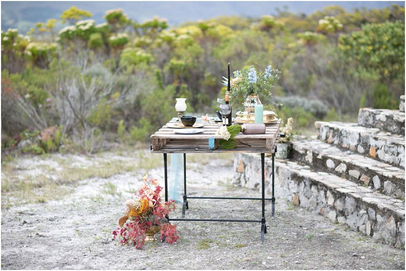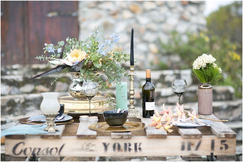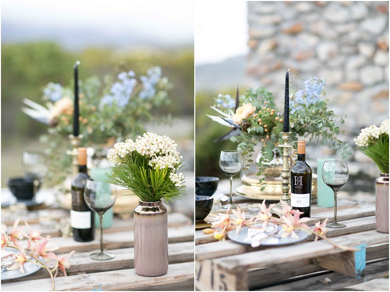 Die ou klip kapel, nou ‘n kuns studio, op die Hamilton Russell wynplaas, staan hoog bo die vallei uit. So ook die bruid wat wag vir haar bruidegom – onmisbaar deel van die landskap vol skoonheid – wag in haar Lubellos® ontwerp van Chantilly kant, Milano satyn en polyster tulle. Die bruid se juwele is diamante en roos goud – die kenmerkende edelgesteentes van Suid-Afrika en vervaardig deur die kunssinnige oog van Marion Rehwinkel. Die tafels van eenvoudige palette en natuurlike kleure – verskuif die aandag na die inheemse blomme van die Weskaap en herinner ons, dat die huwelik ‘n heilige geleentheid is en dat Godgegewe skoonheid onbetaalbaar duur vertoon.