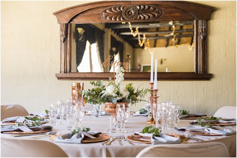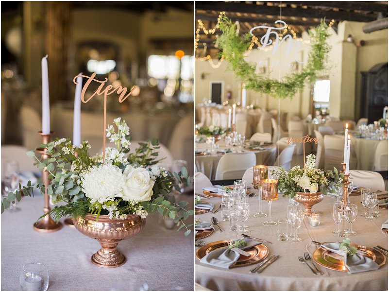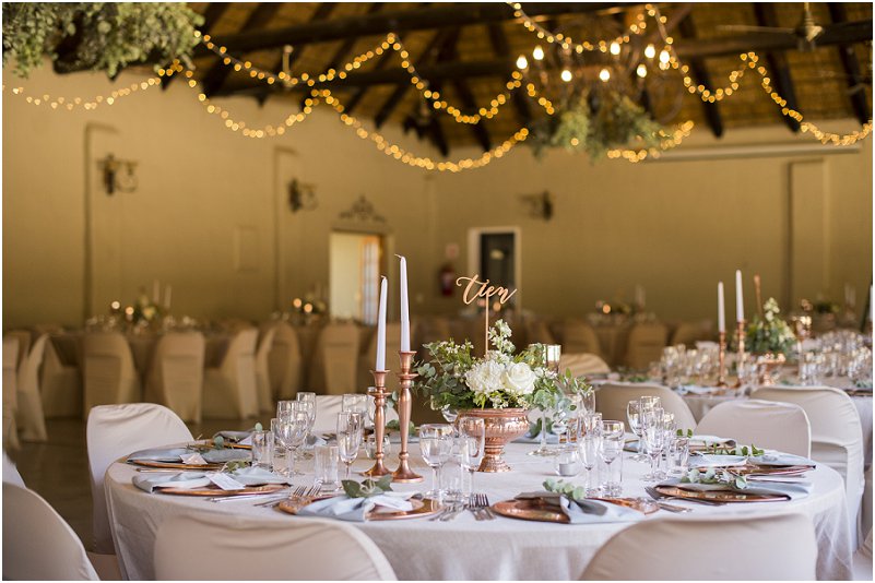 Die Noord Wes provinsie spog met Thaba Tshwene Game Lodge wat ‘n mooi plek is vir paartjies om eg aanmekaar te sweer voor al hul geliefdes. Mariska het die venue se dekor met Rose Goud en Eukaliptus laat versier en die kleure het Thaba Tshwene Game Lodge se venue mooi komplimenteer.