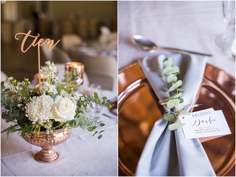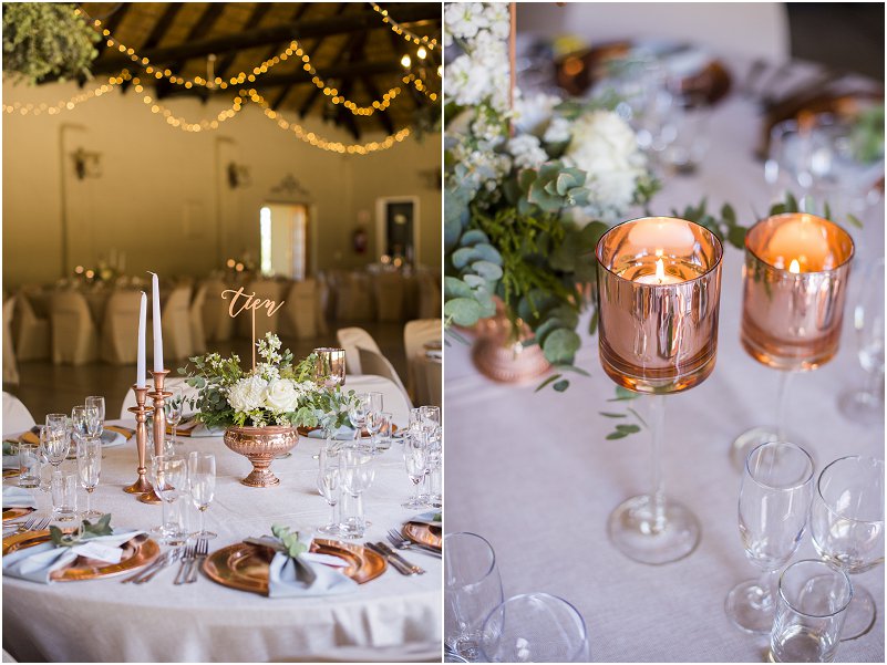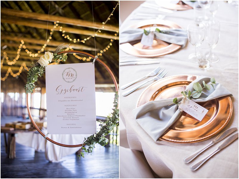 Meeste van my inspirasie het ek op Pinterest gekry. Ek is mal oor Rose Goud en Eukaliptus en die kleure het net vir my wonderlik saam gewerk. Ek en Thys was beide mal oor die Wildsplaas gevoel wat die venue geskep het. Dit was ook vir ons lekker om die hele naweek saam ons familie en vriende te kon spandeer weg van alles af.