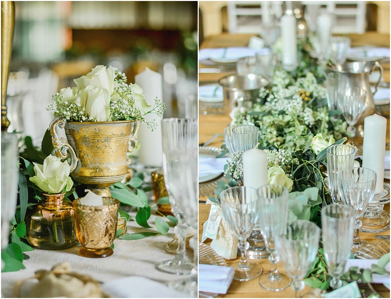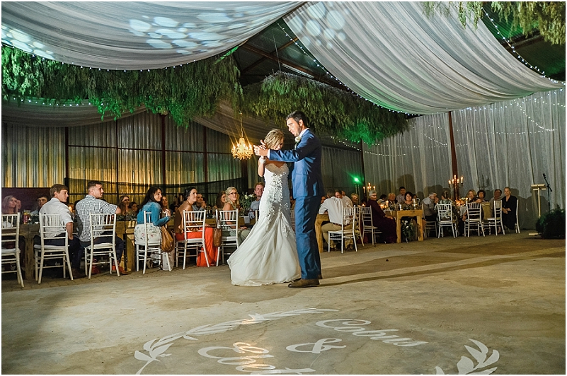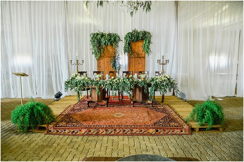 Die styl van ons troue was ‘n natuurlik, Woud-agtige sprokie maar tog plaastroue. Ek, Ebet, is mal oor die groen van Bloekomboom blare en waar ek groot geword het is daar ongelooflik baie bloekombome. Die bloekombome het my inspireer vir my troue en dit het ons ook gehelp om te spaar op die onkostes van blomme. Ons het op my pa se plaas in ‘n groot skuur getrou. My pa het tien jaar terug die skuur net as ‘n afdak gebou met die idee dat hy dit eendag sal toebou. Ek het reeds van toe af vir hom gesê hy moet begin om die stoor toe te bou, want ek gaan in daardie stoor trou. Uiteindelik raak ek toe verloof en die stoor word toe uiteindelik toegebou vir die groot makietie wat voorlê.