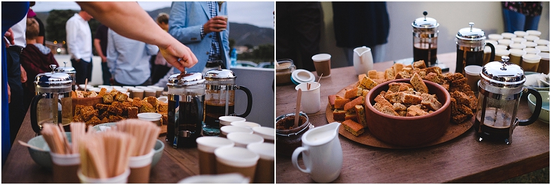 Ons het ‘n sonsopkoms seremonie op die strand gehad en middagete onthaal in die botaniese tuin. Ons het piekniek ontbyt bedien op die strand om-en-by agt uur die oggend en toe beplan om ‘n paar ure op die strand te spandeer sodat die mans kan gaan branderplank ry en die onthaal eers van twaalf uur die middag af by die botanies tuin beplan. As ek alles kom oordoen sou ek direk na die ontbyt reeds botanies tuin toe begin beweeg het en verder daar gekuier het waar mense lekker gemaklik kon sit en kuier (en ietsie drink – alkohol is mos onwettig op die strand). Die mans kon dan net weer na die branderplank ry by ons aansluit. Die onthaal het so vinnig verbygegaan, ons sou dit graag bietjie wou uitrek.