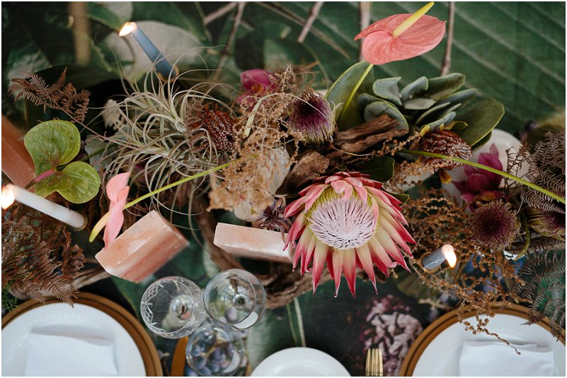 Karoo en Tropies is twee temas wat baie geliefd is onder die publiek en ook heeltemal in teenstelling is met mekaar. Die twee tema’s is gekombineer om ‘n nuwe tema te vorm genaamd tropiese karoo. Ons wou blomme en groenigheid gebruik soos “delicious monster” blare en droĂ« elemente soos lig plante om die twee tema’s oftewel areas uit te beeld en ‘n sterk konstras te vorm wat tog saamwerk op ‘n tafelrangskikking. Ons het besluit om goud en ‘n vuil pienk tesame met grys te gebruik as ‘n kleurskema omdat die kleure mooi aangesluit het by die dowwe kleure van die Karoo plante sowel as die helder groen kleure van die tropiese groenigheid.