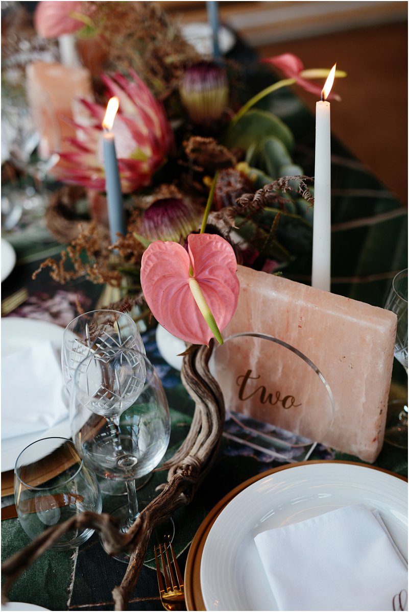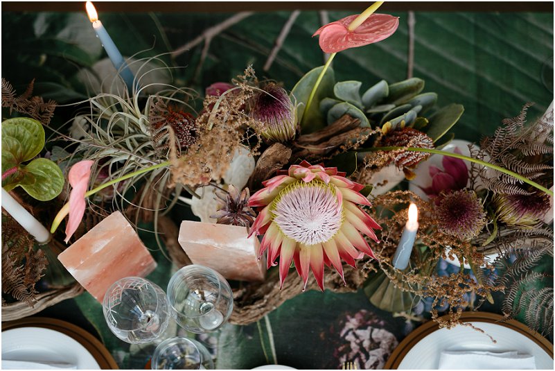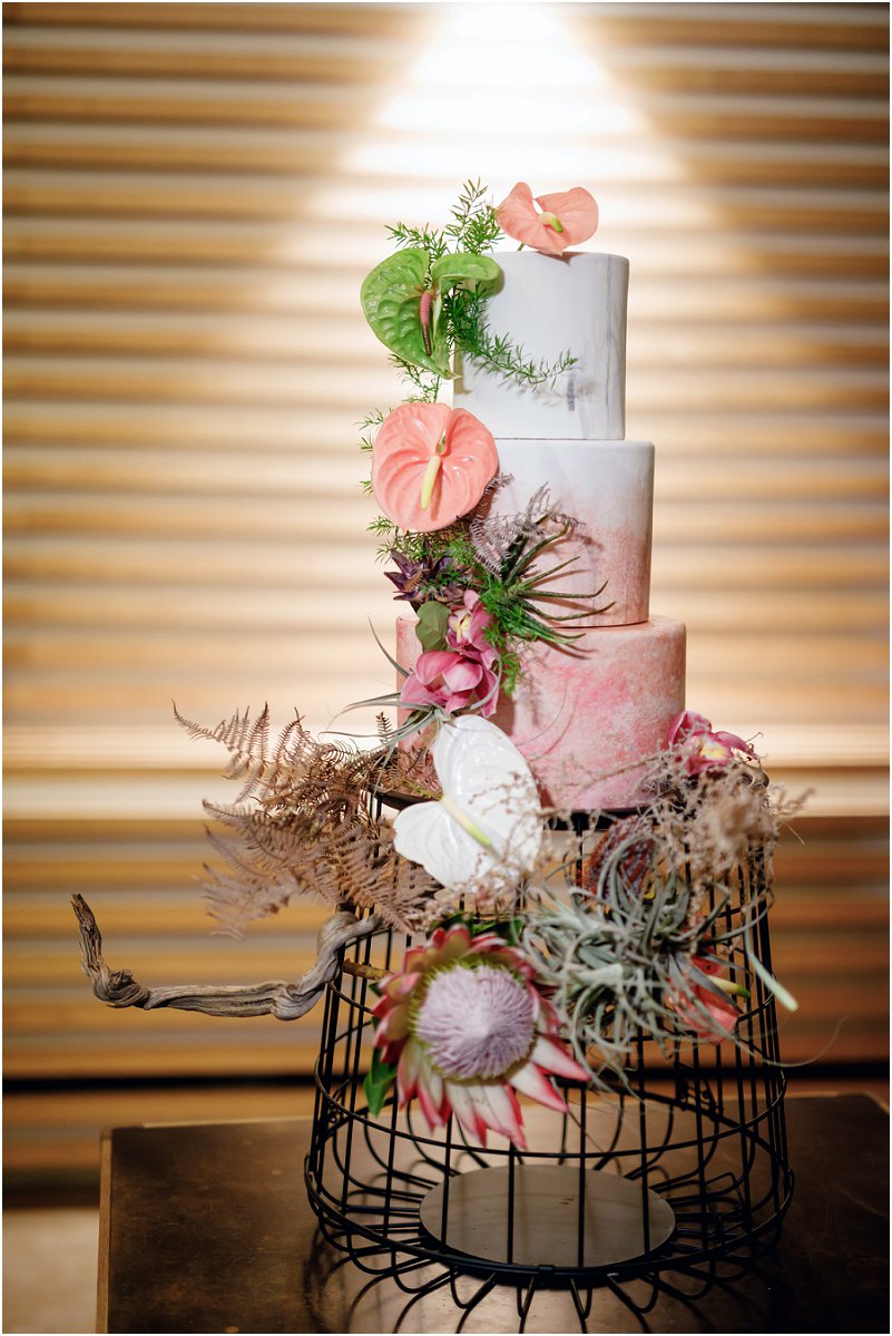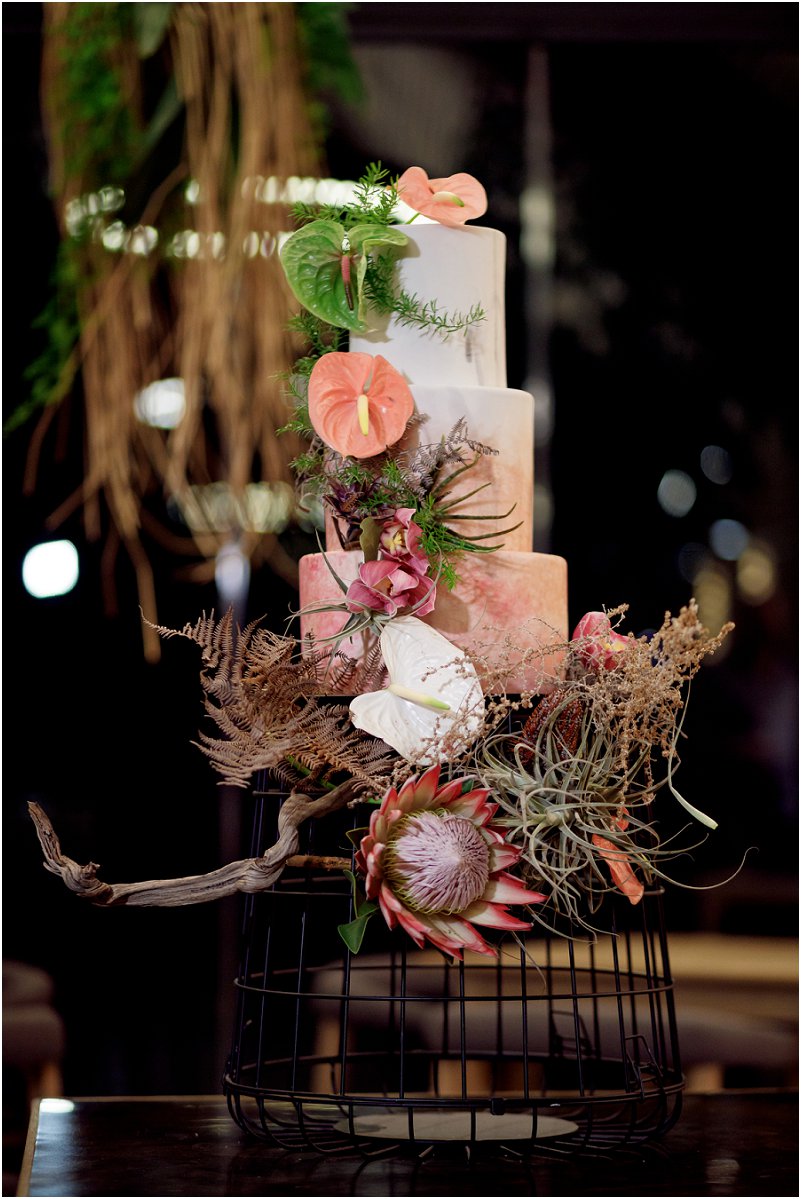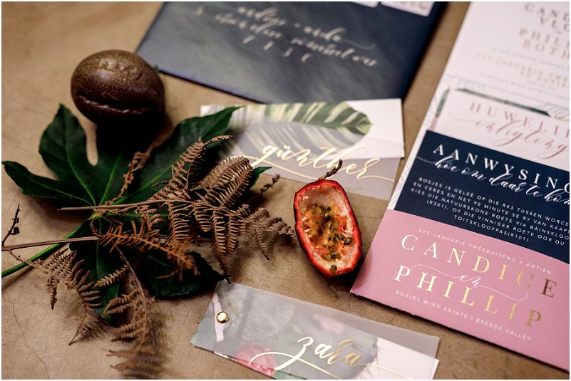 Die konsep van Tropiese Karoo. Die konsep het baie mooi saamgekom met blomme van Paradiso Flowers in Somerset-Wes en die skryfbehoeftes van Blooming Wonderful Stationary. Alles het elemente van Karoo en Tropies plante gehad. Die troukoek met die sagte pienk marmer afwerking, was voorsien deur Eila Cakes. Dekor items was verkry van verskillende verskaffers en het die konsep vreeslik mooi afgerond.