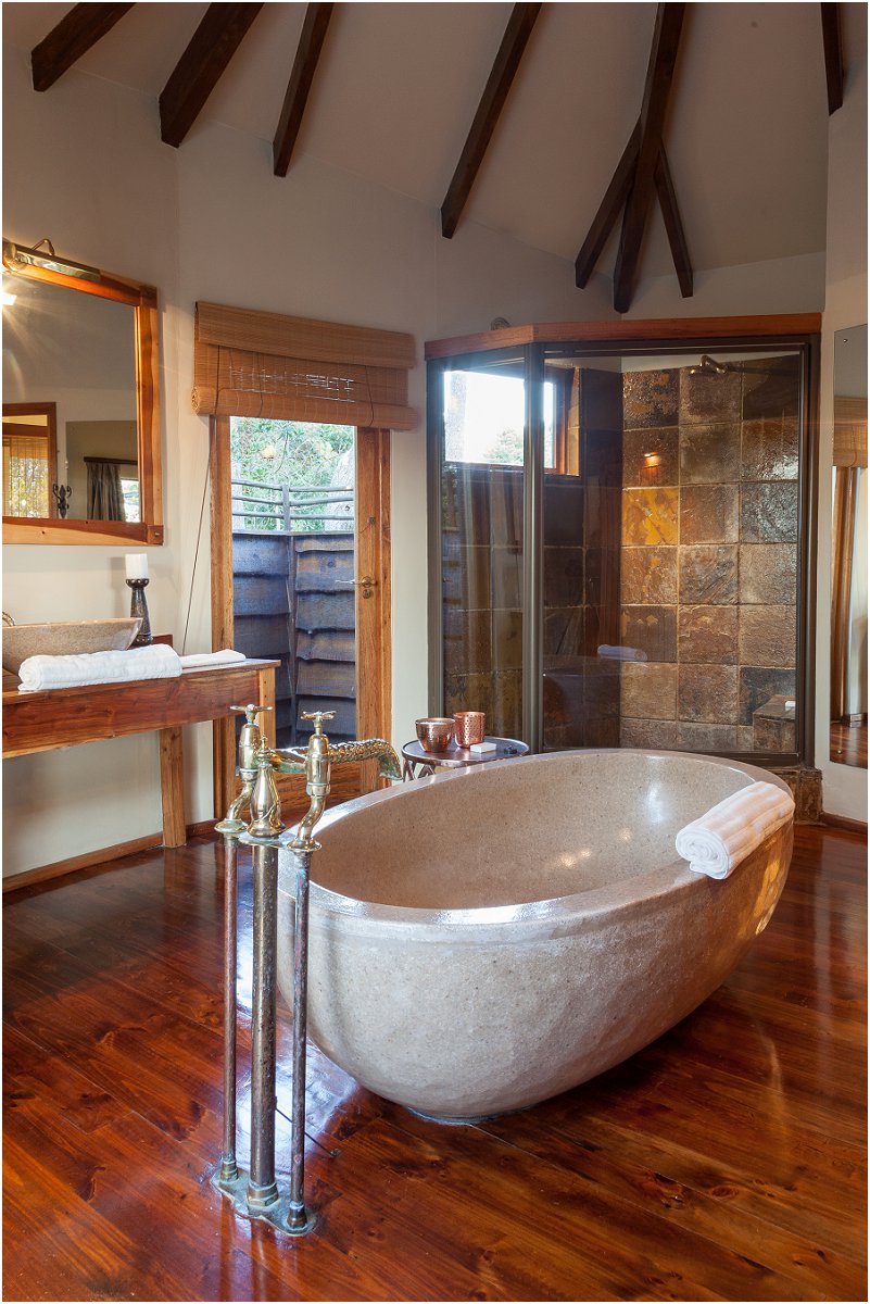 Vanuit die kamer loop jy in ‘n massiewe badkamer. Dit het ‘n losstaande bad in die middel en die mooiste koper krane wat uit die donkerbruin houtvloere opstaan oor die bad. Die gebruik van klip, glas en hout in die badkamer laat jou voel of jy in ‘n luukse boomhuis bad. Jy het ook ‘n privaat buite-stort onder die bome in die buitelig. Dit is definitief iets waarvan jy gebruik moet maak wanneer jy by Tsala Treetop Lodge kom ontspan.