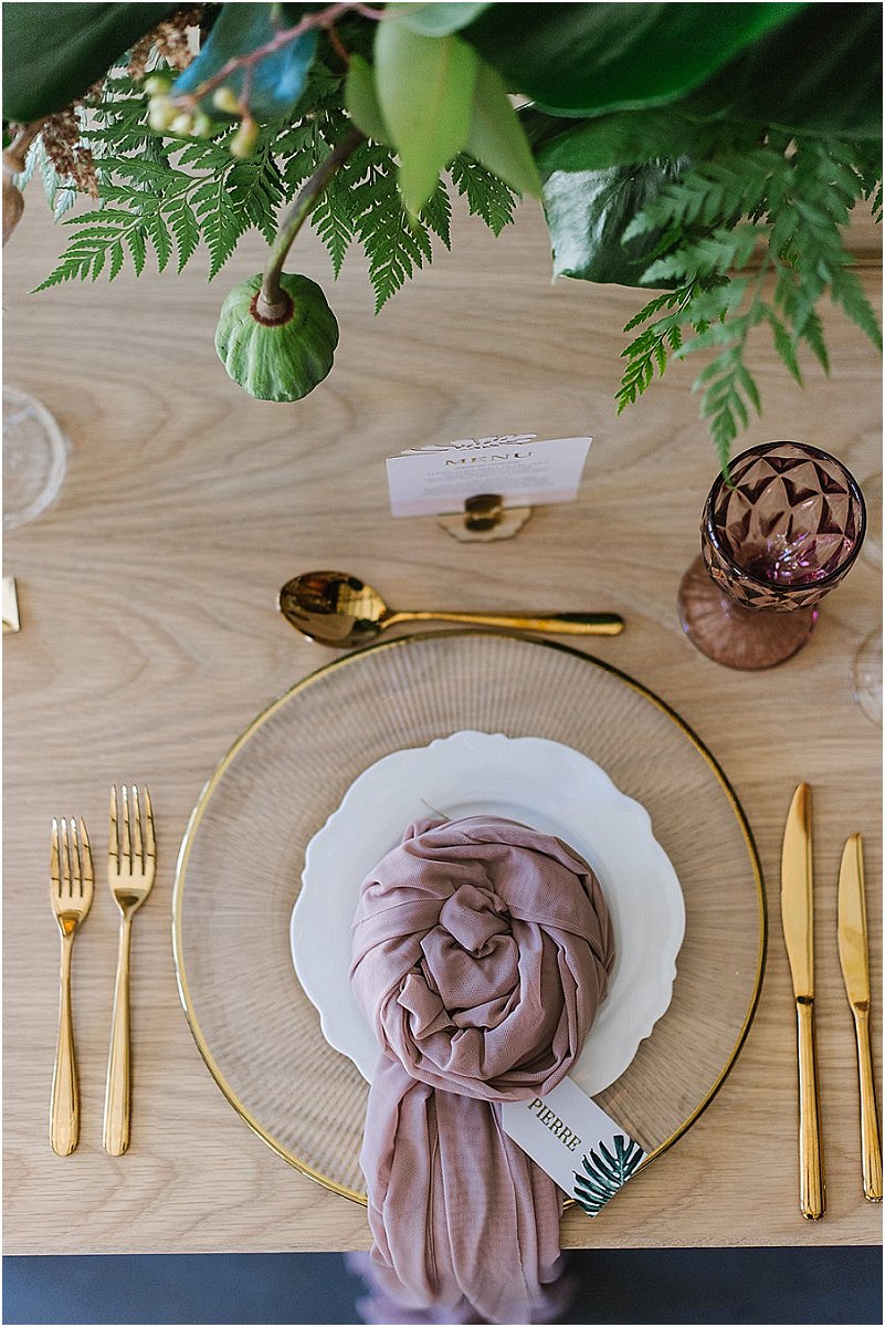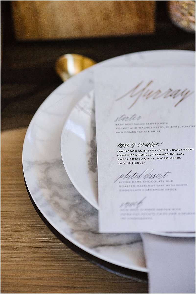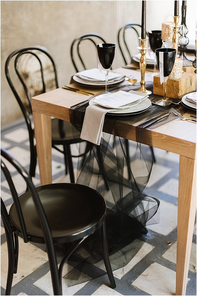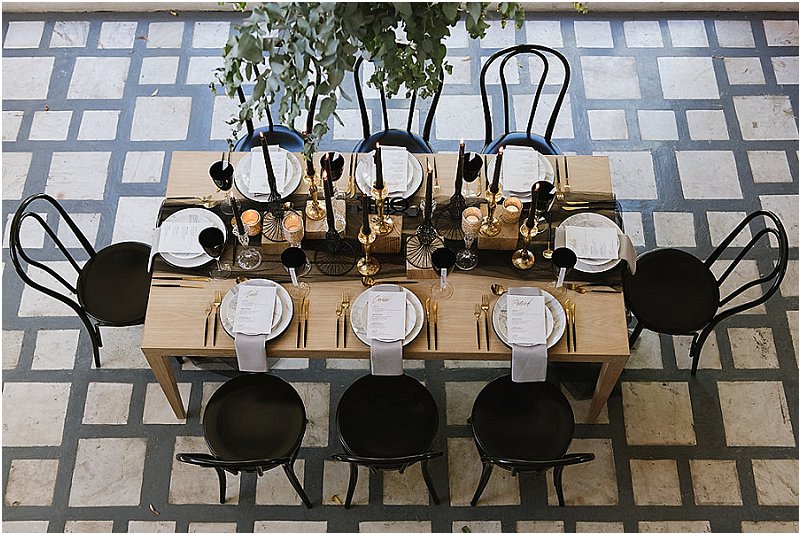 Ons moet natuurlik ook praat oor die tydlose en mooi dekor wat gewys word in hierdie gestileerde fotosessie. Die gebruik van swart stoele en swart bykomstighede gekombineerd met goud lyk modern en meer gehard teenoor die gehele gebruik van neutrale kleure. Dit wys dat neutrale kleure altyd as ‘n basis gebruik kan word vir troues i.p.v. die klassieke wit. Neutrale kleure soos room lyk nie net tydloos nie, maar ook sag en natuurlik sonder om die redelike algemene groen elemente te gebruik. Ons hoop julle geniet die fotosessie net so baie soos ons – definitief ‘n vars briesie!