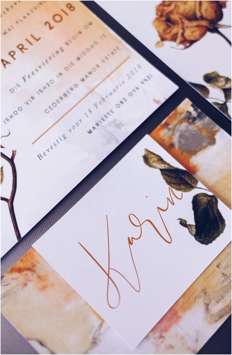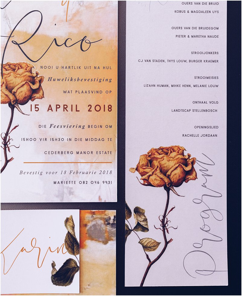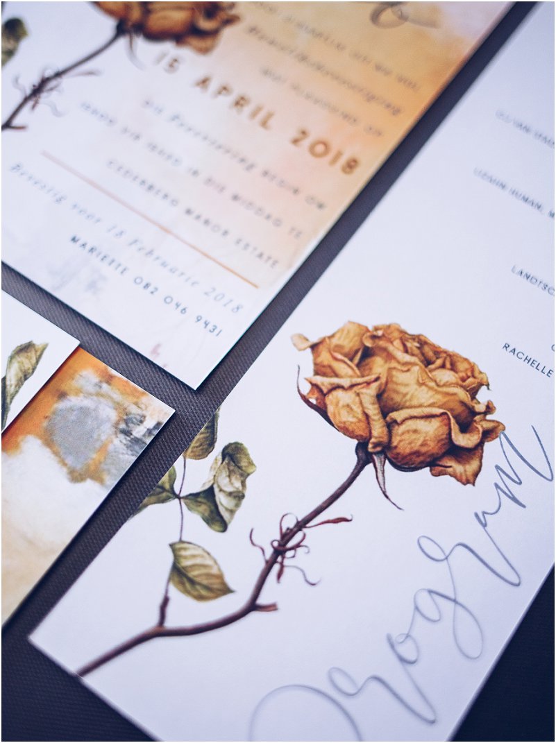 Herfs is hier en daar is iets baie spesiaal daaraan om in die Herfs seisoen te trou. Alles is sulke diep kleure en die dooie blare, is die begin van nuwe lewe. Die talentvolle Fleur Design Studio het die oulike uitgedroogde roos skryfbehoeftes ontwerp om jou nog meer te laat verlang na ‘n lekker Herfs troue. Hierdie skryfbehoefte stel is perfek vir die moderne paartjie wat opsoek is na iets elegant. Die skryfbehoefte stel sal jou gaste presies laat verstaan dat jou troue in Herfs sal plaasvind en hulle opgewonde maak om te sien wat jy in die mou het vir die troudag. Hierdie skryfbehoefte stel is perfek vir middag en aand troues en kan beide informeel en formeel gebruik word. Die gebruik van verskillende skrif soorte maak dit baie veelsydig.