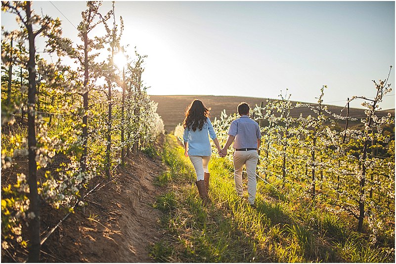 Ons albei is baie lief vir die natuur en buitelewe. Tertius was deel van die gekonkel en het gesorg vir ‘n paar pragtige informele foto’s op die wildsplaas die dag van die verlowing. Ons is bevoorreg om vriende te hê met ‘n pragtige wyn-en-vrugteplaas in Stellenbosch, waar die formele fotosessie plaasgevind het. Die tydsberekening was perfek met die bloeisels aan die pruimbome en die groen wingerde. Ek het dit goed gedink om haar gedurende die fotosessie weer te verras met ‘n romantiese piekniek. Ons was ook baie gelukkig met die weer wat saam gespeel het.