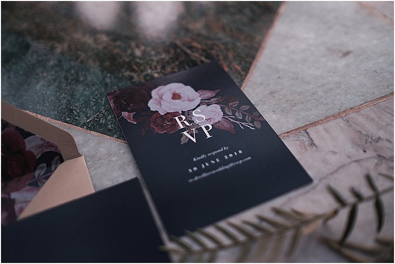Ons wou gaan vir welige, gewaagde kleure met ʼn diep Boergondie inspirasie, met ʼn paar welige pienk kleure in die Bourgondie kleurpalet ingevoeg om die dramatiese eetgerei saam met die swart tafeldoek, grys tafeldoek, goue dekor, Boergondië en donkerblou kerse op te kikker. Die welige kleure van die blomme (rooi, pienk, Boergondië en koraal peonies, anemone en rose) het die donkerblou skryfbehoeftes en donkerblou glase deur Dream Canvas Events baie goed aangevul. Die eiervrug-kleurige servette wat met ʼn knoop ontwerp bygevoeg is, gee dit ʼn ryk en formele gevoel aan die tafel – wat perfek is vir ʼn plek soos Shepstone Gardens. Dit was ʼn anders en meer kreatiewe aanpak op die gewone Boergondië, donkerblou en goue winterstyl wat baie populêr is op die oomblik.