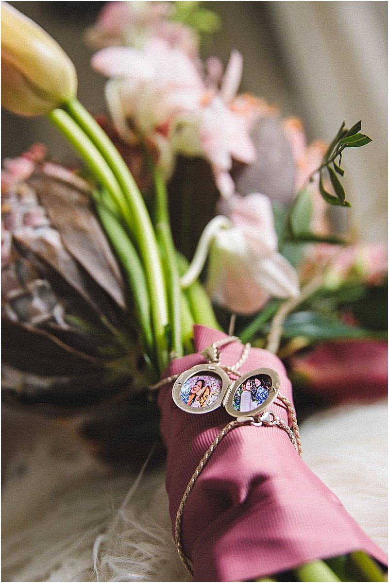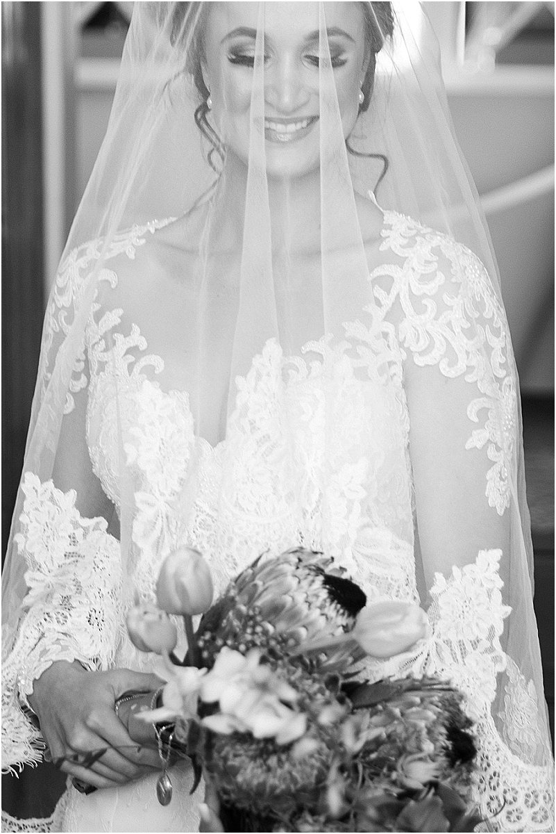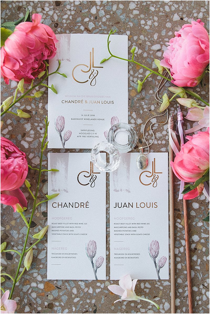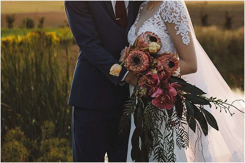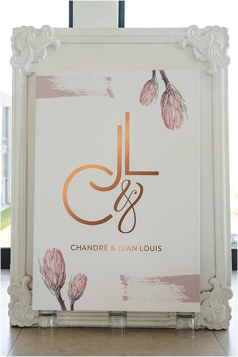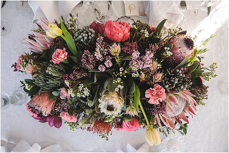 Vanaf die begin was die prentjie ʼn elegante verhouding. Ek (Chandré) wou nie so voorspelbaar wees deur rose te gebruik nie. ʼn Protea is my gunsteling blom en dit moes geïnkorporeer word op een of ander manier. Ons het goed gedink saam Celeste oor sleutelwoorde wat ons wou assosieer met die troudag. Woorde soos romanties, klassiek, ryk, en verfyn was wat meeste uitgestaan het.