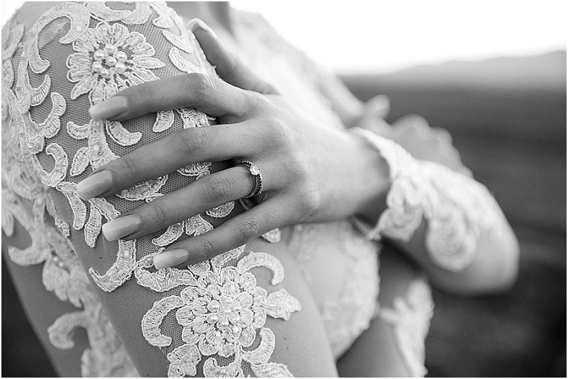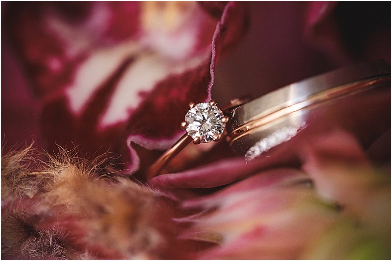 Albei ons ringe is deur Viljoen Juweliers in Worcester ontwerp. Juan Louis het hulle gehelp met die ontwerp van my verloofring. My verloofring is ʼn fyn roosgoud pand met ʼn Solitêre Diamant in ʼn Protea kader. Wat die protea setting spesiaal maak, is dat ek en my ma lank voor hy my gevra het om te trou reeds beplan het om Proteas as my hoof blom op my troudag te maak, sonder dat hy enige idee gehad het!