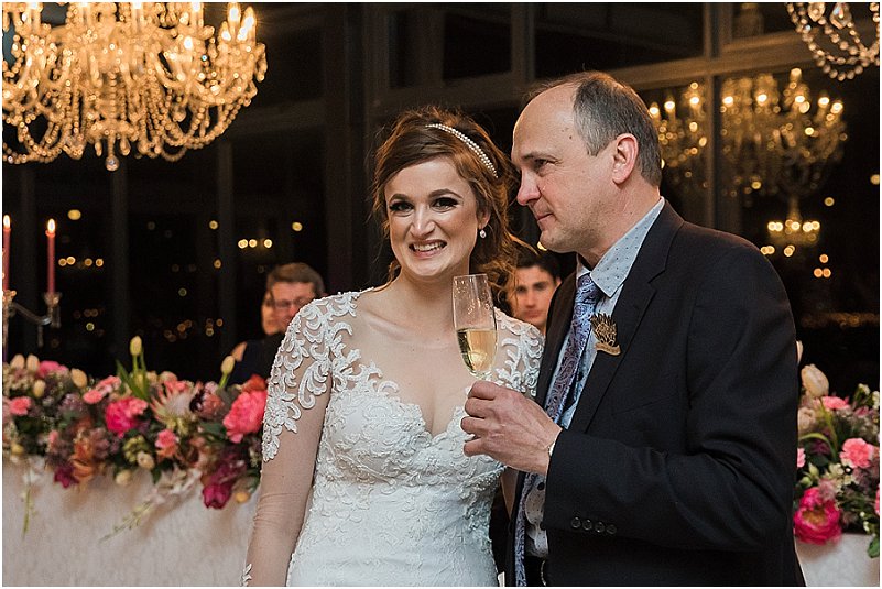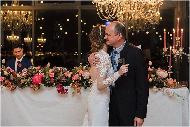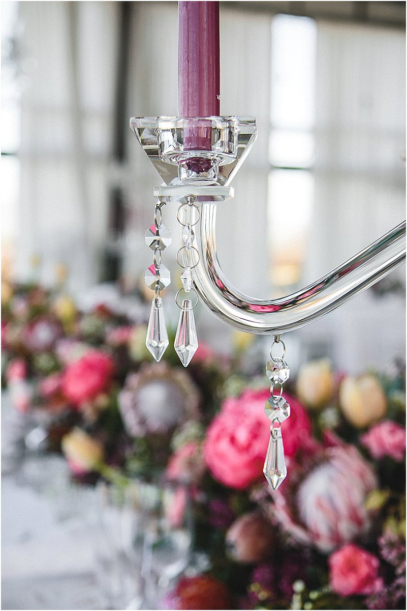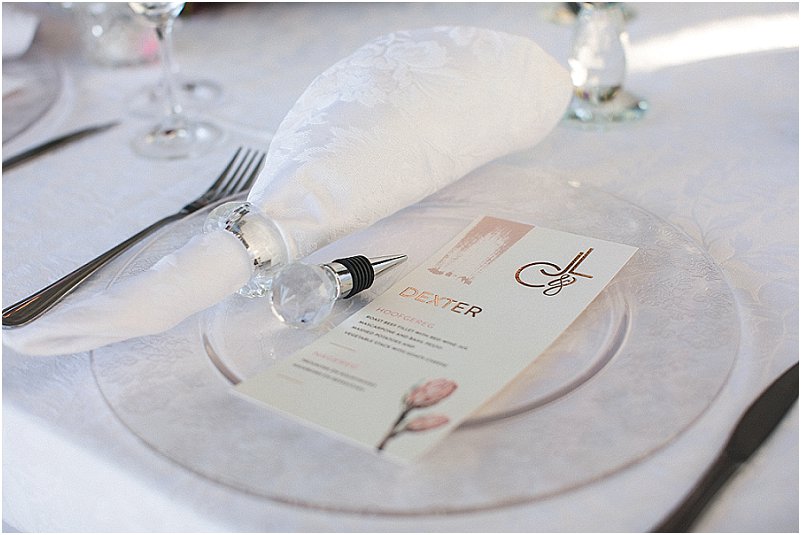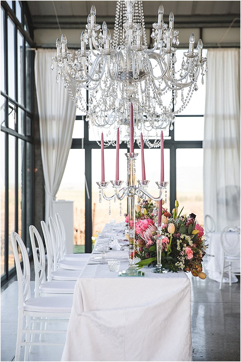Die inkorporering van kristal afwerking op skerp wit Damast geborduurde linne het die perfekte elegante agtergrond geskep vir die skakerings van pienk blommekas-lopers wat in die middel van gaste tafels geplaas was. Kristal “trinketbakke” en kristal-bottelstoppers was ons geskenk aan ons gaste.