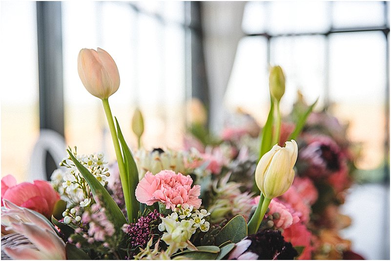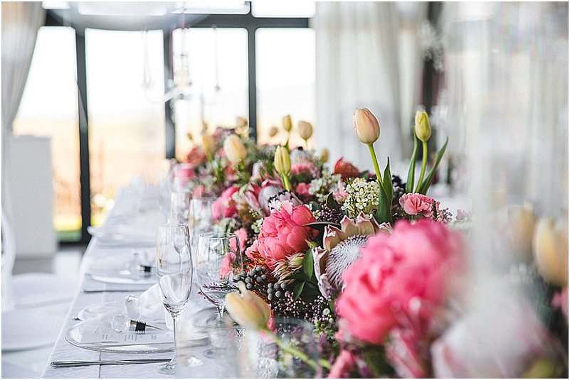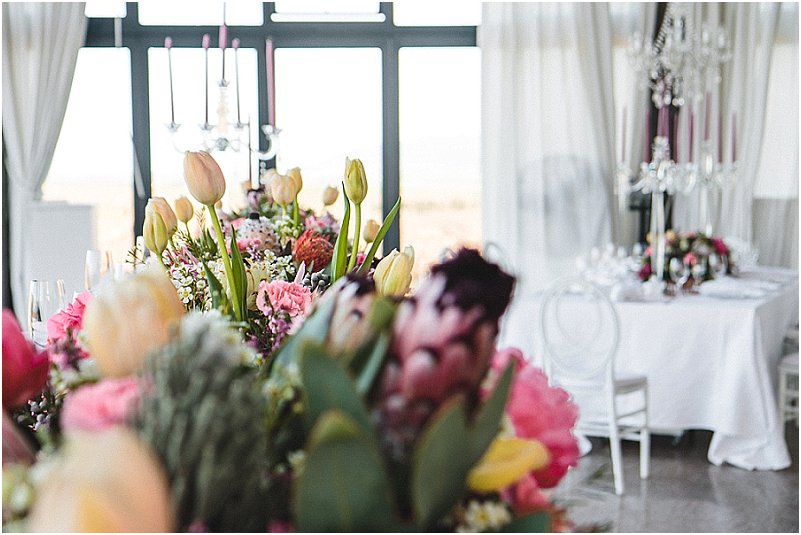 Ons blomme het gefokus op my gunsteling blom. Ons het dit wel gebalanseer met “frillerige” blomme om sagtheid en tekstuur te bevorder. Peontjies, Angeliere, Skaamblom, Cymbidiums, Tulpe en Geraldton Wax wat op ʼn “elektriese wyse” gebruik was, het opwinding en belangstelling geskep. Elke rangskikking was uniek en spesiaal op hul eie manier,. Dit was welig maar nie pretensieus nie.