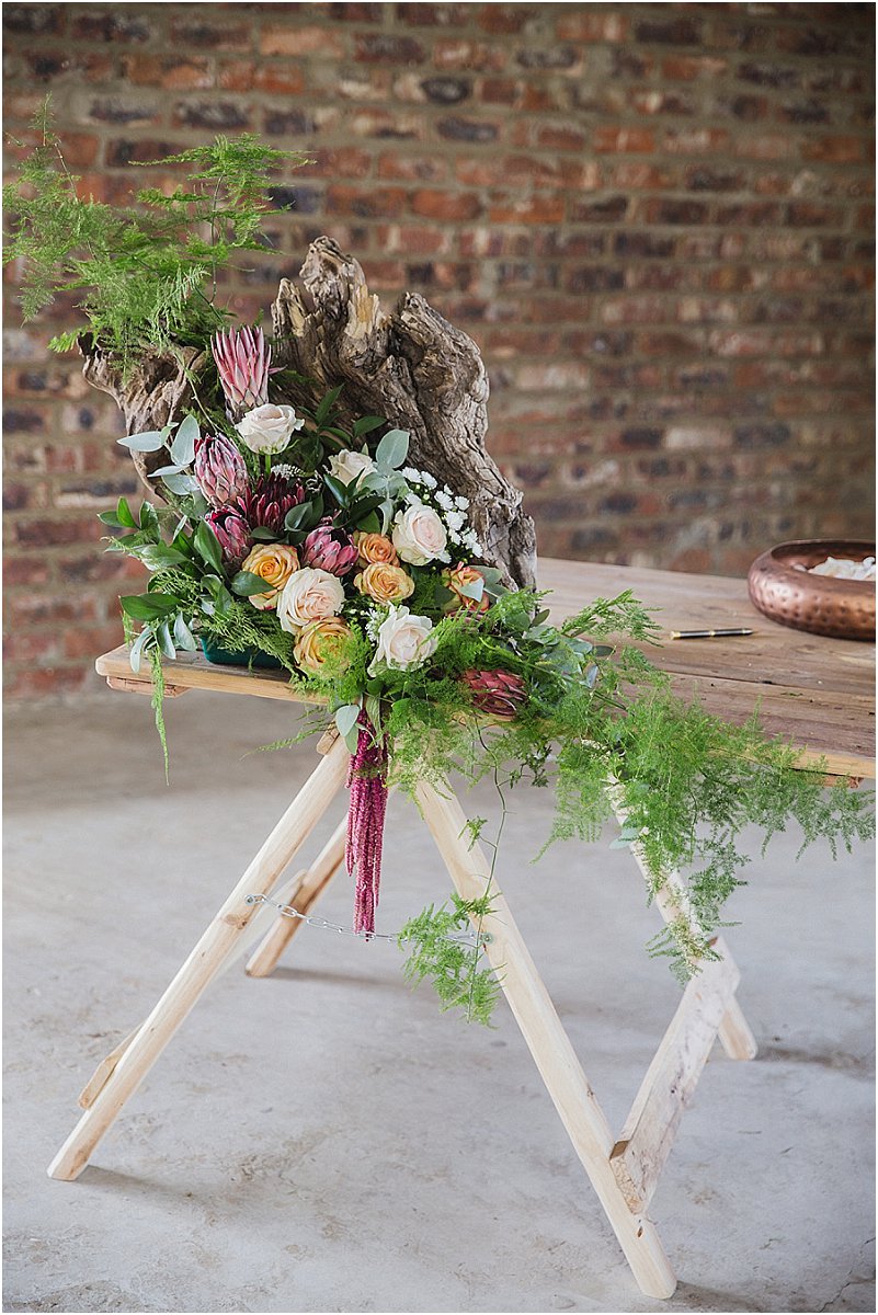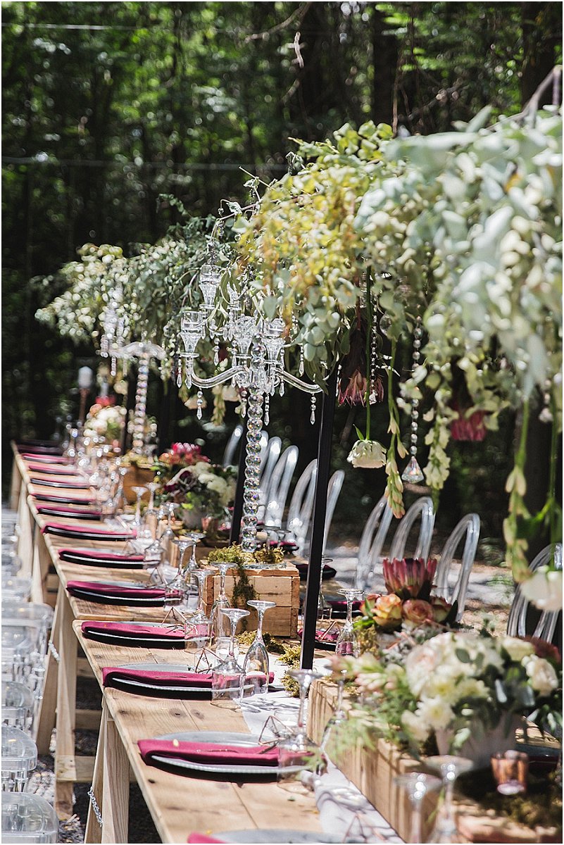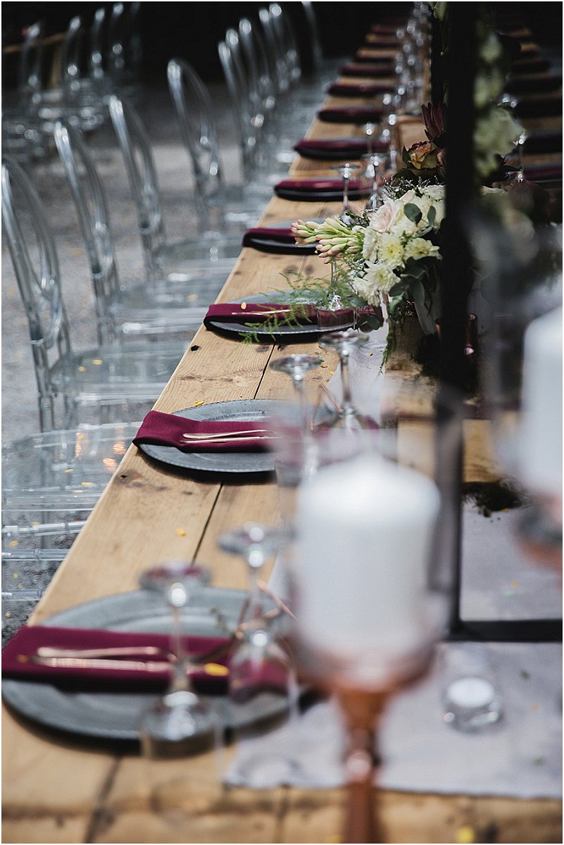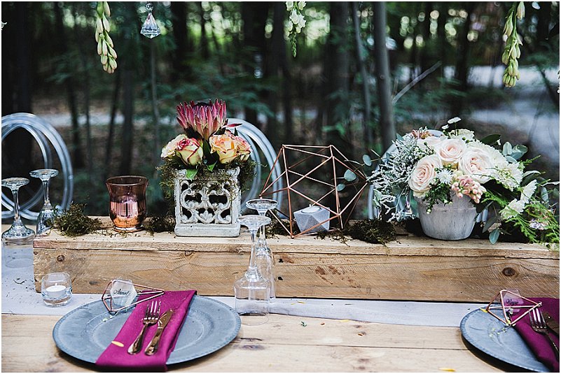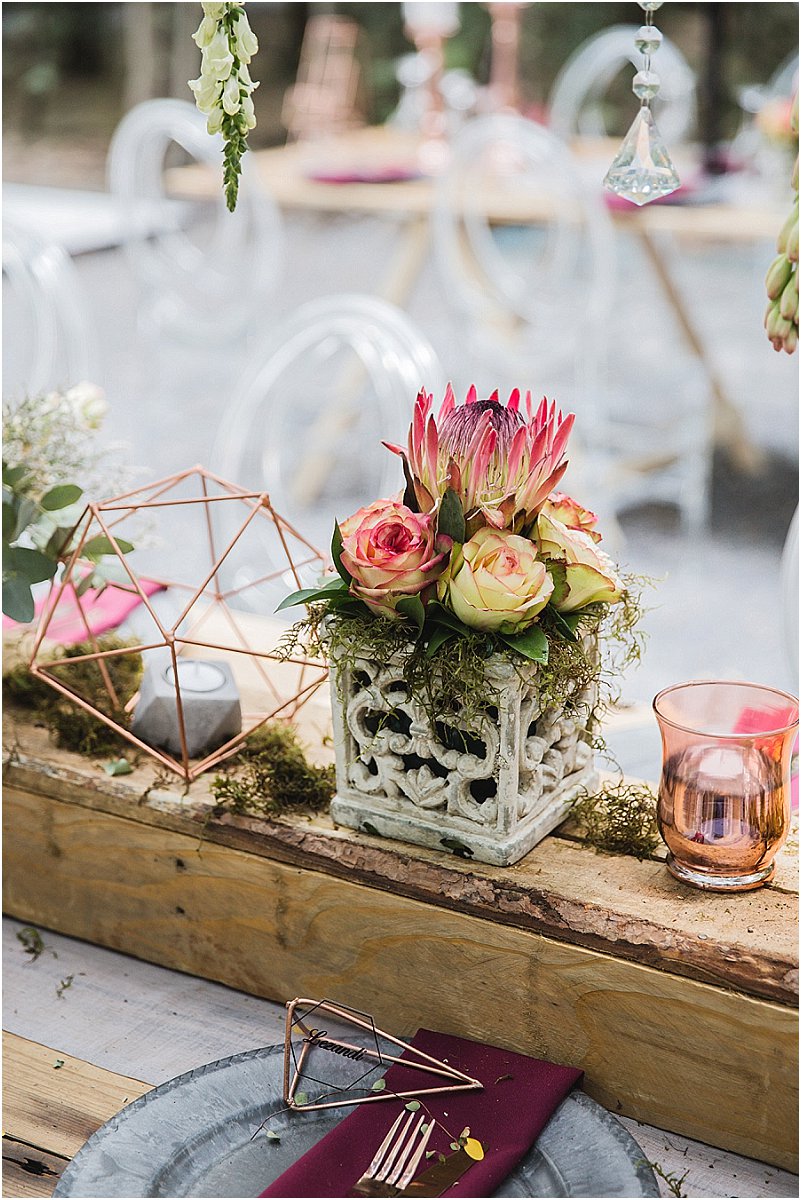 Ons dekor was so eie aan ons. Op die tafels was daar elemente van rou hout, sement, staal, helder kristalle en vrolike blomme. Die geometriese vorms het my persoonlikheid as ingenieur goed uitgebeeld en die aardse elemente RP se persoonlikheid, so af van die plaas. Ons tema was boere-chic