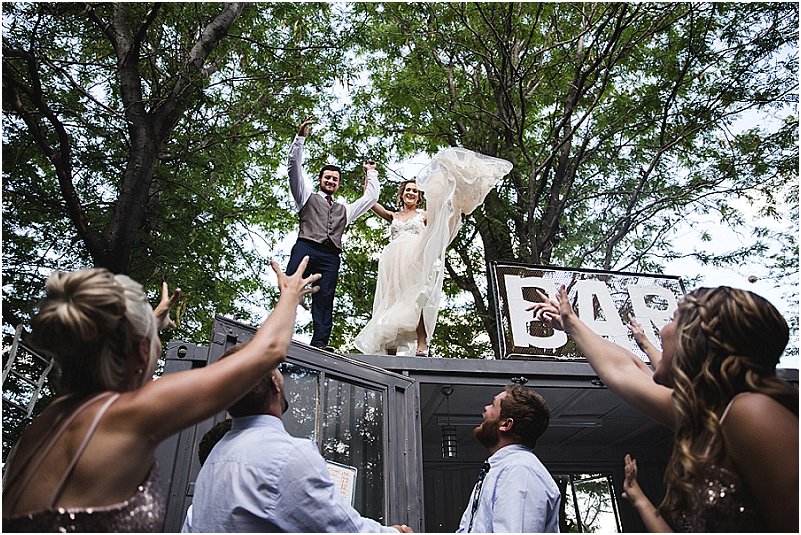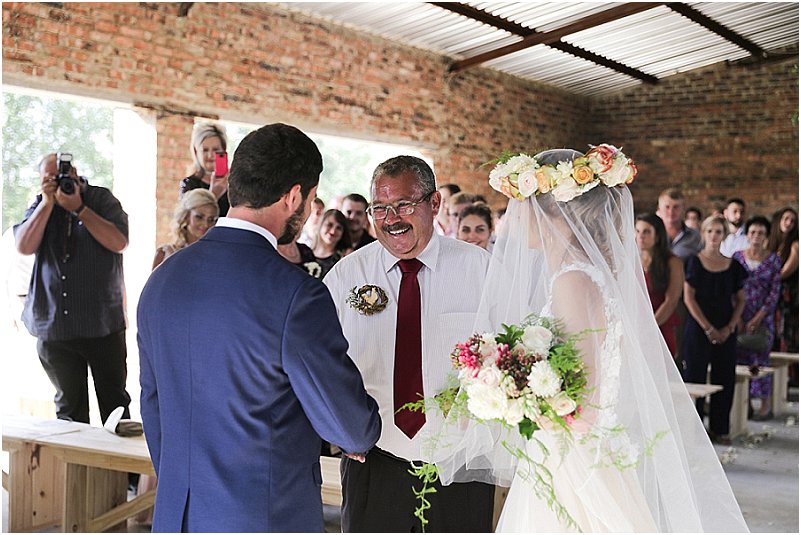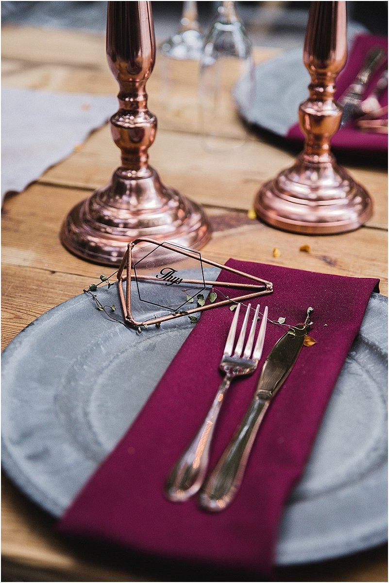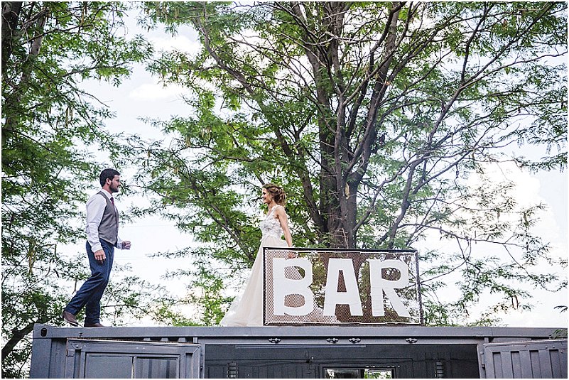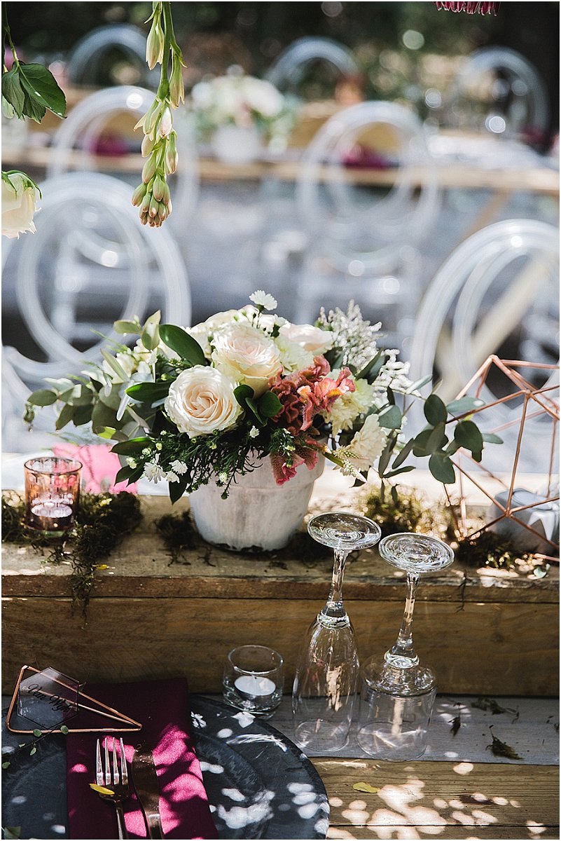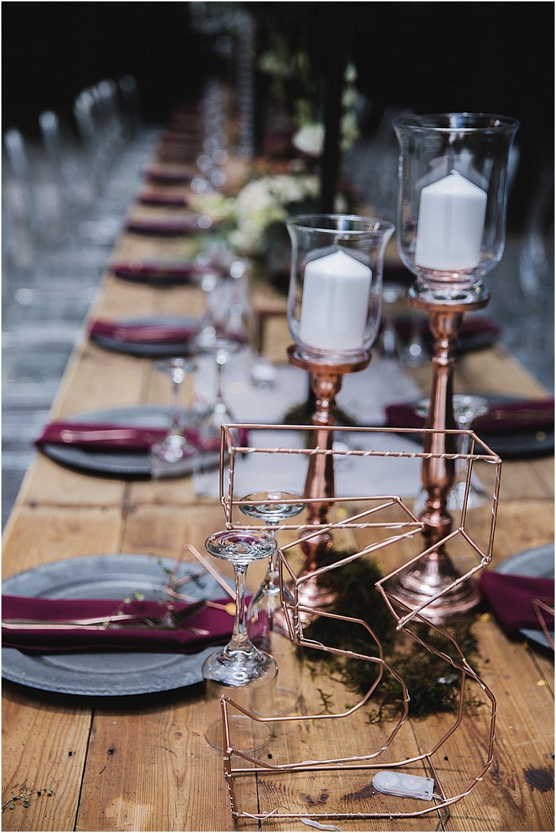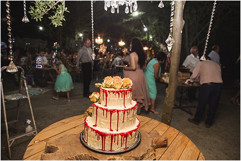 Ons dekor was so eie aan ons. Op die tafels was daar elemente van rou hout, sement, staal, helder kristalle en vrolike blomme. Die geometriese vorms het my persoonlikheid as ingenieur goed uitgebeeld en die aardse elemente RP se persoonlikheid, so af van die plaas. Ons tema was boere-chic