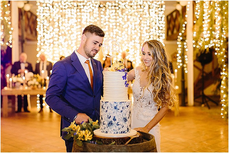 Ons keuse van dekor was dus ‘n kontras van rou houttafels, koper kandelare, baie kerse, “blouglas” en ongekompliseerde rangskikkings van blomme wat die gevoel van “ou” sjarme kan weerspieël.