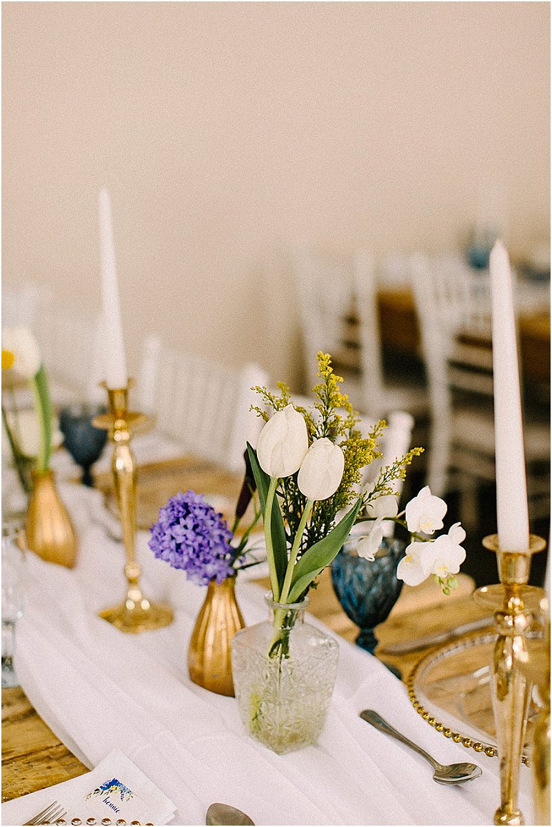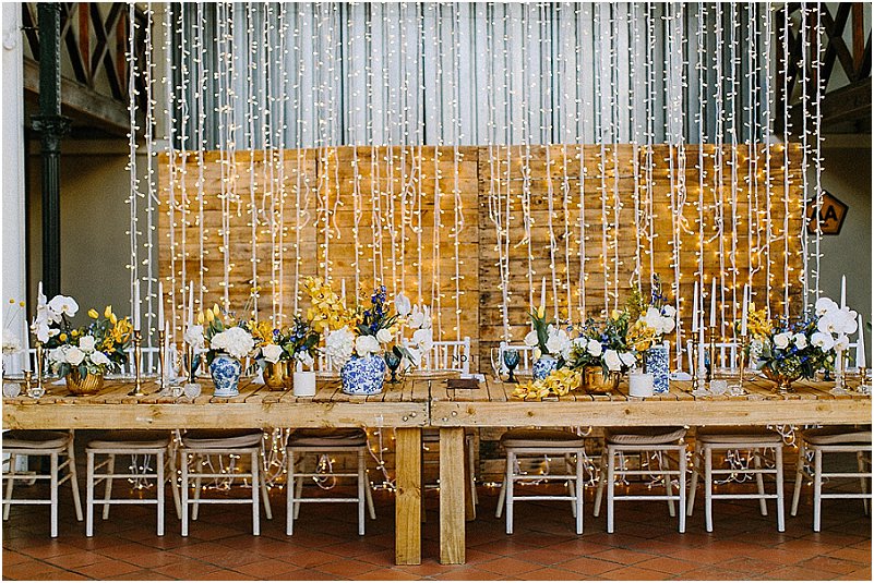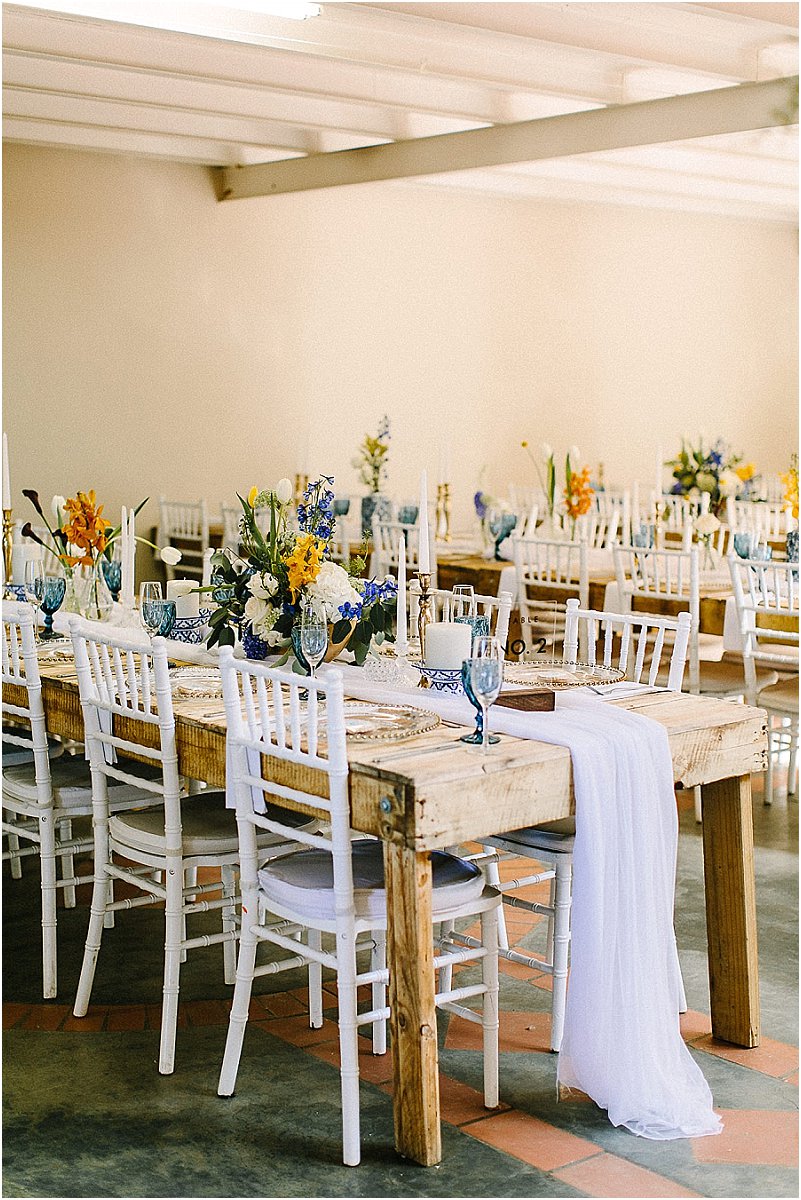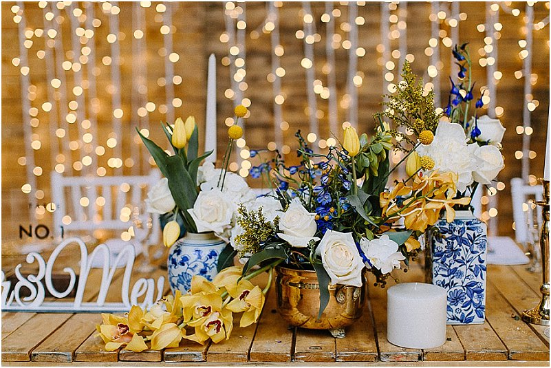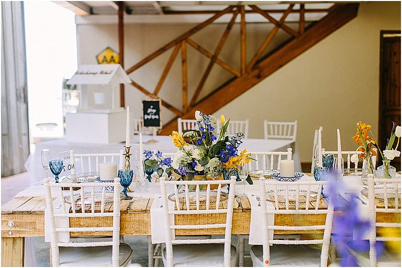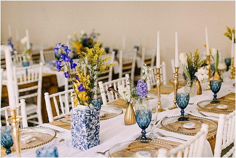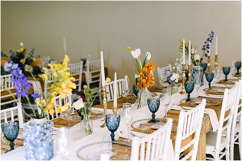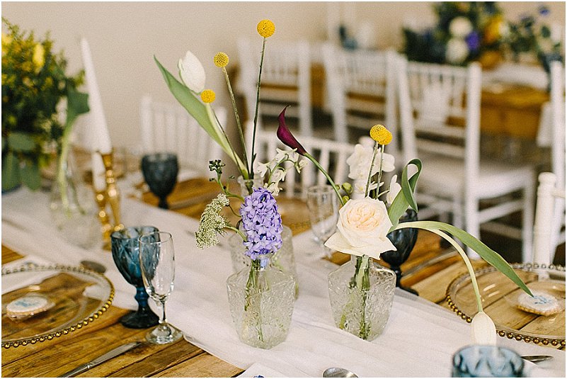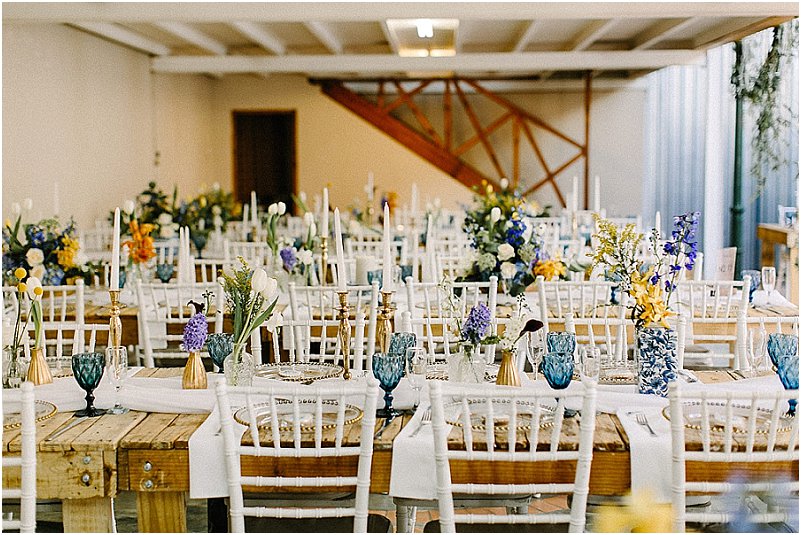 Ons keuse van dekor was dus ‘n kontras van rou houttafels, koper kandelare, baie kerse, “blouglas” en ongekompliseerde rangskikkings van blomme wat die gevoel van “ou” sjarme kan weerspieël.