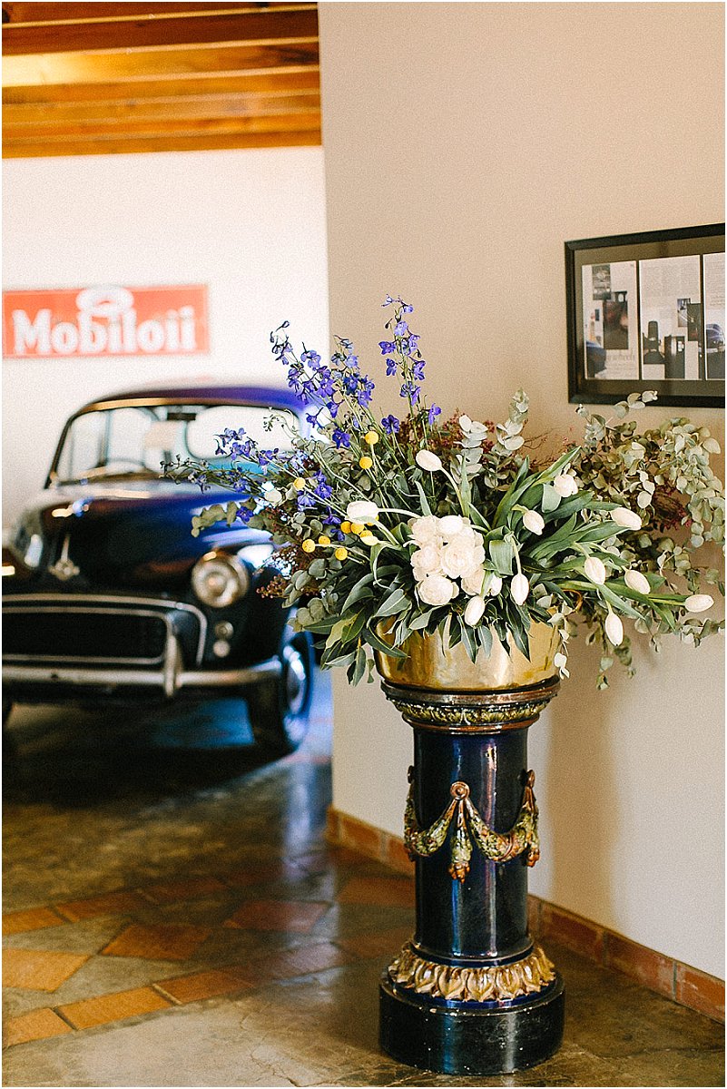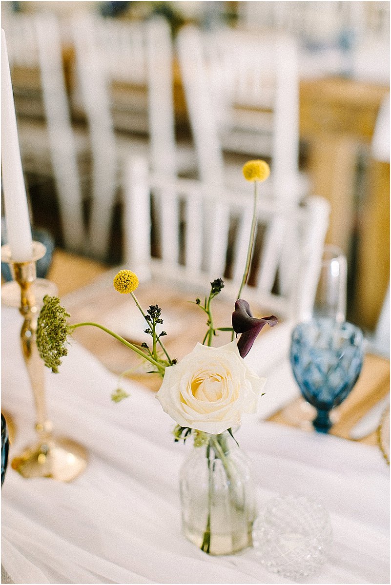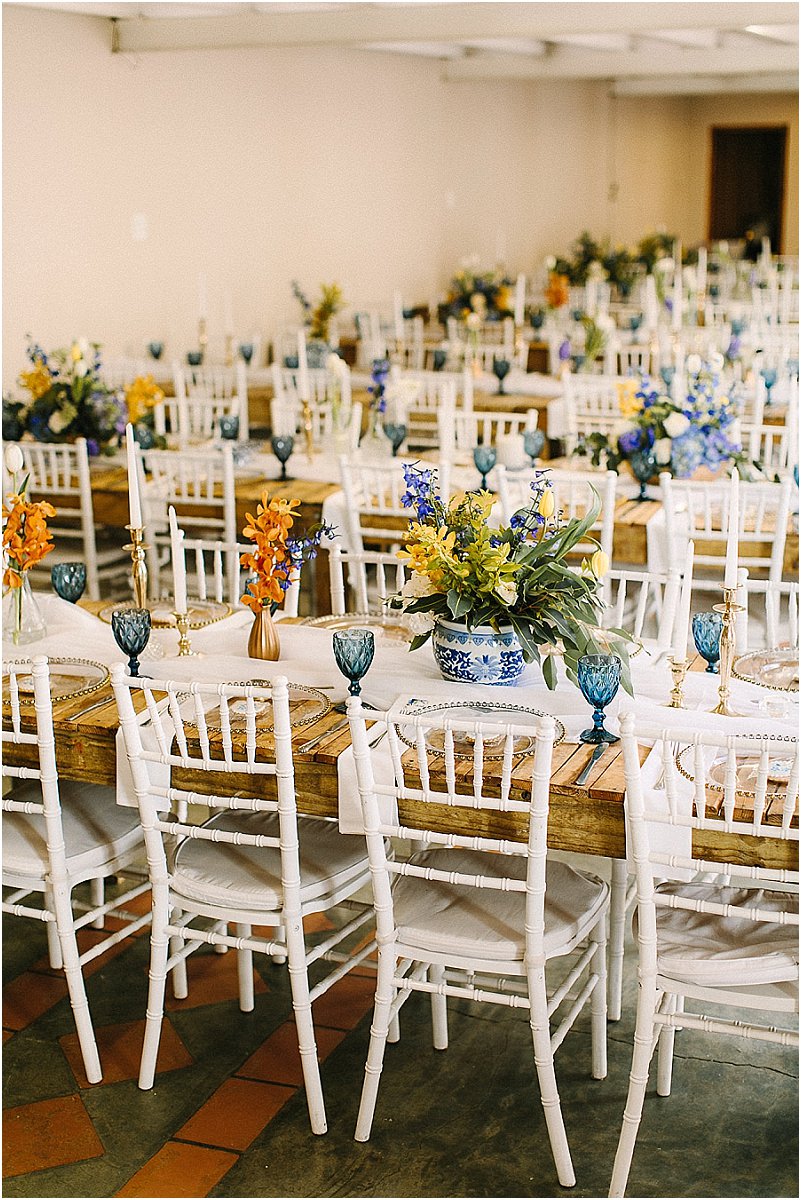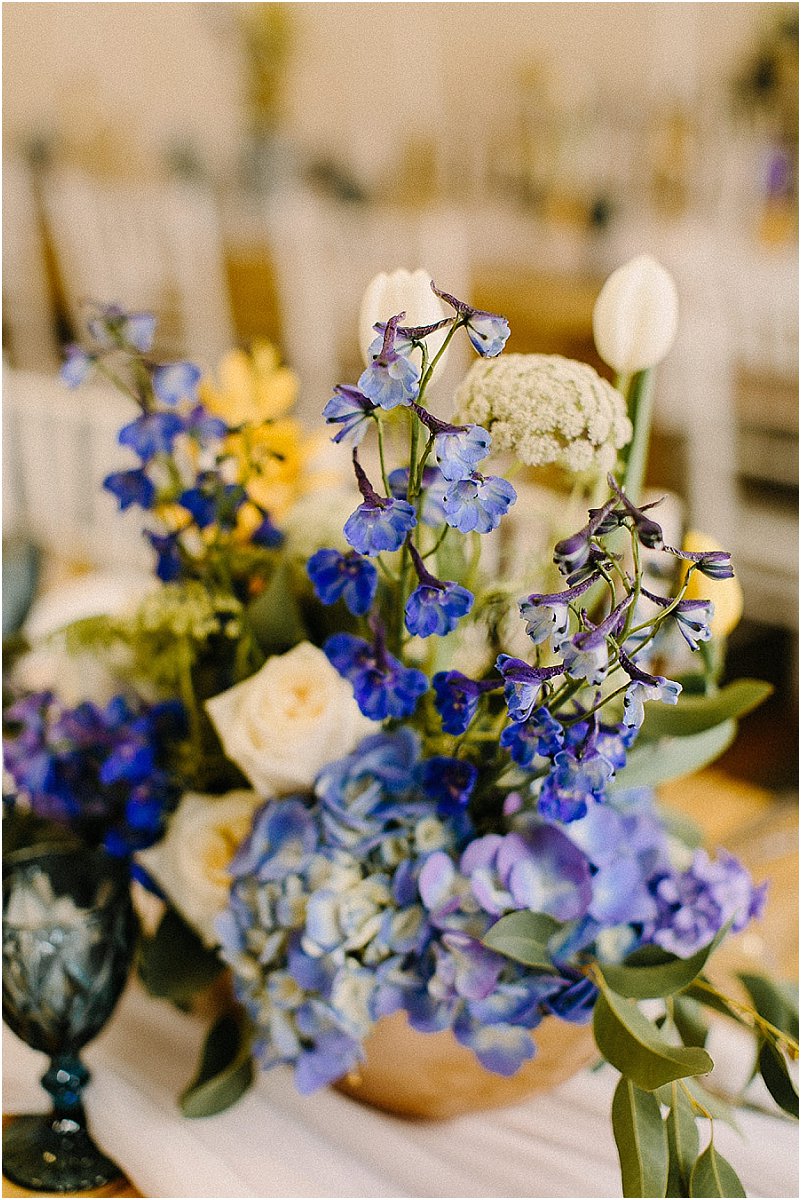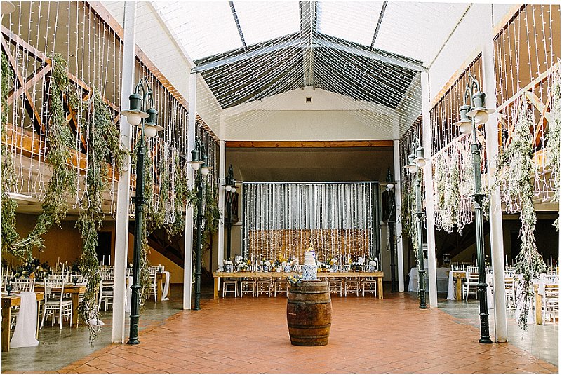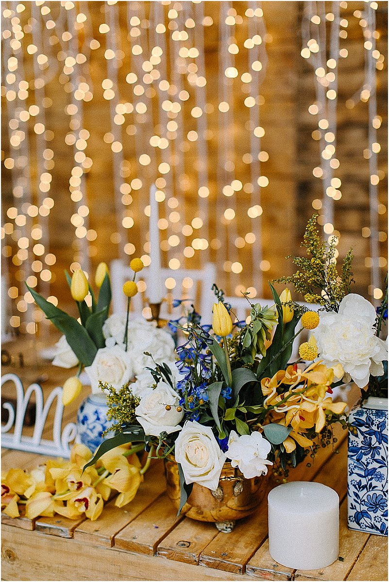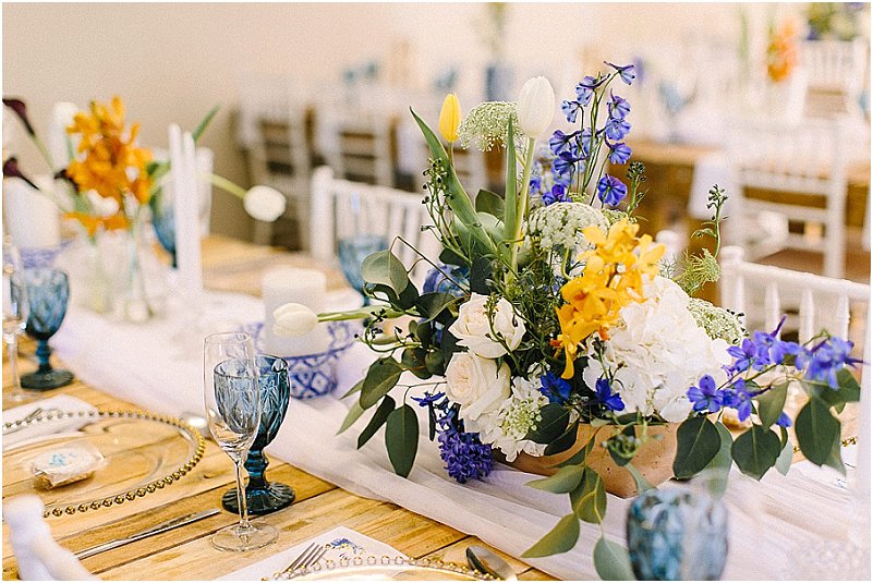 Ons keuse van dekor was dus ‘n kontras van rou houttafels, koper kandelare, baie kerse, “blouglas” en ongekompliseerde rangskikkings van blomme wat die gevoel van “ou” sjarme kan weerspieël.