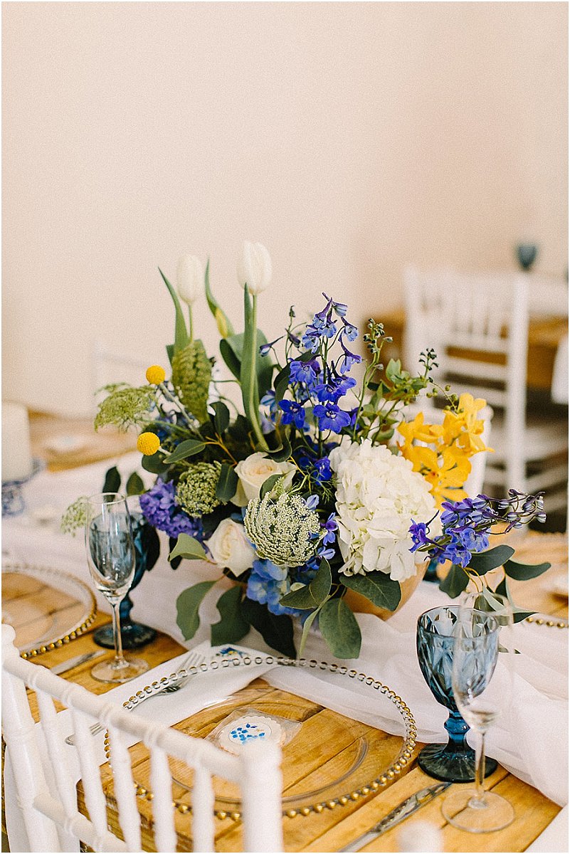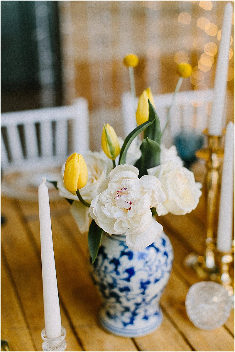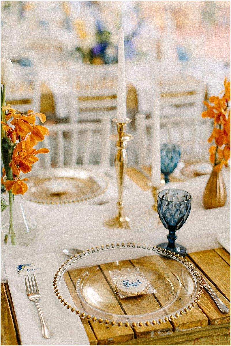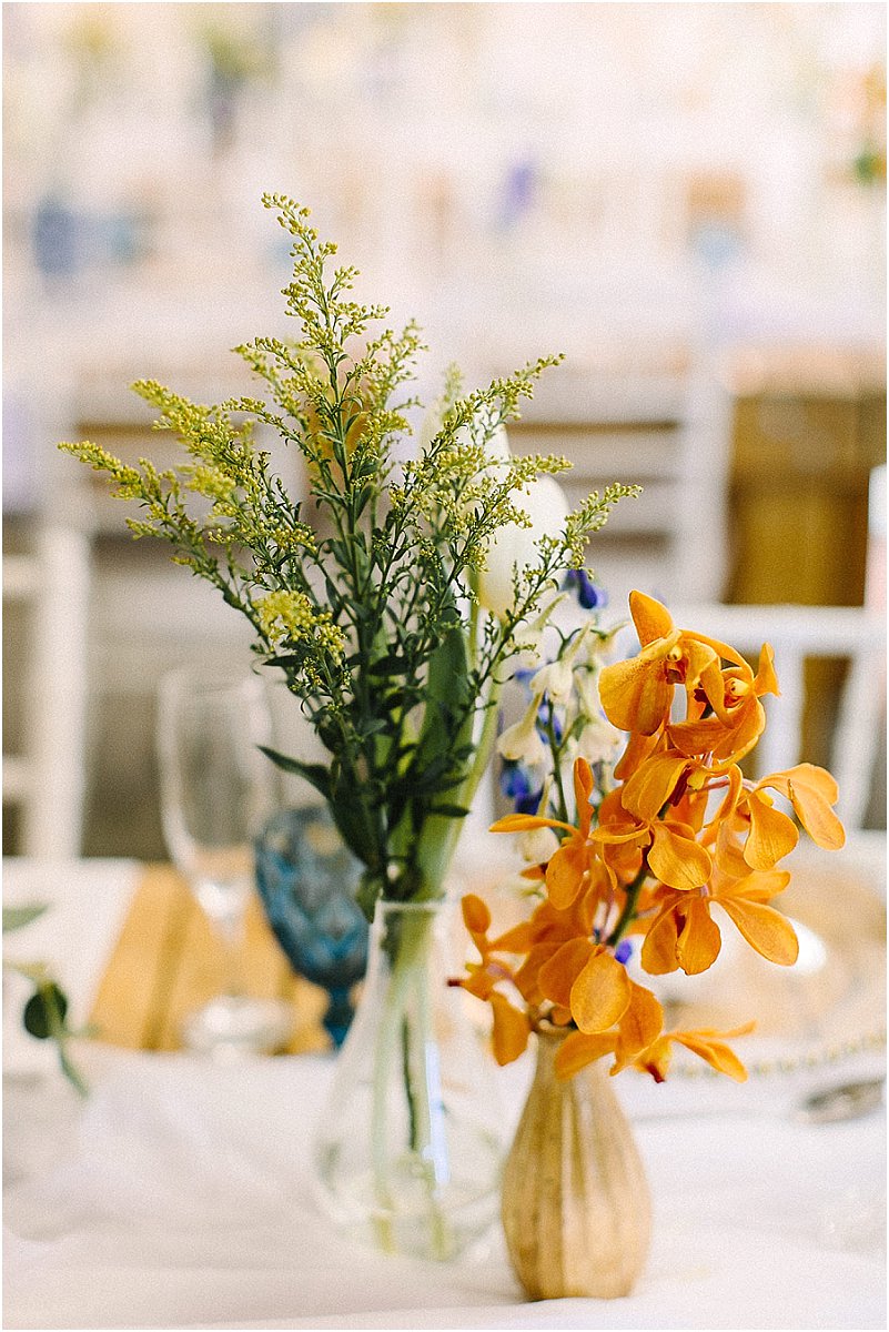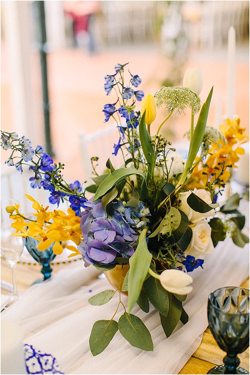 Ons keuse van dekor was dus ‘n kontras van rou houttafels, koper kandelare, baie kerse, “blouglas” en ongekompliseerde rangskikkings van blomme wat die gevoel van “ou” sjarme kan weerspieël.