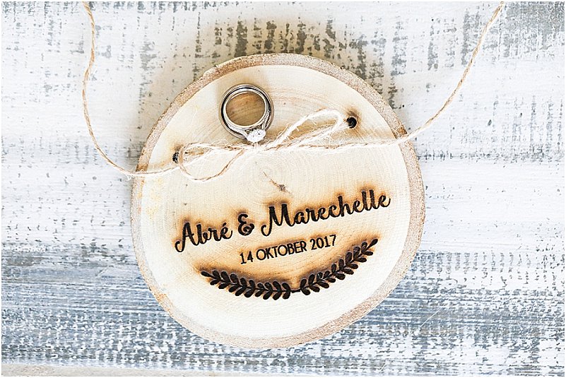 Ons verloofring is Browns se platinum Halo ring, wat kom met ‘n boodskap van liefde. Dis ‘n konstante simbool wat die bruid met haar saamdra, om haar te herinner dat iemand baie spesiaal haar liefhet. ‘n Eenvoudige platinum troupand, vir ewige trou, voltooi die bruid se prentjie.