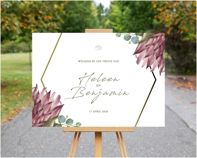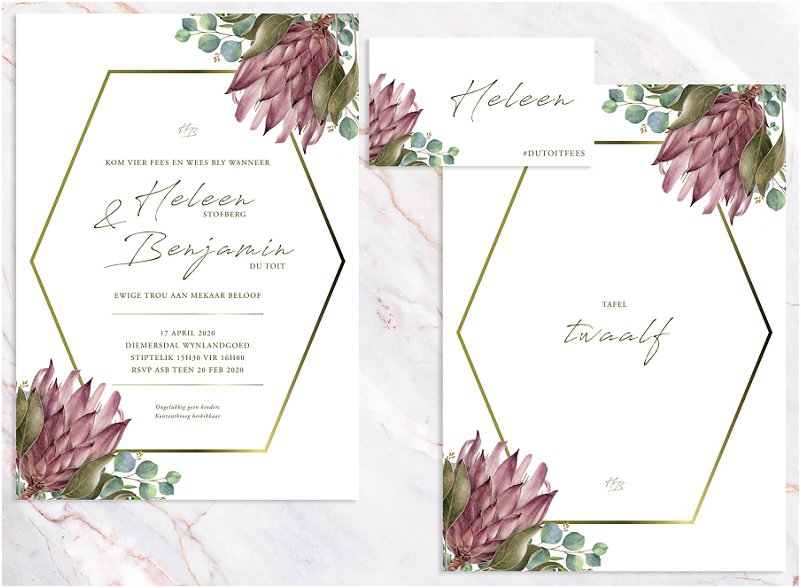 Die Protea blom is altyd mooi, of hy nou in sy natuurlike vorm voorkom, geverf of geteken word, dit bly ‘n mooi blom. Hierdie elegante stel trou skryfbehoeftes is ontwerp deur AK Weddings & Design wat Protea’s en geometriese lyne saam gebruik het om so ‘n mooi resultaat te skep. Hierdie stel sal perfek wees vir ‘n paartjie wat opsoek is na iets modern en elegante skryfbehoeftes wat gepas is vir ‘n aand of dag troue. Wat die stel vir ons so mooi maak is dat dit minimalisties is met die mooi protea illustrasie as detail.