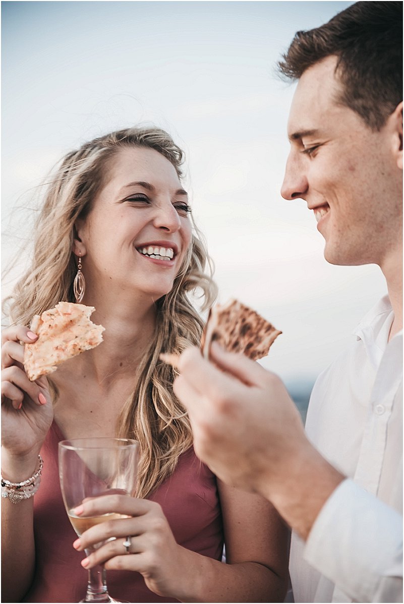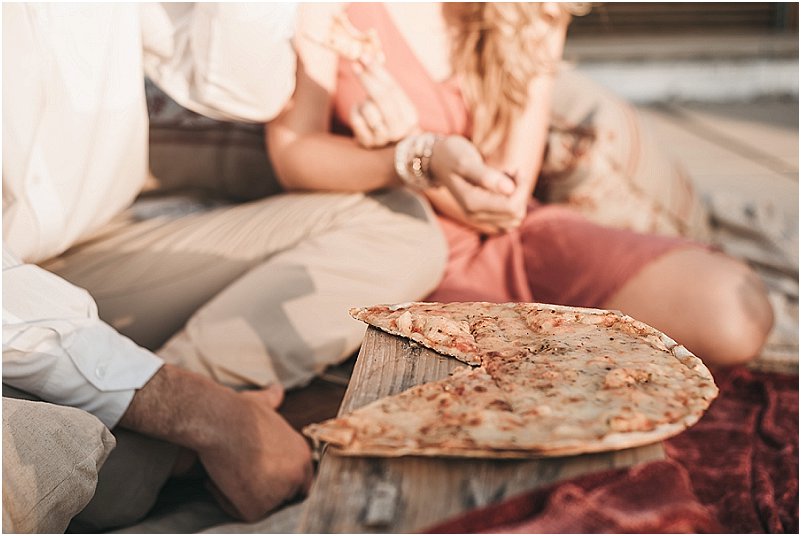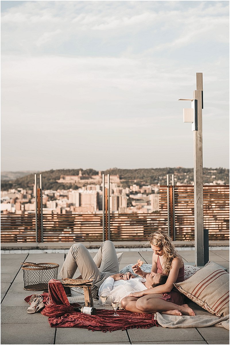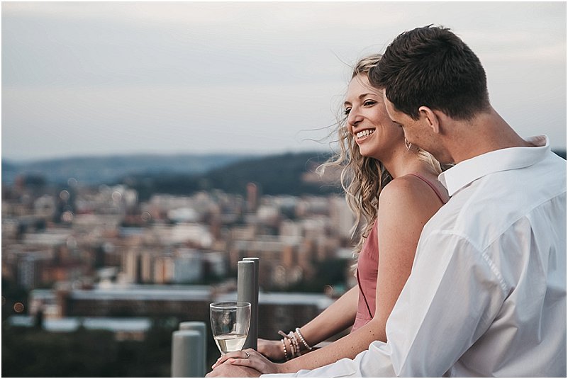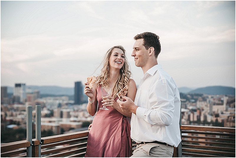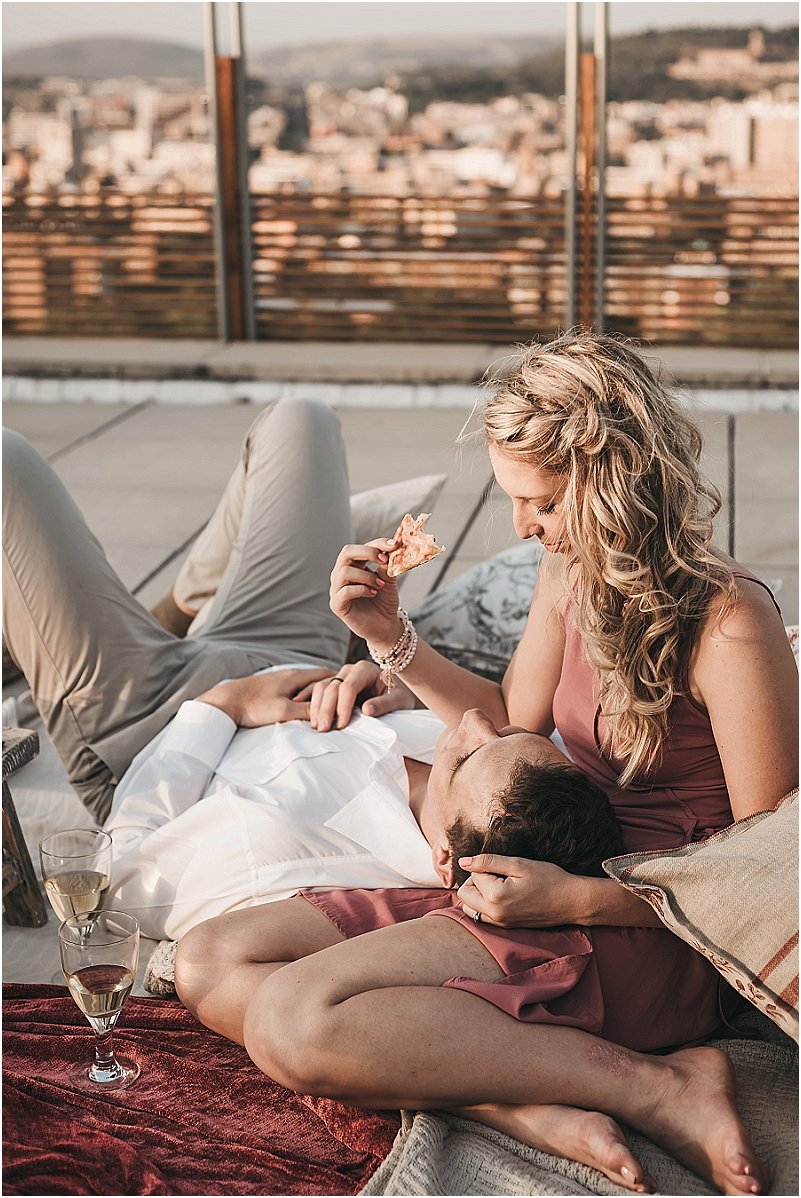 Dit was als Samatha se idee! Ek het gehoop om iets stedelik te doen omdat ons trou foto’s in die natuur gaan wees. Sy het ons gevra wat ons gunsteling ete/afspraak idee is en daarna was dit eenvoudig – ʼn dak piekniek met pizza en wyn!