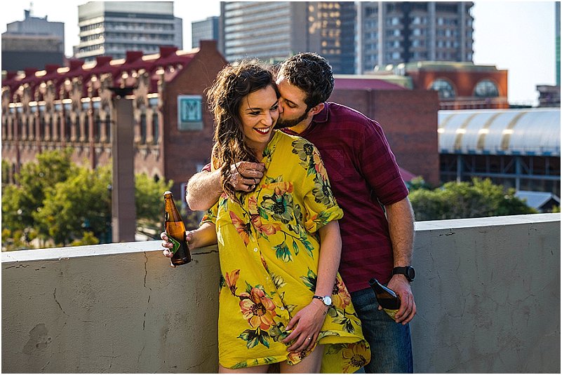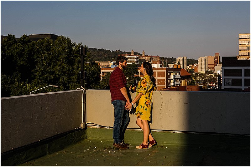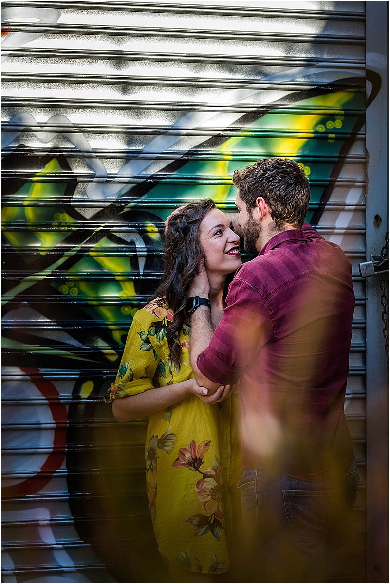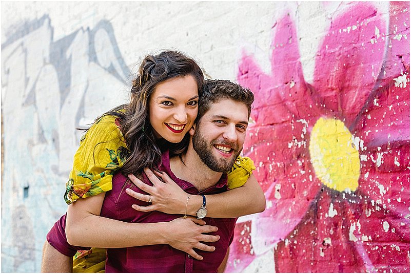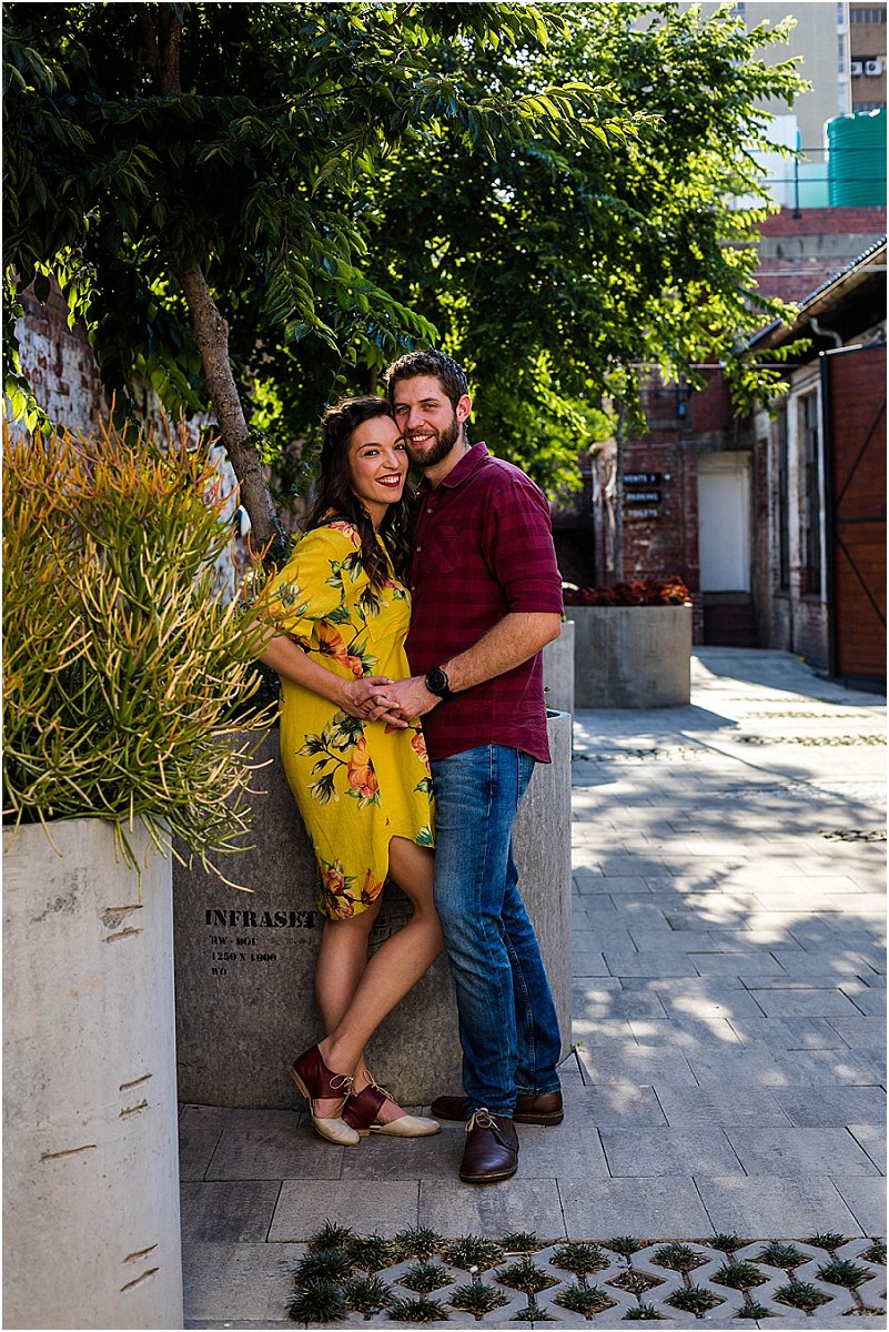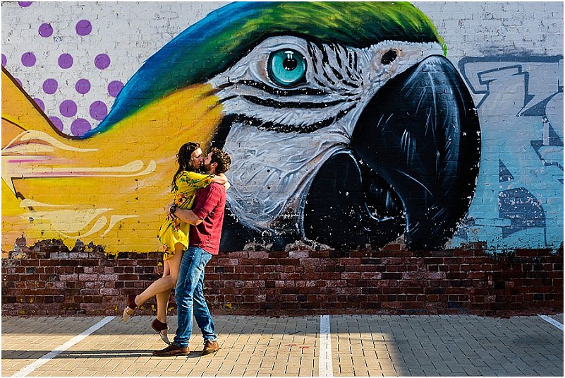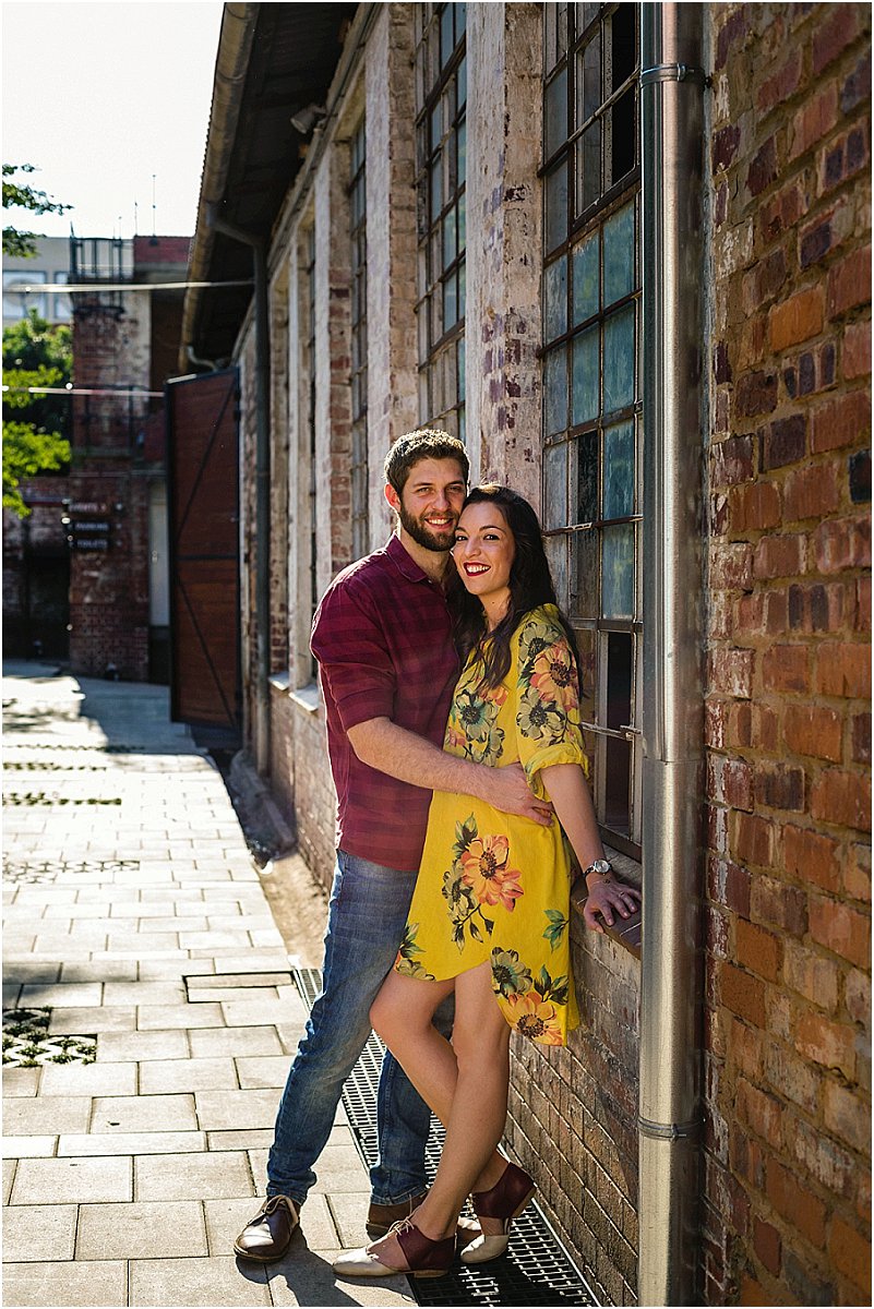 Ons is mal oor die natuur, maar het besluit om dit vir die troudag te los. Ons was lus om ‘n ander konteks te kies vir die verlowingsessie, iets meer modern en prettig. Ek was die hele tyd somer al lus vir iets geel en het toe vir my die rokkie gekies en besluit om radikaal te gaan met ons kleure! (Wat op die ou end heel goed gewerk het saam met die graffiti op die mure!) Daar was ‘n trou onthaal by die venue toe ons daar aankom – met ‘n Swart-en-Wit tema! Ek dink die gaste het vermoed ons is daar om hulle te kom vermaak met ons helder kleure toe ons daar verby glip!