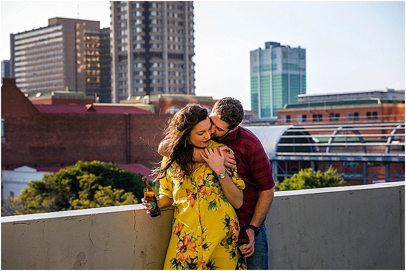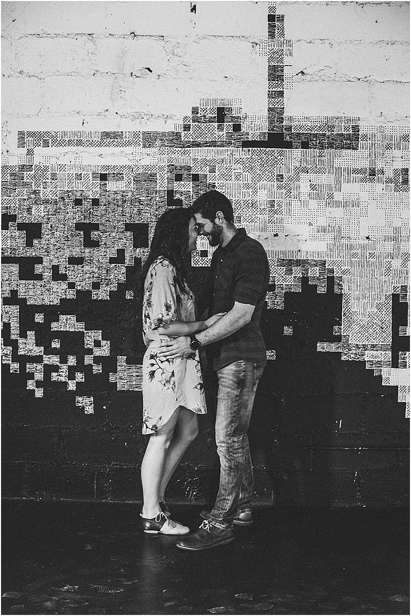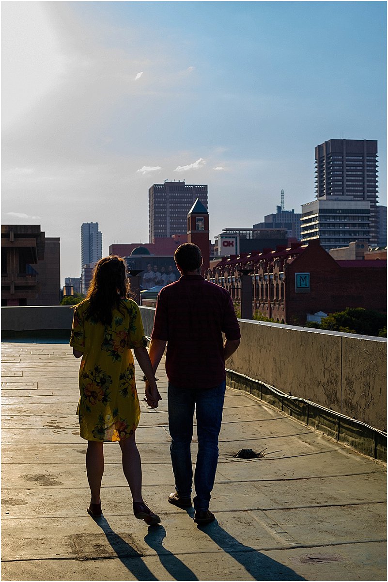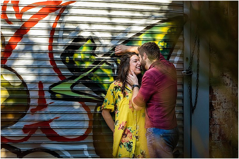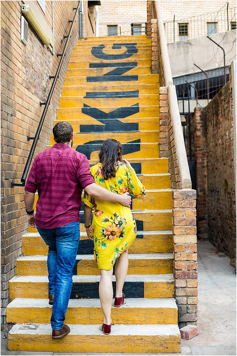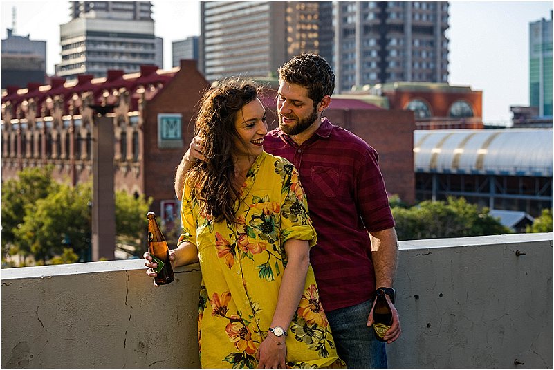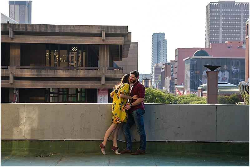 Ons is mal oor die natuur, maar het besluit om dit vir die troudag te los. Ons was lus om ‘n ander konteks te kies vir die verlowingsessie, iets meer modern en prettig. Ek was die hele tyd somer al lus vir iets geel en het toe vir my die rokkie gekies en besluit om radikaal te gaan met ons kleure! (Wat op die ou end heel goed gewerk het saam met die graffiti op die mure!) Daar was ‘n trou onthaal by die venue toe ons daar aankom – met ‘n Swart-en-Wit tema! Ek dink die gaste het vermoed ons is daar om hulle te kom vermaak met ons helder kleure toe ons daar verby glip!