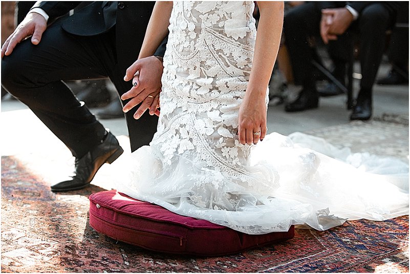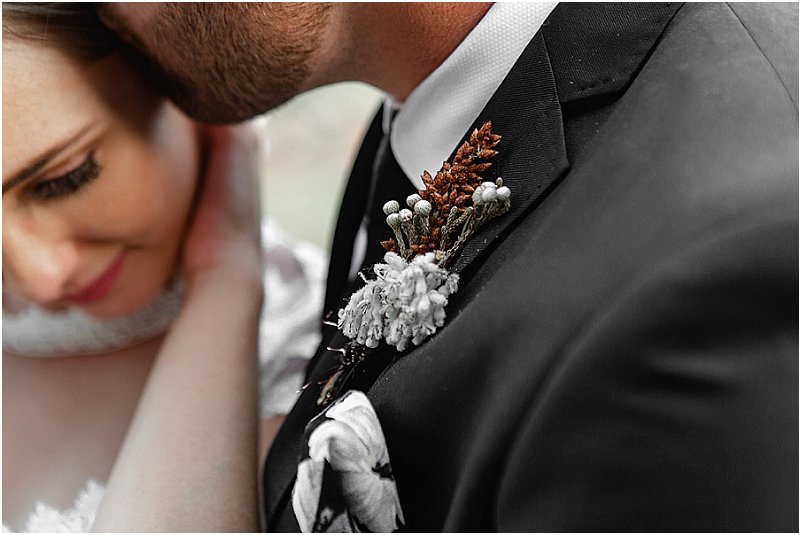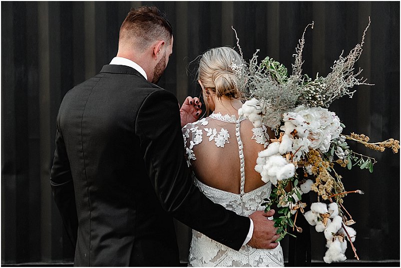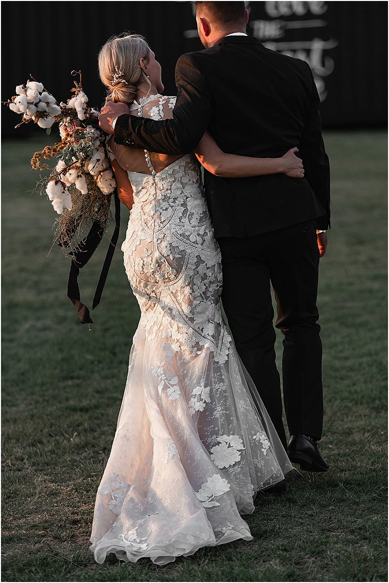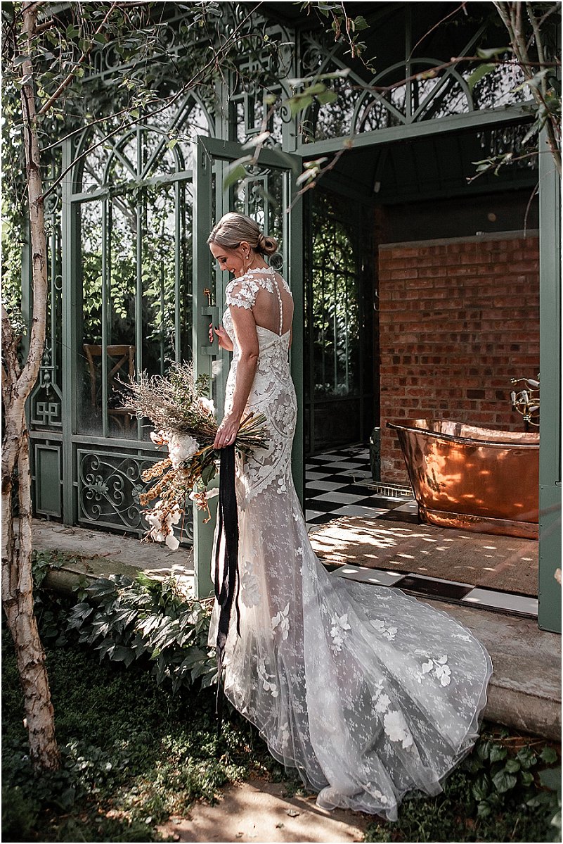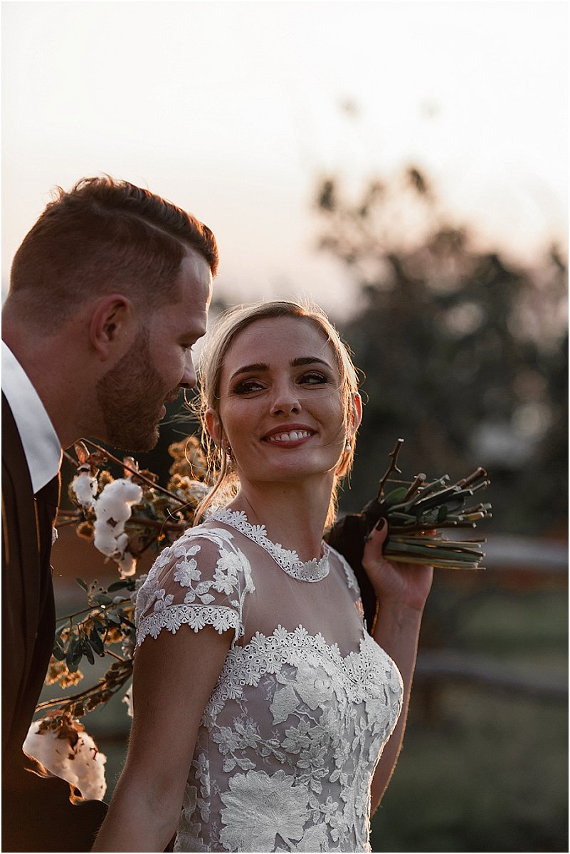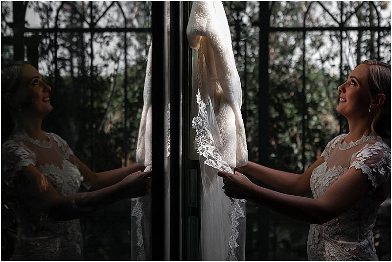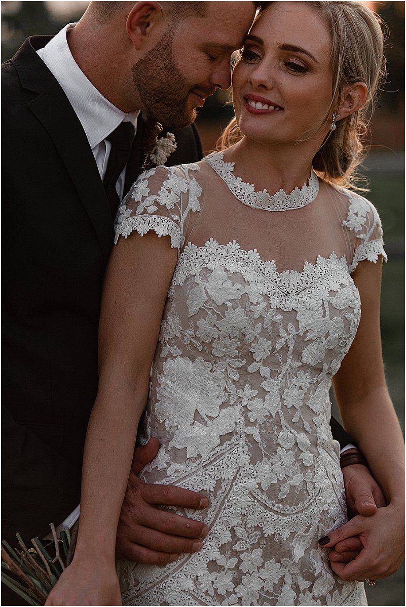 Soos met alles van ons troue, was ek verseker opsoek na iets ongewoon en uniek – ‘n formele, elegante rok met ‘n Europese gevoel. Die vol-kant rok van ‘Emma’ (die naam van my rok) was onbeplan omdat my smaak oor die algemeen redelik gewoon is. Ek was onmiddellik verlief om die tipe kant en die snit van die rok. Emma was aanvanklik te koop met dun bandjies, maar ek wou van die begin af ‘n rok met ‘n hoë hals en petmoue gehad het en het dus ekstra kant bestel vir hierdie verstellings. Ek lief elke detail van my rok – die verstellings het dit so uniek en ek gemaak.