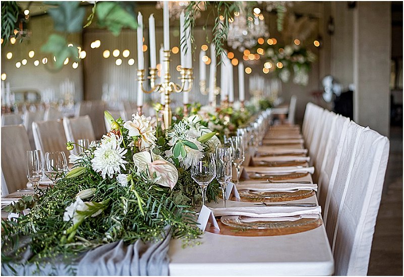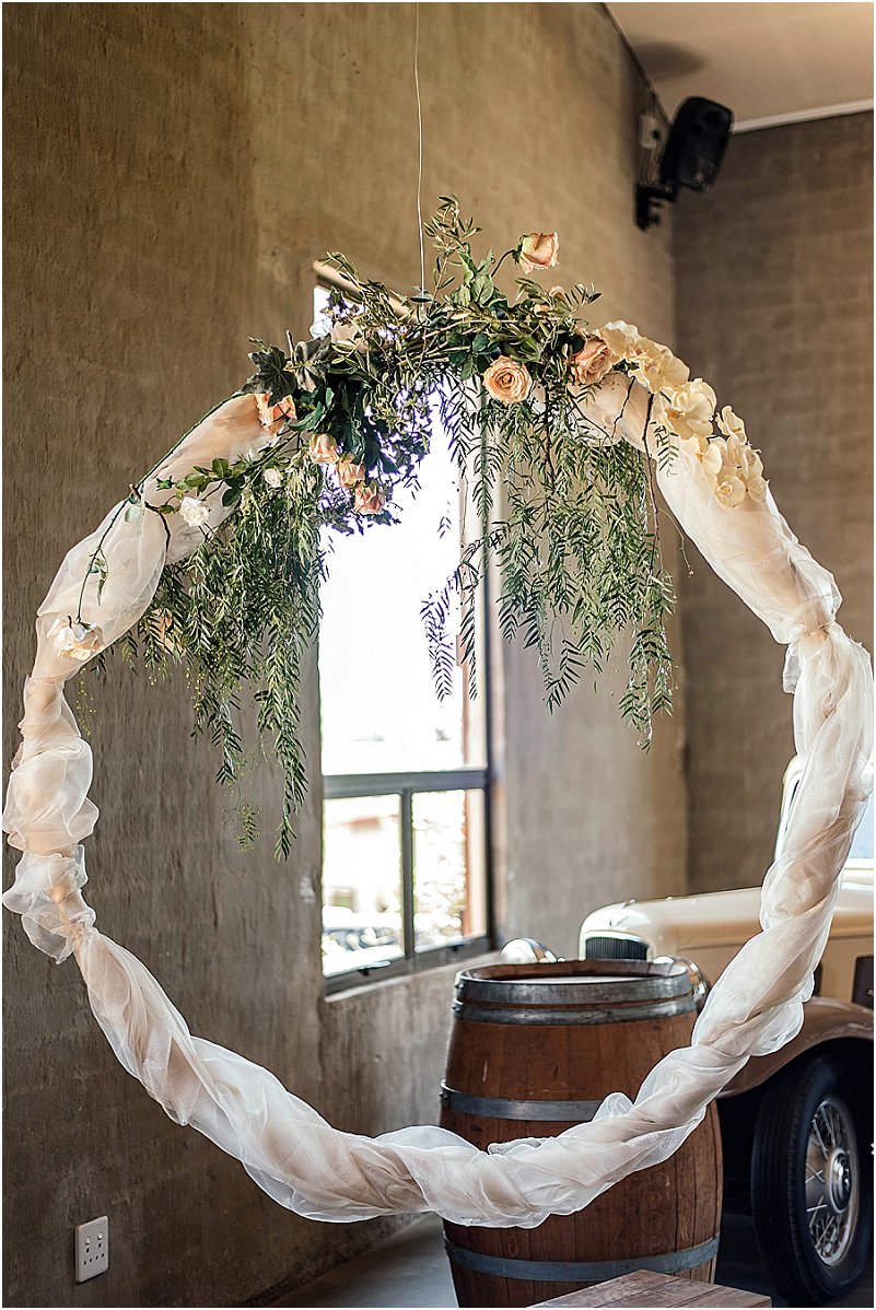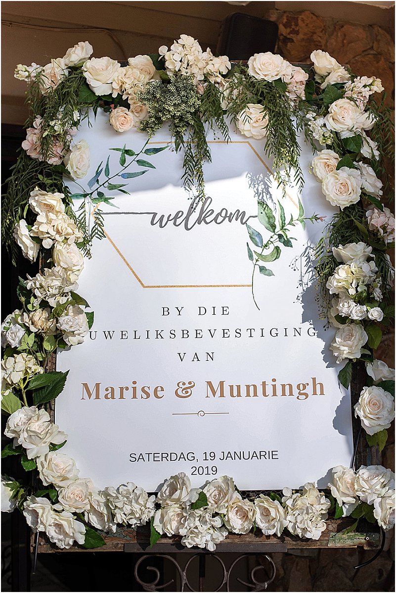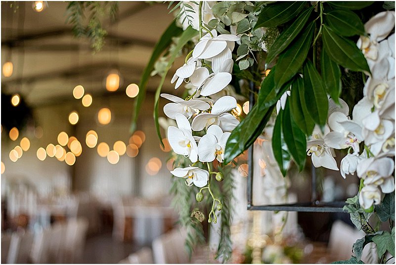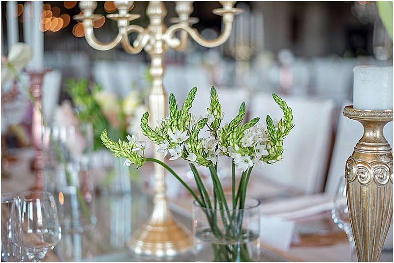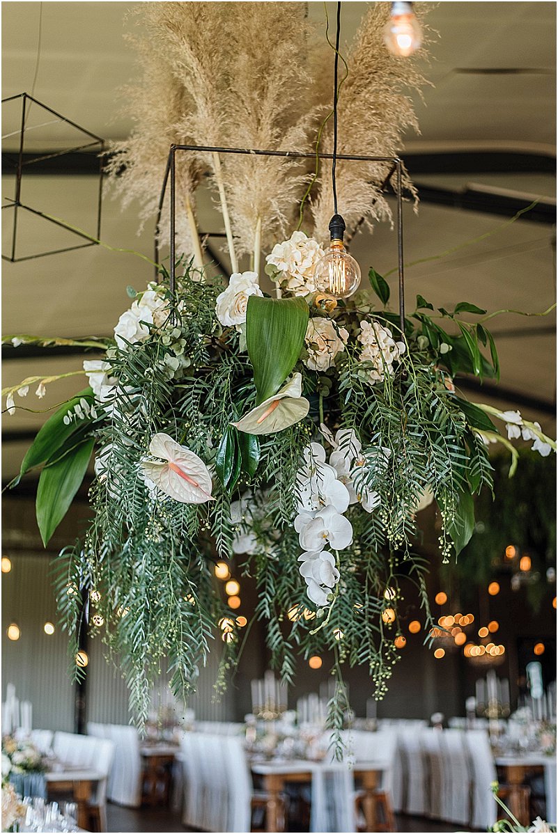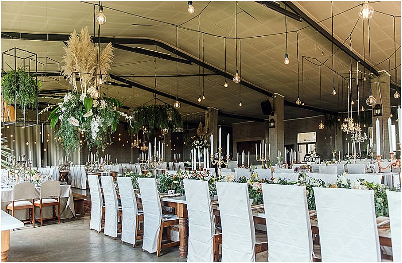 Die plaastroue was elegant versier met blomme en dekor. Die tafel dekor met Roosgoud elemente het die plaastroue baie elegant laat lyk. Flaminkplant en Orgideë blomme het volop van die plaas venue se dak gehang.
