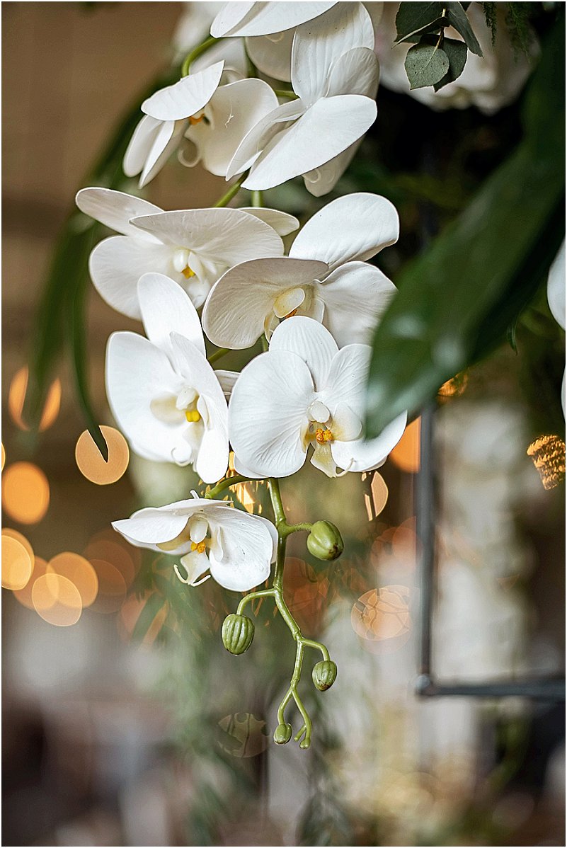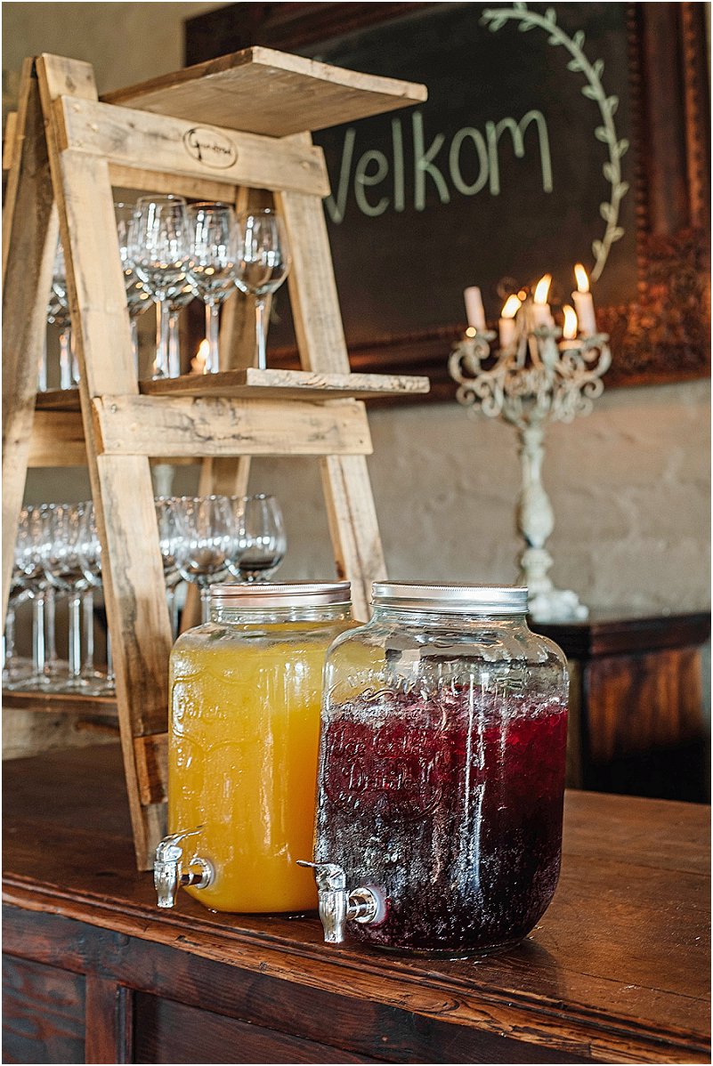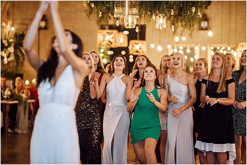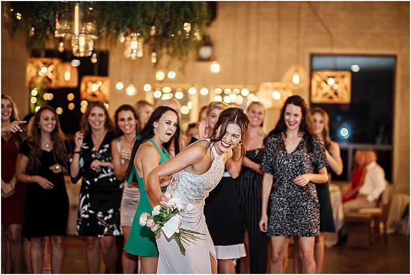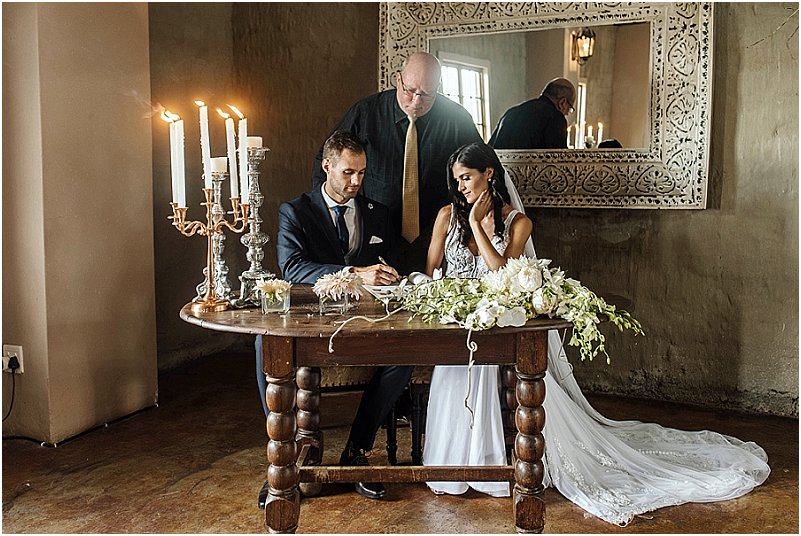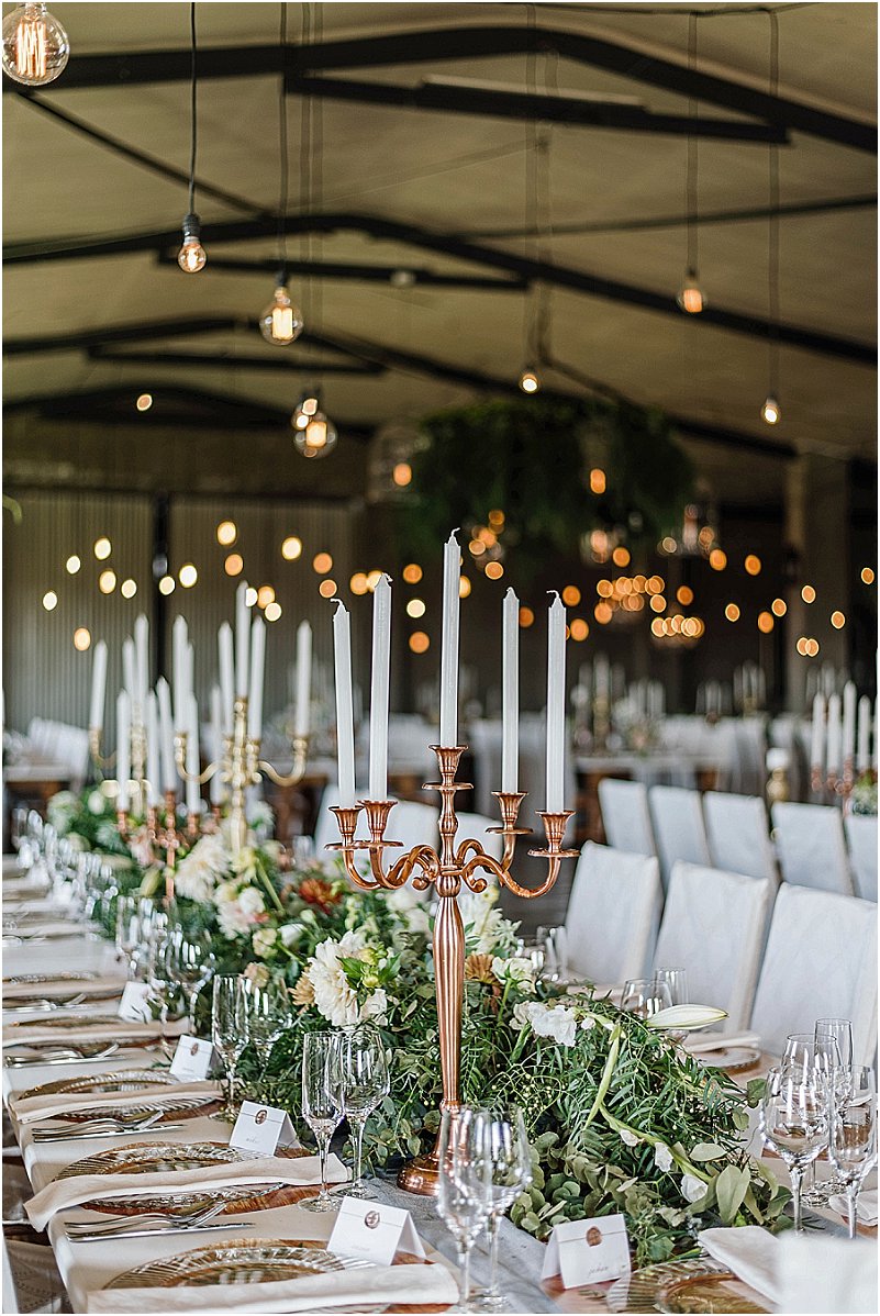 Die plaastroue was elegant versier met blomme en dekor. Die tafel dekor met Roosgoud elemente het die plaastroue baie elegant laat lyk. Flaminkplant en Orgideë blomme het volop van die plaas venue se dak gehang.