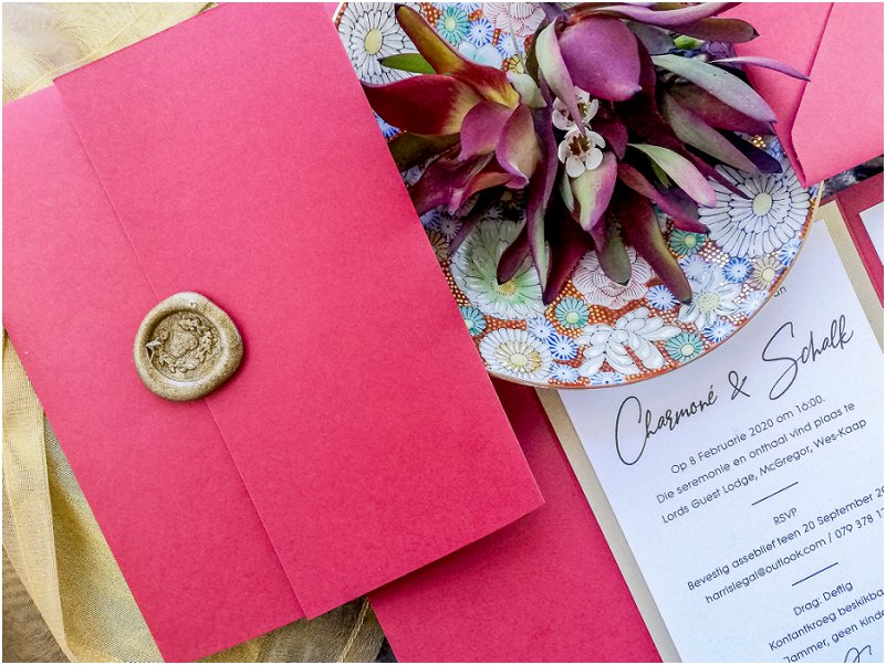 Hierdie uitnodiging is ‘n pragtige lewendige kleur en besit fyner detail wat dit laat uitstaan bo die res. Die waks stempel is iets wat jy al hoe minder sien, maar tog wakker dit so ‘n nostalgiese gevoel aan. Daar is niks ouliker as ‘n waks stempel om jou uitnodiging te seel nie; Sodra die seel gebreek word kan dit nie weer toegemaak word nie.