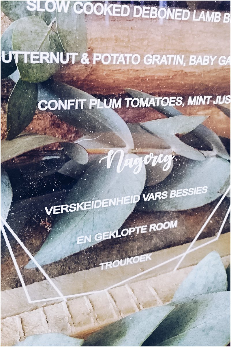 Jou troudag se spyskaart is soms een van die dinge waarna jou gaste die meeste uitsien! Spyseniering-maatskappye kom met die heerlikste disse vorendag met kombinasies wat jy selde in jou eie kombuis probeer. Jou gaste word gefassineer deur hierdie smul-lekker kossoorte, maar dit is tog belangrik vir hulle om swart op wit te sien wat hulle eet. Invitation Café het ‘n spyskaart-bord ontwerp wat jou gaste sal in staat stel om vooraf te weet presies wat hulle bedien gaan word. Hierdie deurskynende spyskaart-bord kan ook voordelig wees vir jou begroting, omdat jy sodoende nie aparte spyskaarte vir elke gas hoef te laat druk nie.