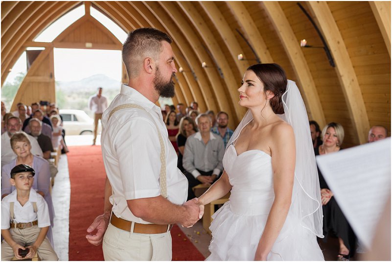 Ons is geseën met dié mooiste dag. Die oggend toe ek opstaan en gedurende die dag van klaarmaak, het ons hierdie reën (wat absoluut skaars is in die warm Namibië) gehad. Toe ek uit my troukar klim om by die kerk in te loop, het reën gestop, en ligte sonstraal het die kapel binnegekom. Toe ons fotosessie begin, verskyn die mooiste reënboog.