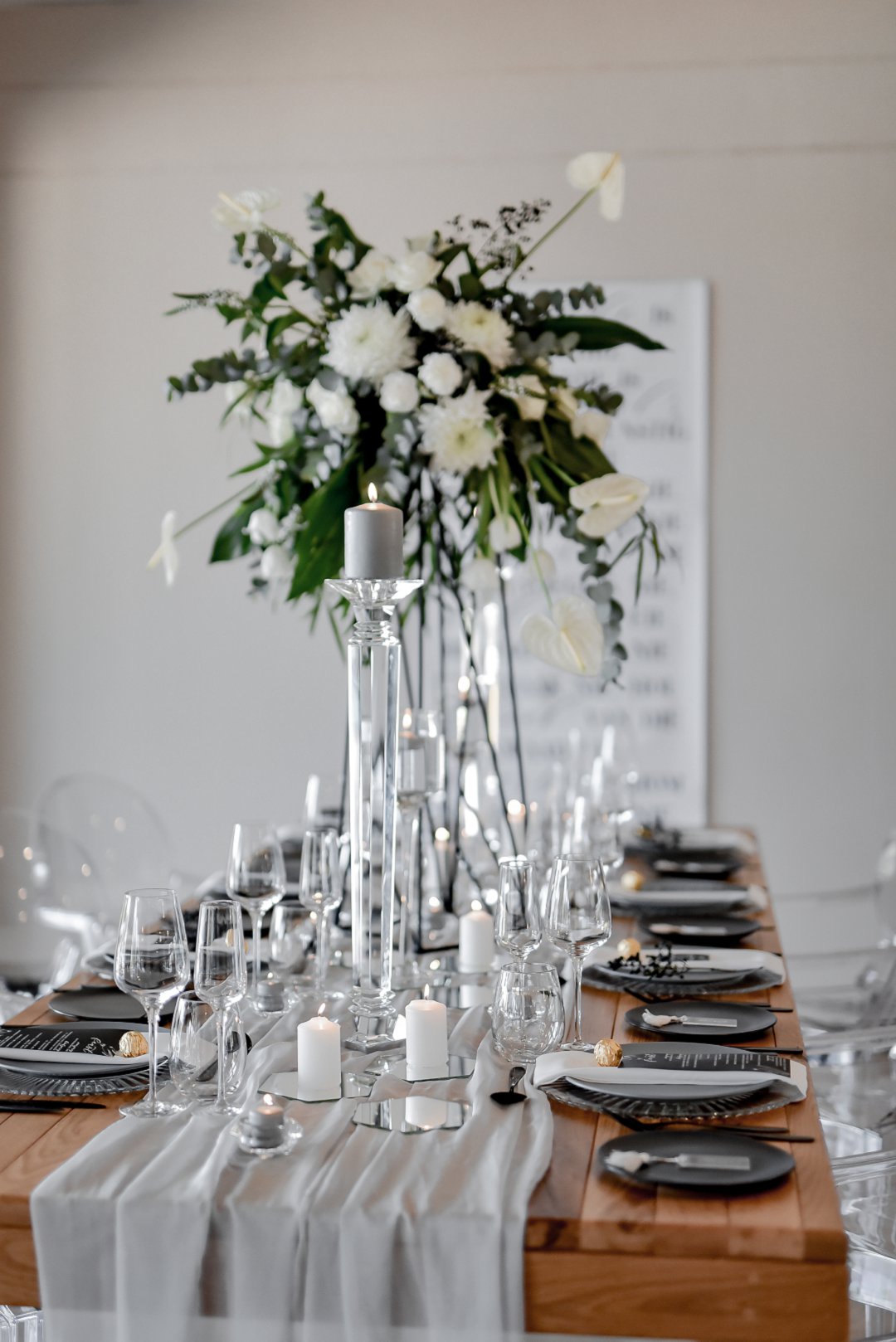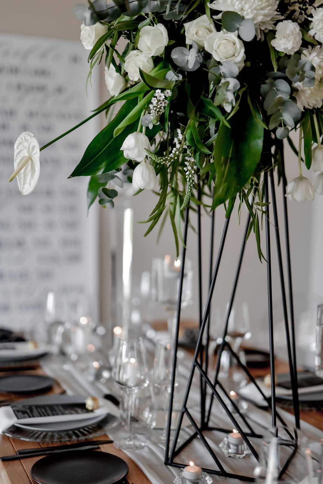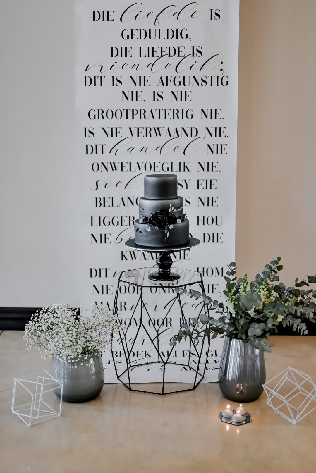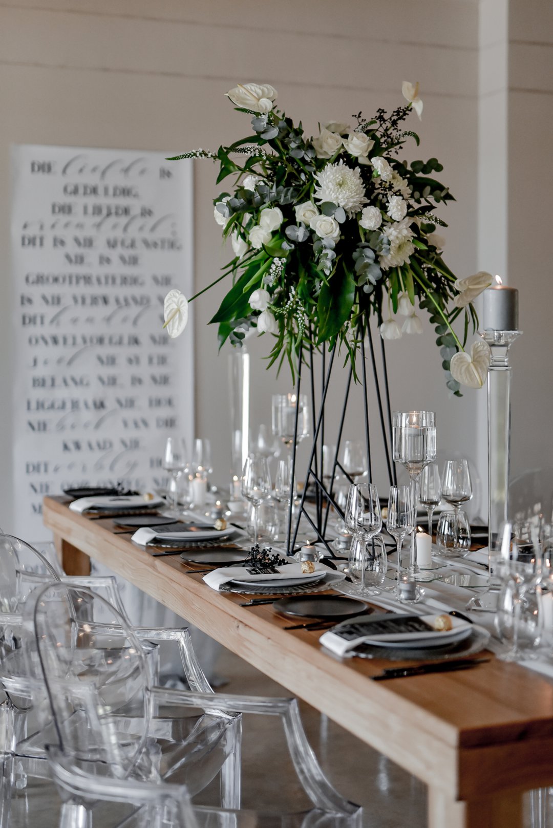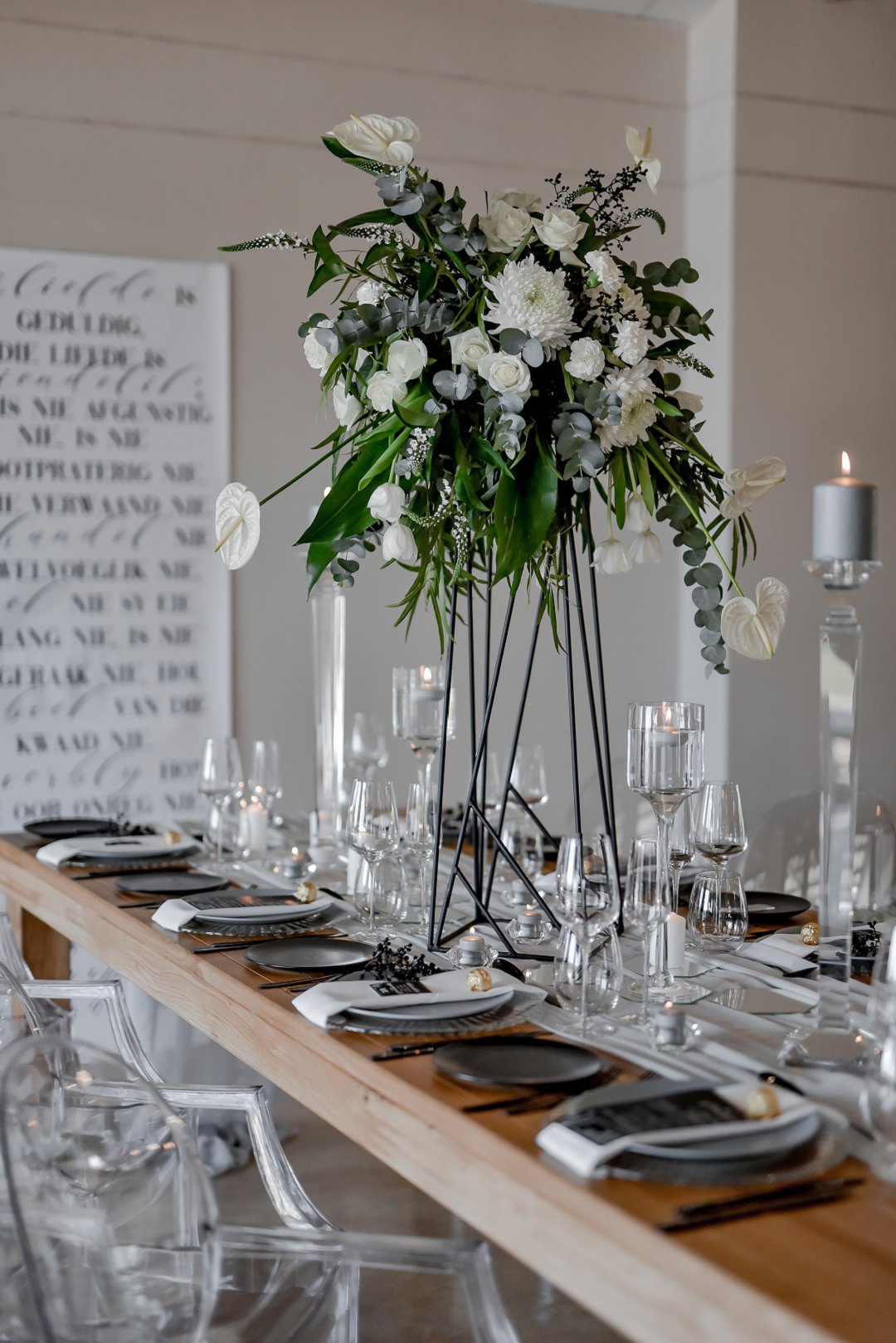 Tendense kom en gaan – maar ‘n klassieke swart-en-wit troue sal altyd pragtig wees. Ons het besluit om ‘n tikkie smaraggroen by te sit. Ons wou graag ‘n elegante, klassieke gevoel skep met moderne elemente hier en daar.