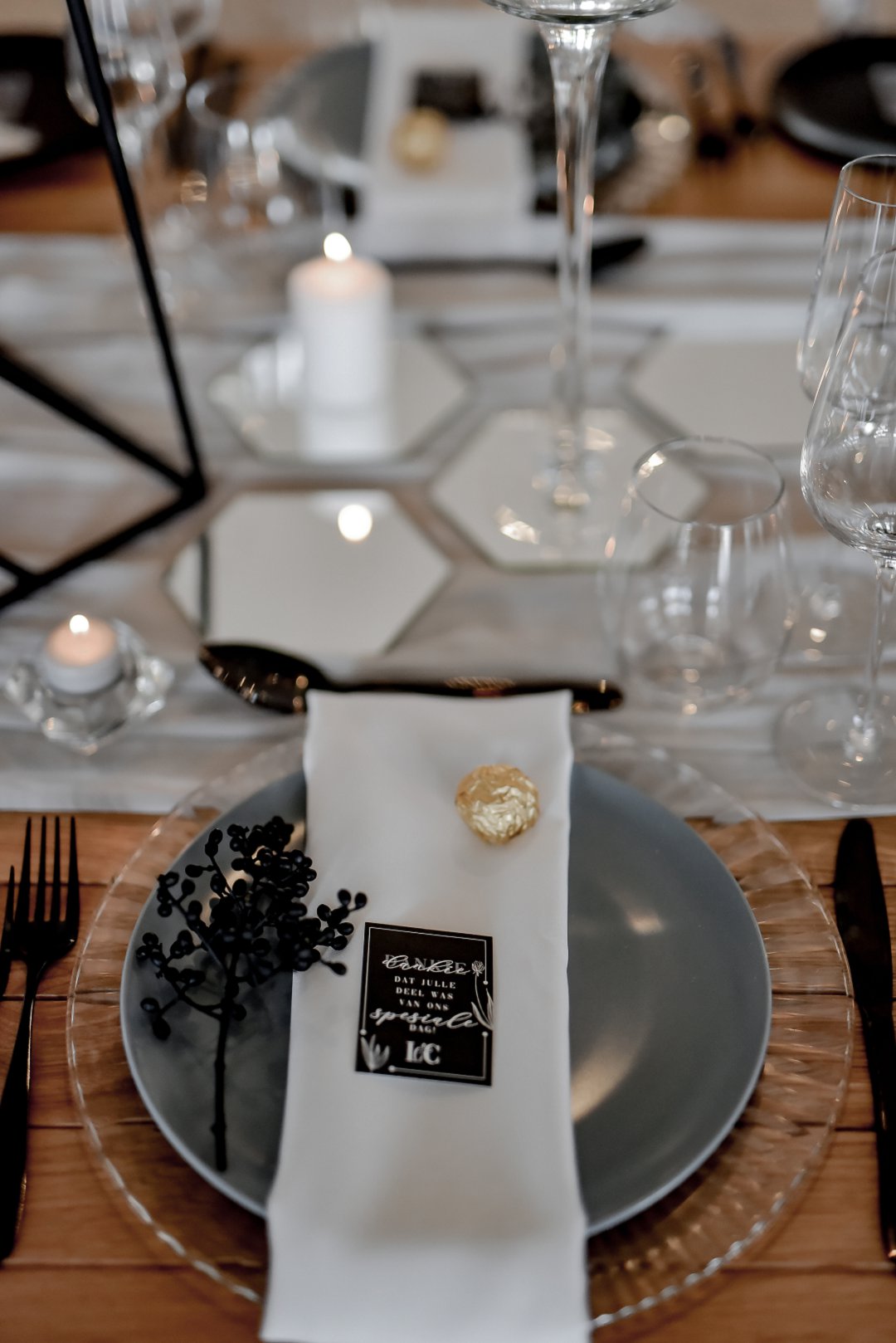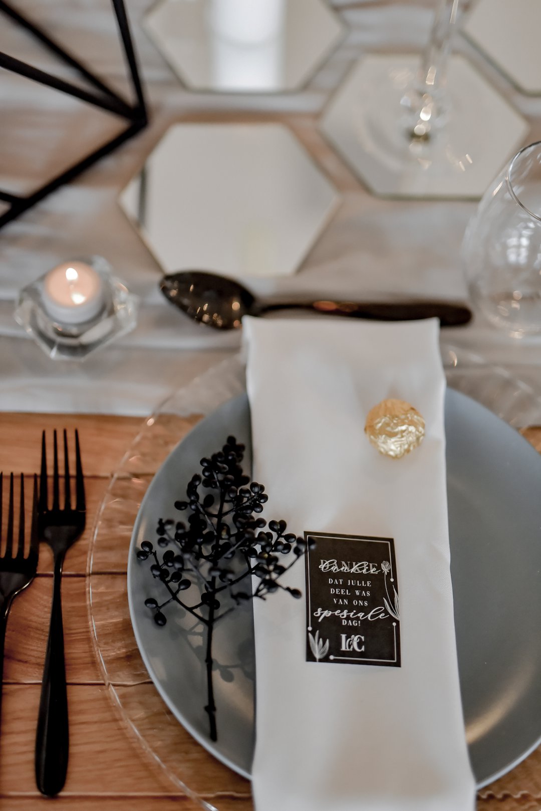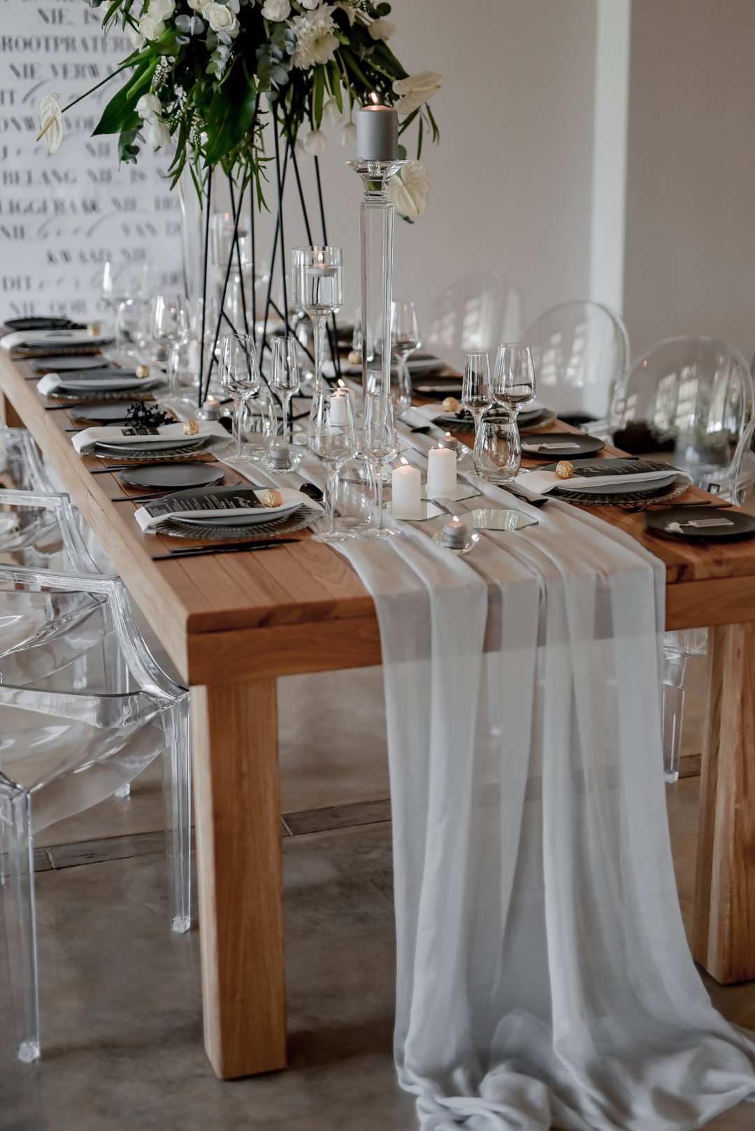Met hierdie ‘look and feel’ is dit baie belangrik dat jy produkte kies wat klassiek en duursaam is, soos die pragtige Anel Botha rok en die kristal op die tafel. Moenie net links en reg items op die tafel plaas nie. Kyk na elke element van jou tafel en kies sorgvuldig wat jy wil gebruik.