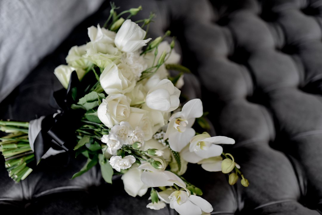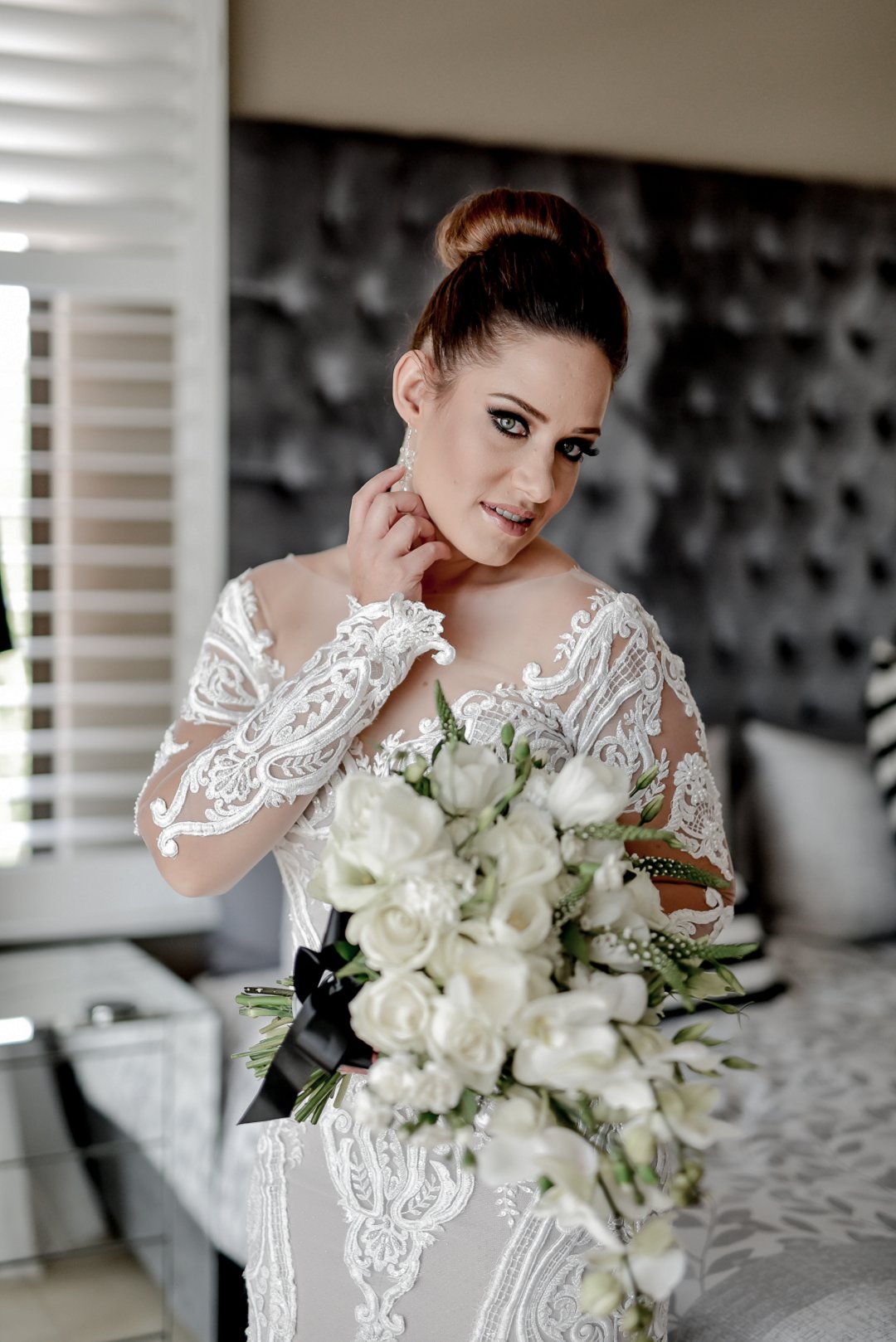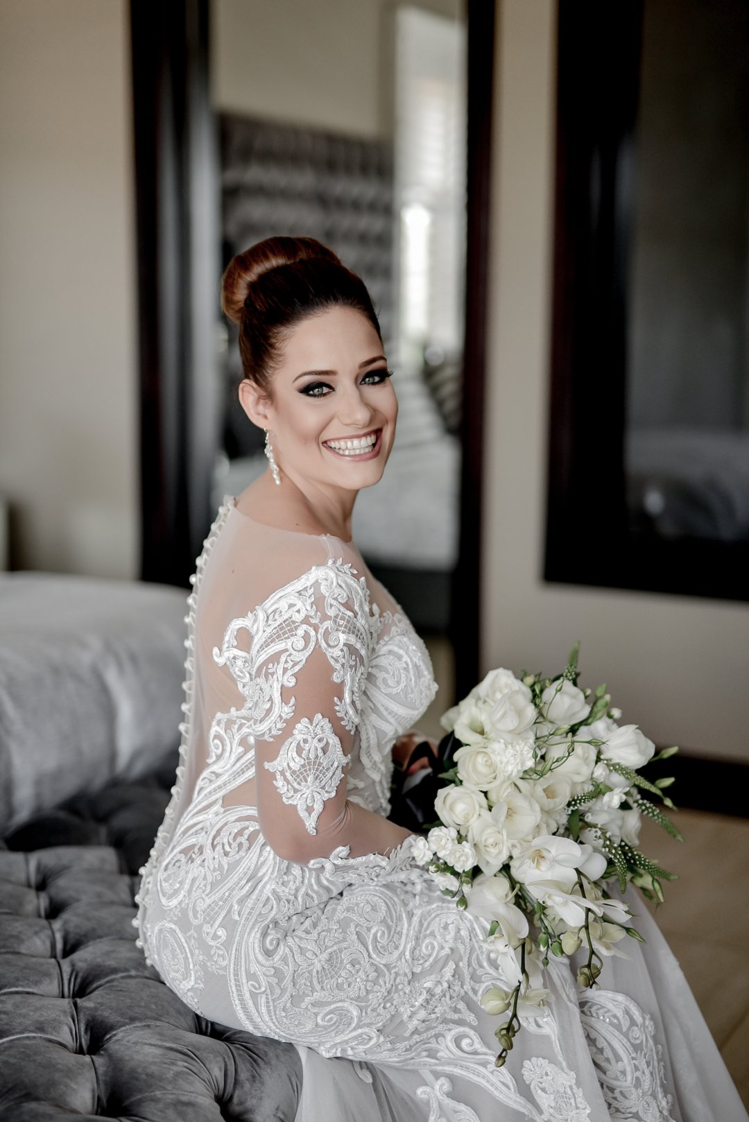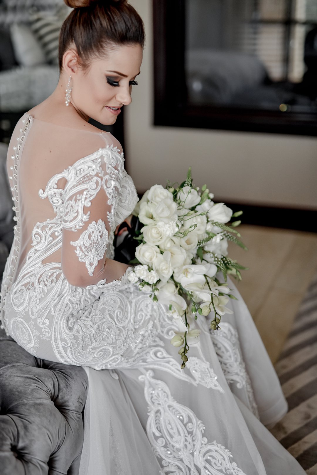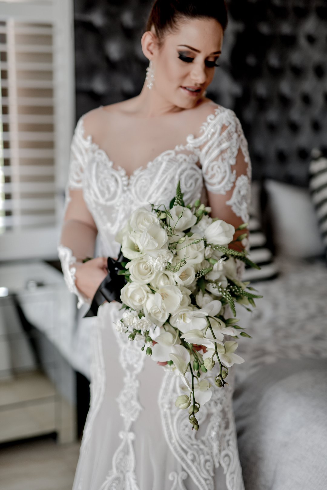 As jy die fotosessie van nader kyk sal jy definitief nie die blomme miskyk nie. Dit is een van die hoofelemente van die dekor. Van die kerk tot in die onthaal. Die handruiker van die model is net so pragtig, mal oor die kombinasie van wit rose en die wit orgideë. Alles werk net so mooi saam.