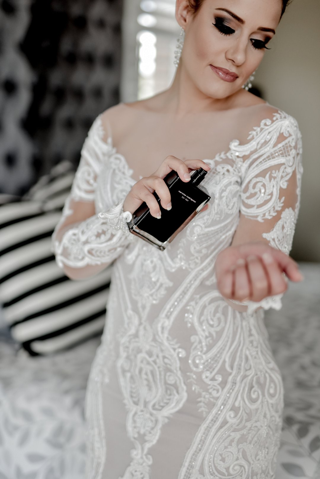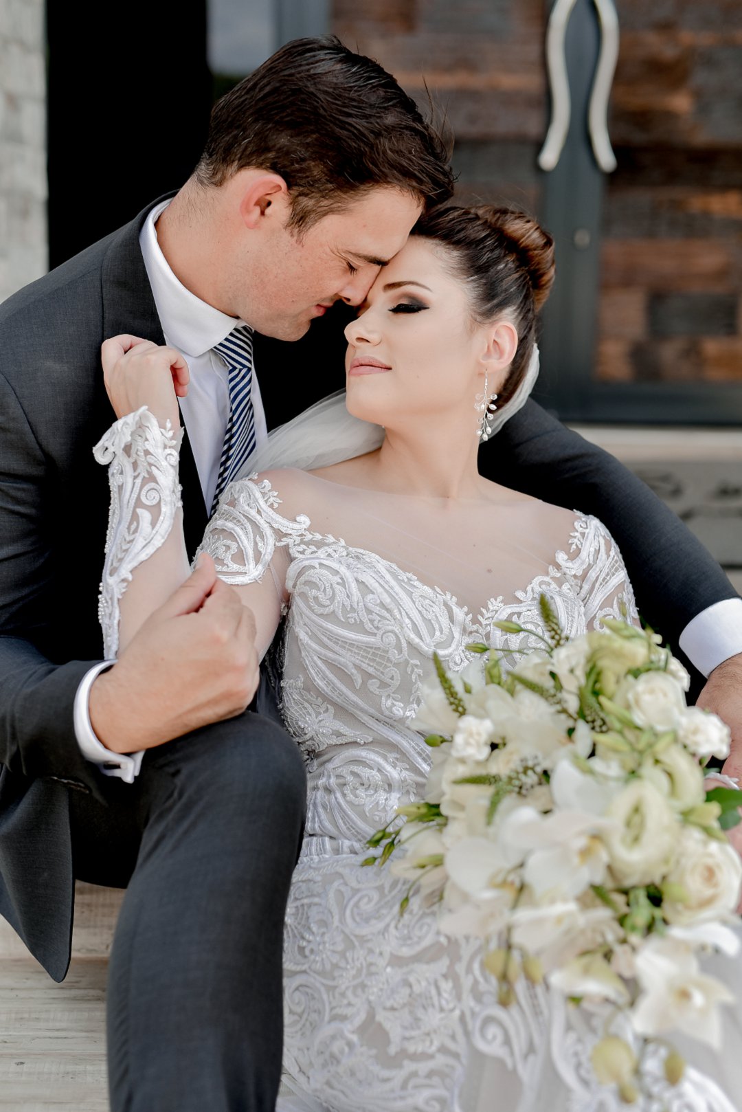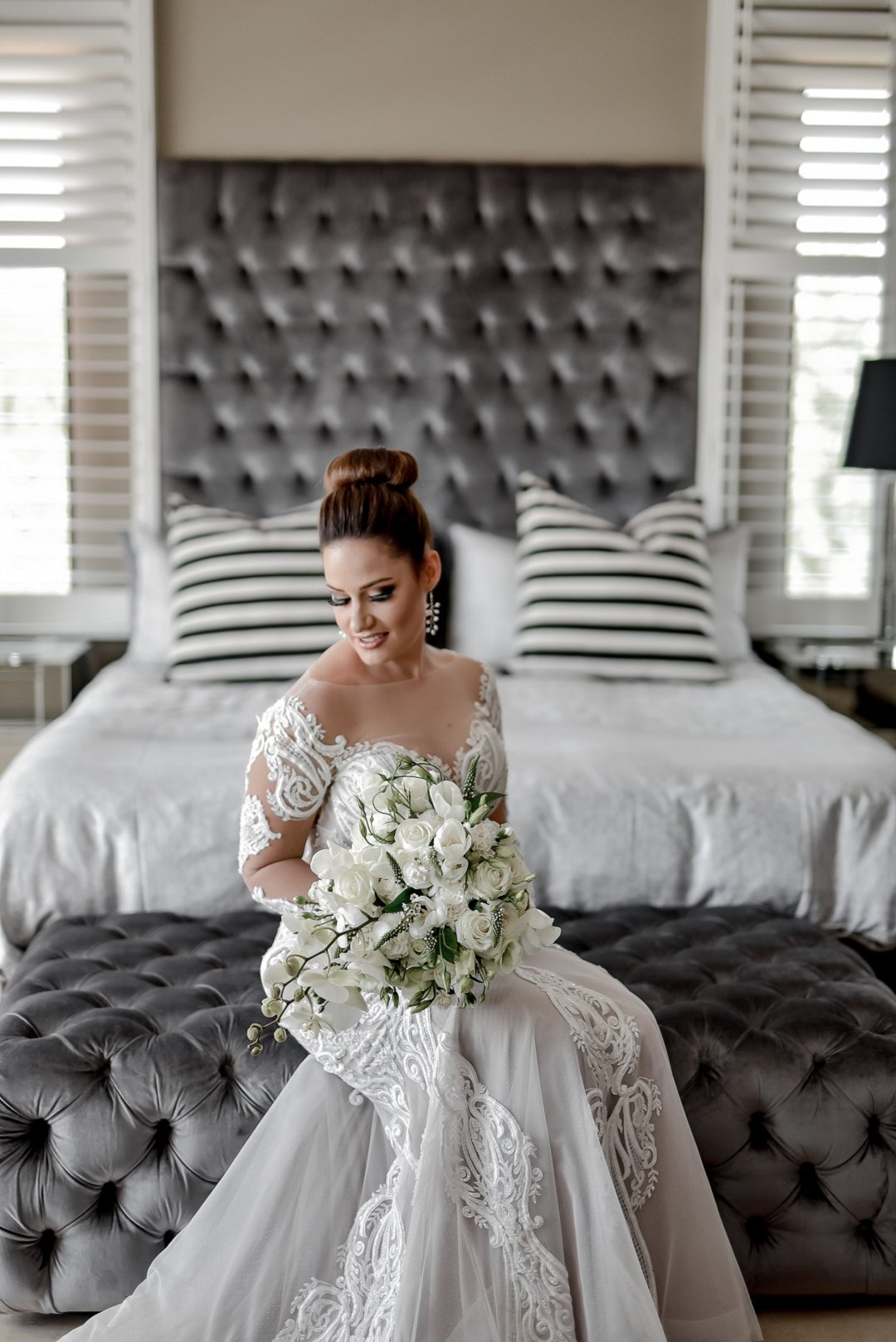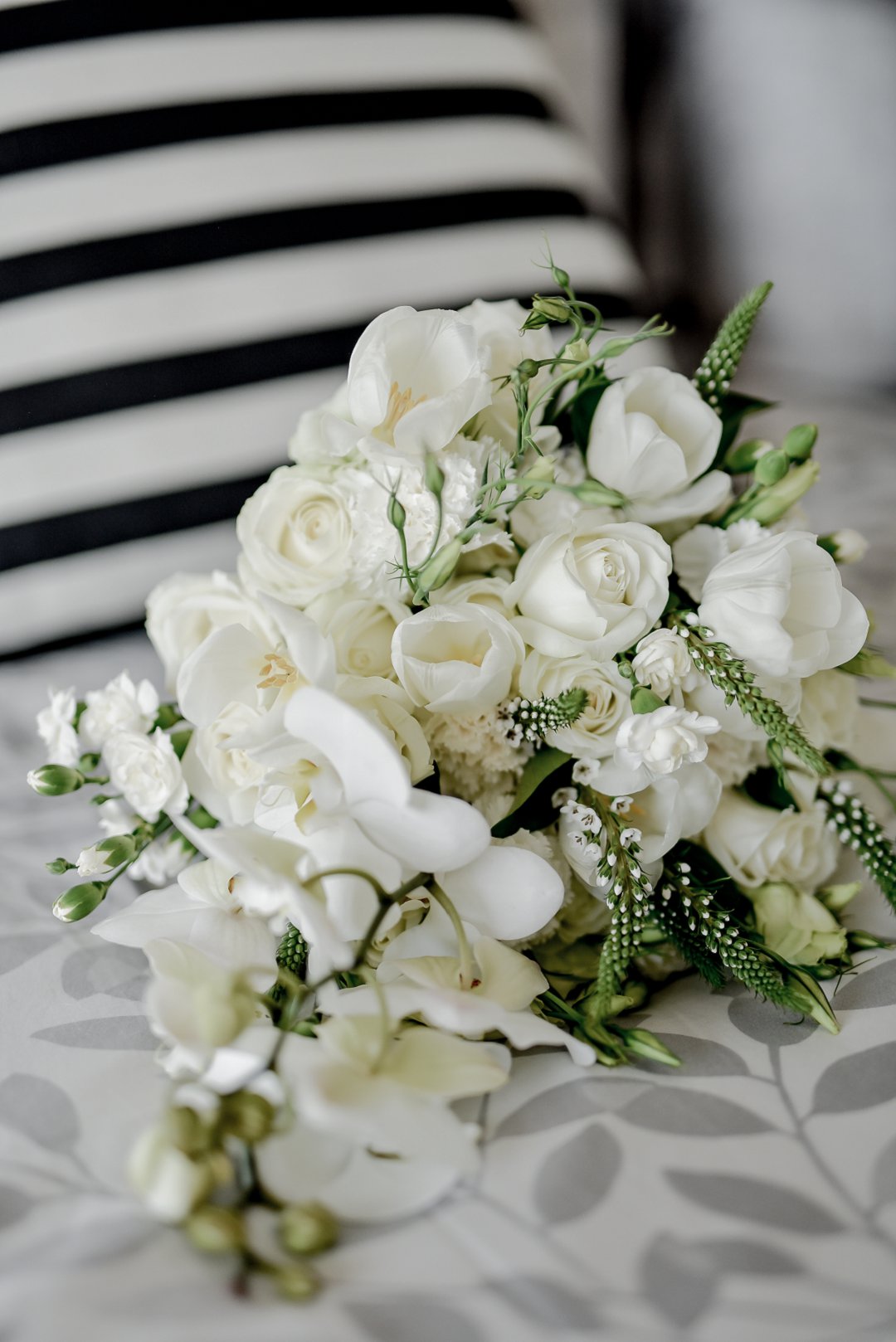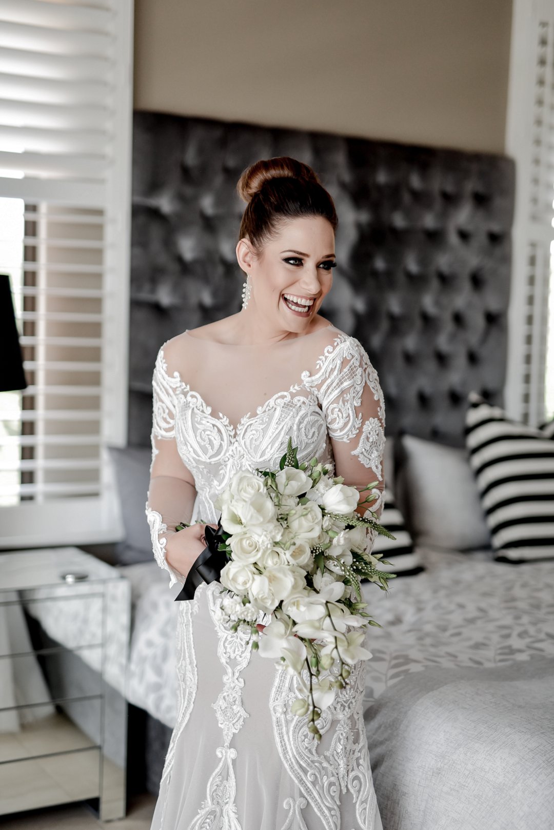 As jy die fotosessie van nader kyk sal jy definitief nie die blomme miskyk nie. Dit is een van die hoofelemente van die dekor. Van die kerk tot in die onthaal. Die handruiker van die model is net so pragtig, mal oor die kombinasie van wit rose en die wit orgideë. Alles werk net so mooi saam.