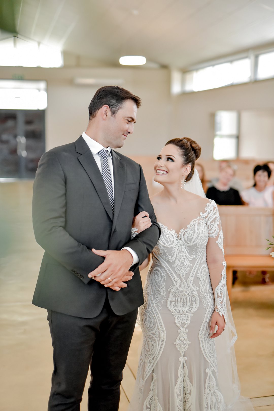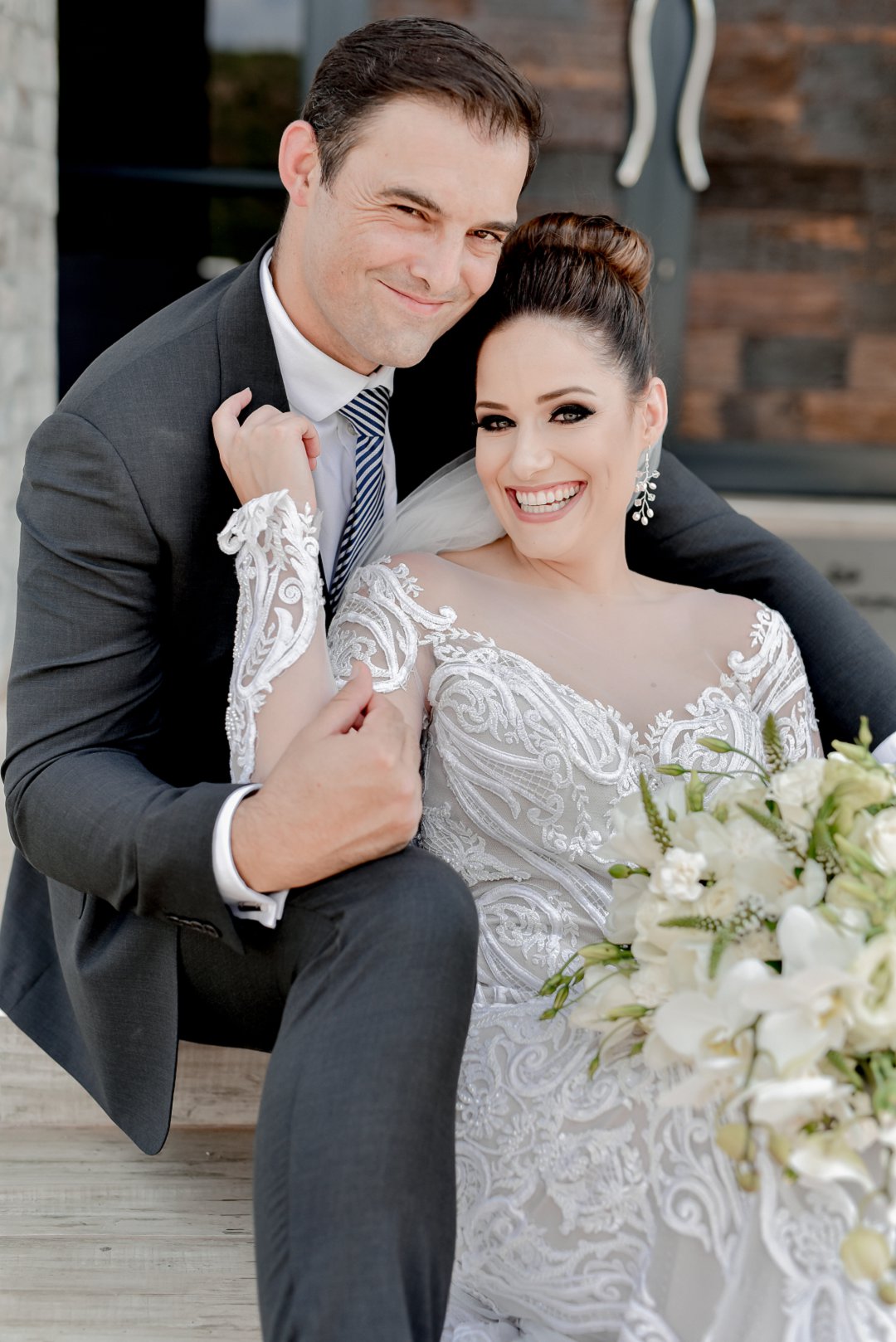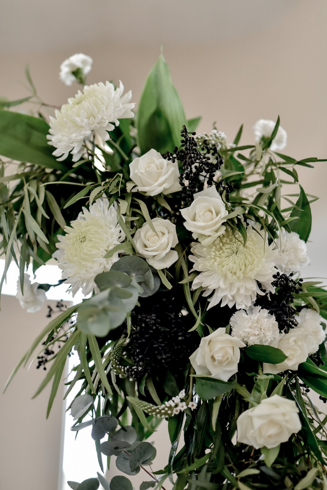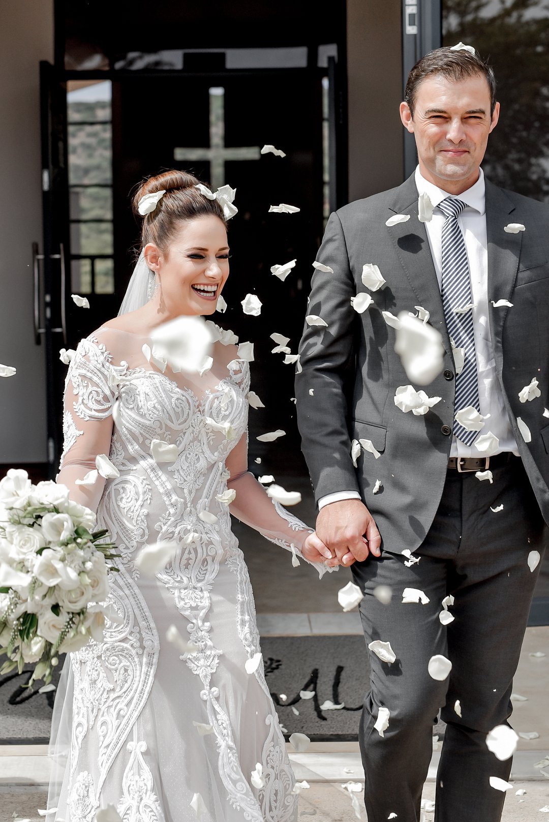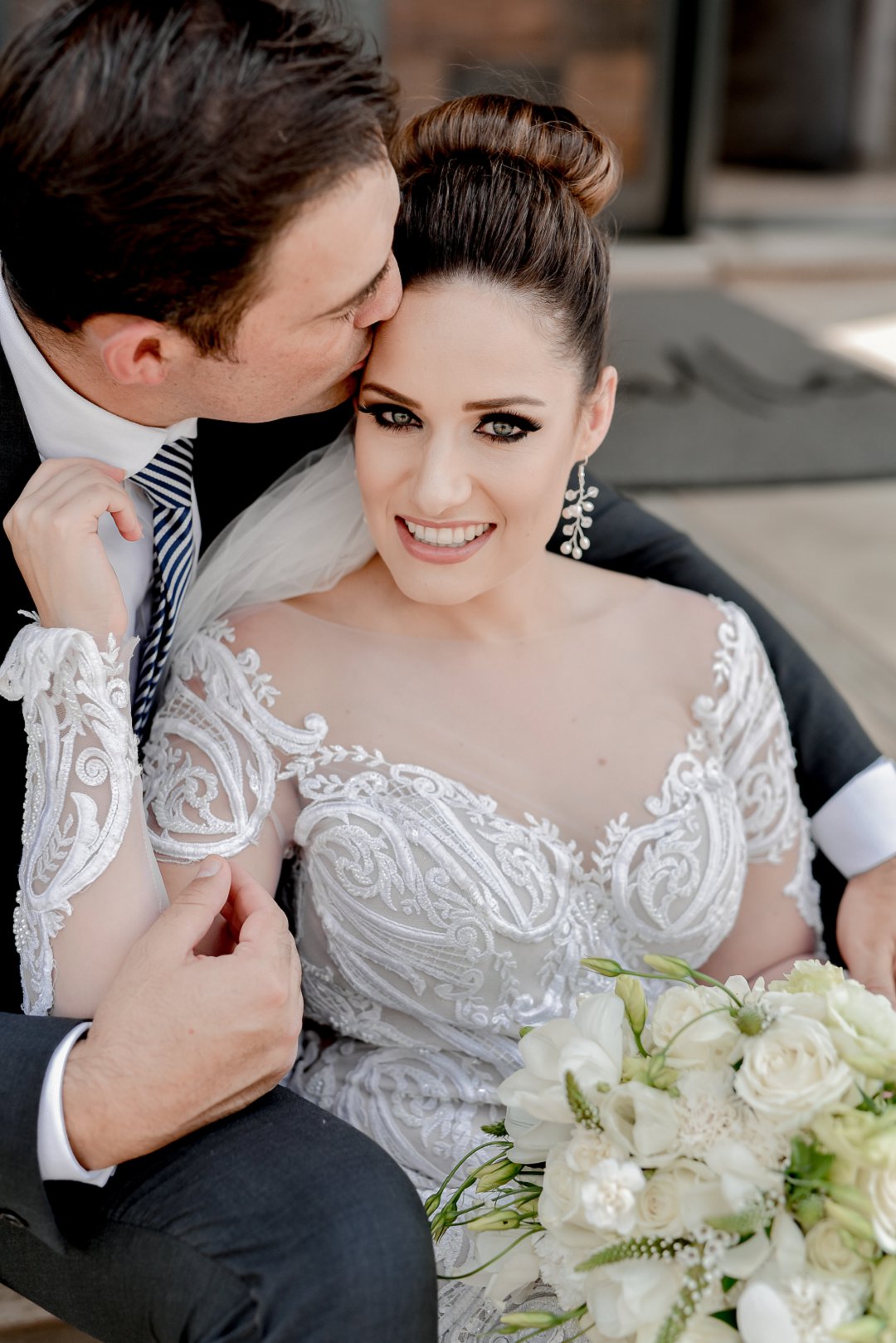 As jy die fotosessie van nader kyk sal jy definitief nie die blomme miskyk nie. Dit is een van die hoofelemente van die dekor. Van die kerk tot in die onthaal. Die handruiker van die model is net so pragtig, mal oor die kombinasie van wit rose en die wit orgideë. Alles werk net so mooi saam.