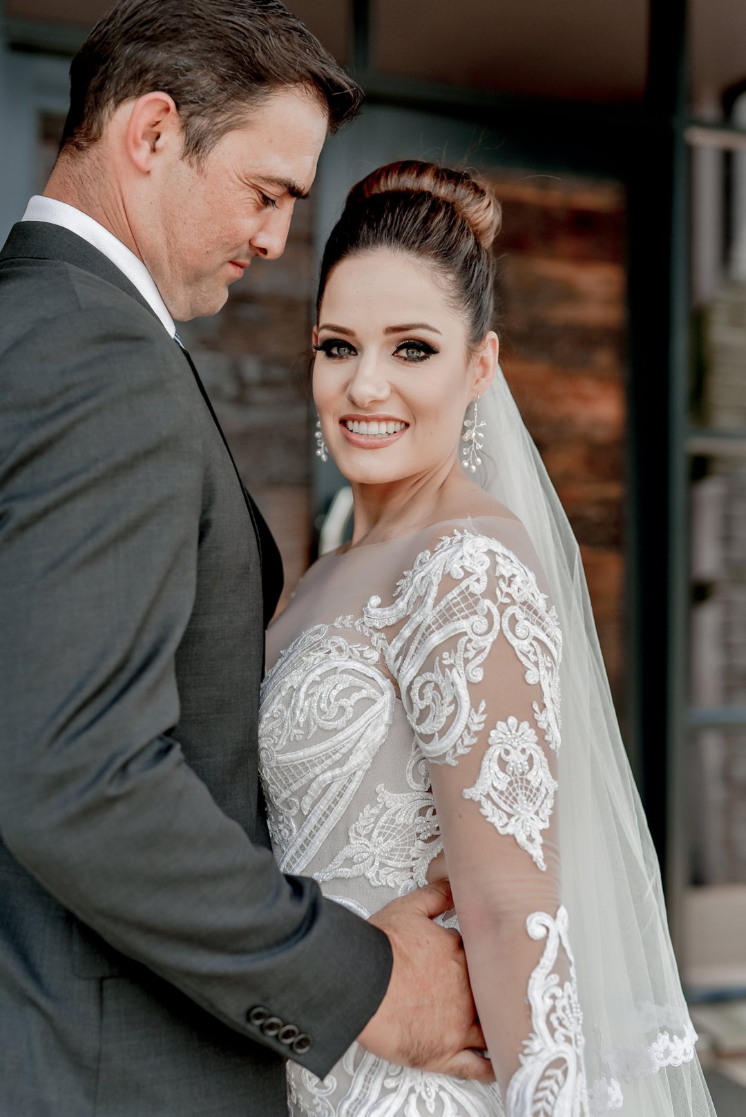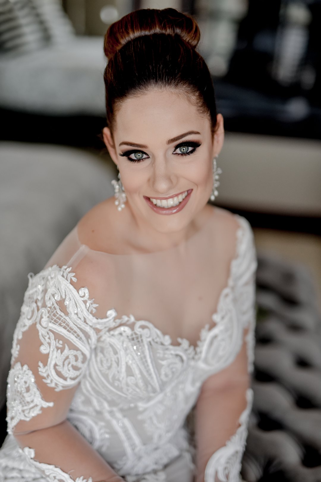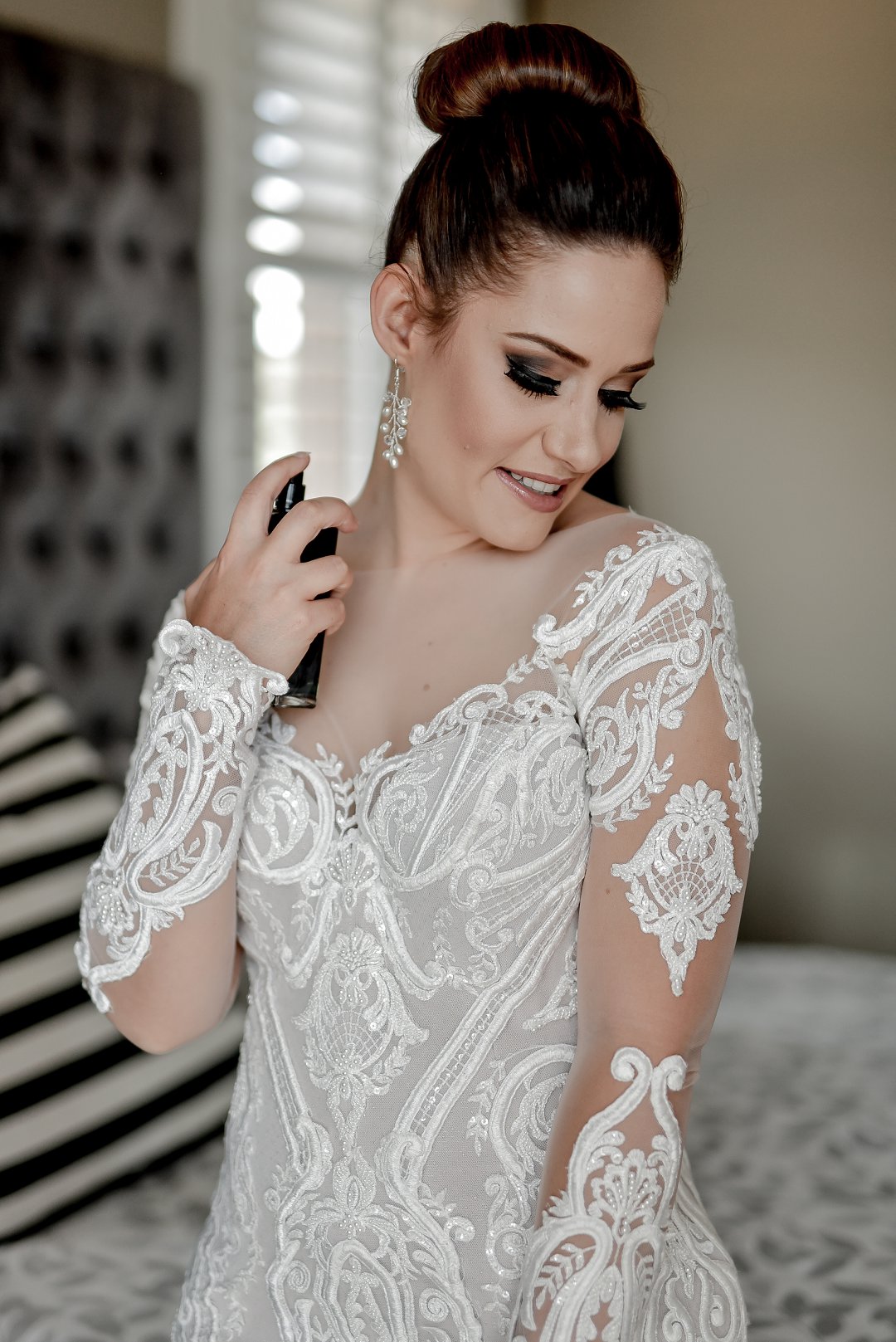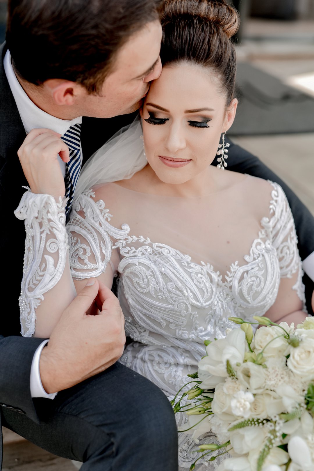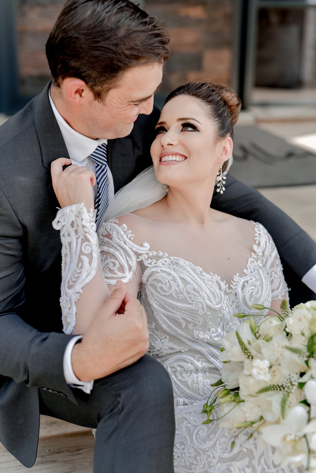As jy die fotosessie van nader kyk sal jy definitief nie die blomme miskyk nie. Dit is een van die hoofelemente van die dekor. Van die kerk tot in die onthaal. Die handruiker van die model is net so pragtig, mal oor die kombinasie van wit rose en die wit orgideë. Alles werk net so mooi saam.
