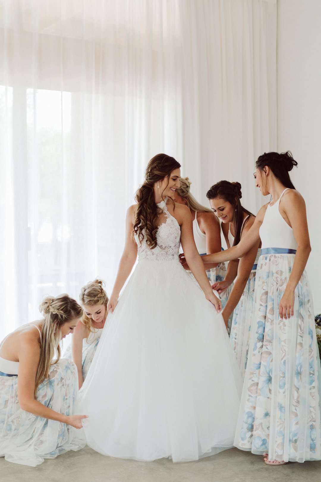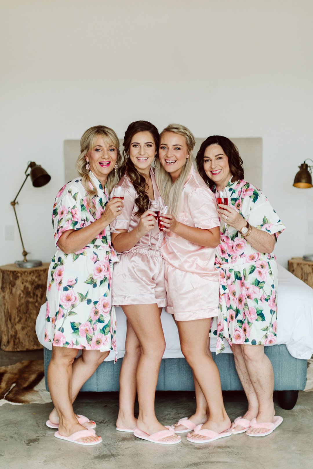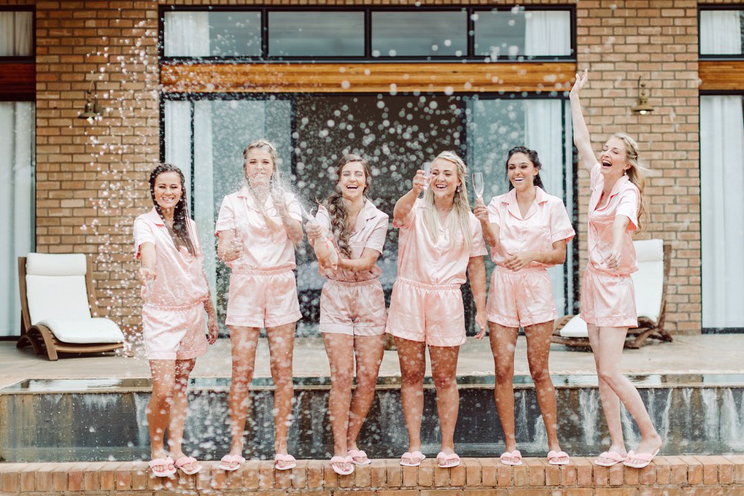 Ons 6 meisies (Ek en my strooimeisies) het vroeg geloop en die borrelbad in die bruidsuite gaan geniet! Saterdag kon NIE MEER perfek wees nie! Die weer was so mooi dit was bewolk. Ons meisies en die twee ma’s het nie warm gekry nie en daarom kon ons met oop deure in ons pajamas in die bruidsuite dans heel oggend met die bosveld as ons uitsig. E lke meisie het ‘m stel pajamas van Sew Couture gedra en die twee ma’s het dieselfde japonne ook van Sew Couture gedra(Die fotos is stunning wens ek kan alles opsit!).