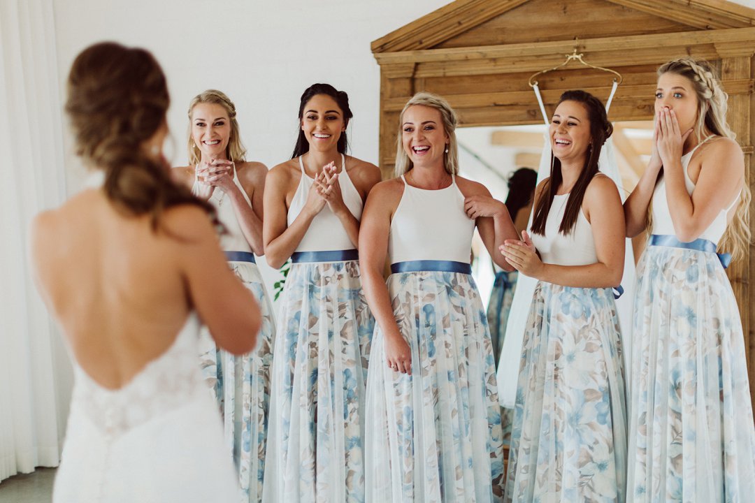 Ek het ‘n week voor die troue met die videograaf (Ducksoup Productions) gepraat. Hulle het gesê ‘n ‘bridal review’ gaan nie moontlik wees nie. Dit gaan te warm wees vir die meisies om buite te staan terwyl ek aantrek. Asook, die badkamer is te klein hulle. So hulle gaan nie mooi fotos kry met die meisies wat dan uit die badkamer verskyn nie. Sowaar met die weer kon ek my ‘bridal review’ doen.