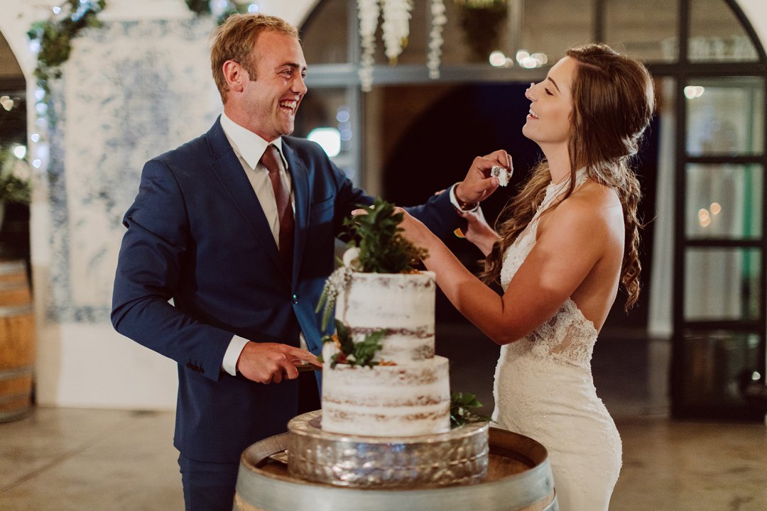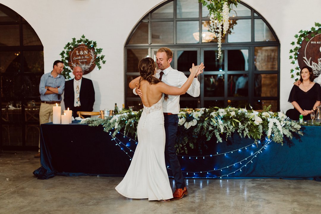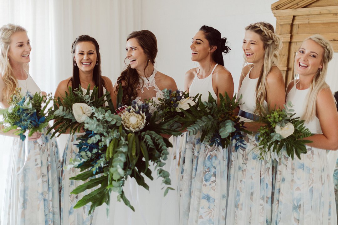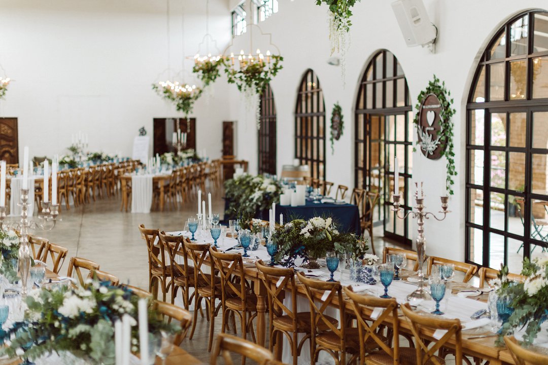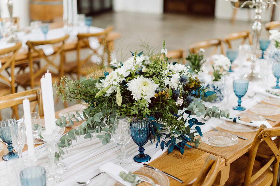 Ons is gek oor Lieneke en Nico se dekor. Alles is net so prentjie mooi. Die blou en wit dekor elemente met tikseltjies groen tussen staan so mooi uit op die rou hout tafels. Die hoë dak met rou hout balke van die venue gee dit ook ekstra ruimte en ‘n lekker plaas gevoel. Jy kan dien hulle het baie pret gehad op hul troudag. Die gaste het almal so gelukkig en opgewonde gelyk om die paartjie se bruilof te vier.