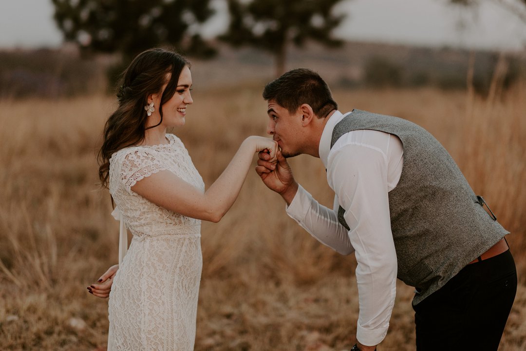 Die hele idee agter ons troue se styl is boheems met Å tikkie sjiek.Ā Ek het my rok so laat ontwerp dat dit plein, maar met baie detail is.Ā My ring (wat Hannes ontwerp het) pas ook by die styl.Ā Hannes se Damascus-staal ring en sy pak is ook uniek in die opsig.Ā Dit het die styl van ons troue mooi uitgebeeld met die verskillende kleure en teksture.