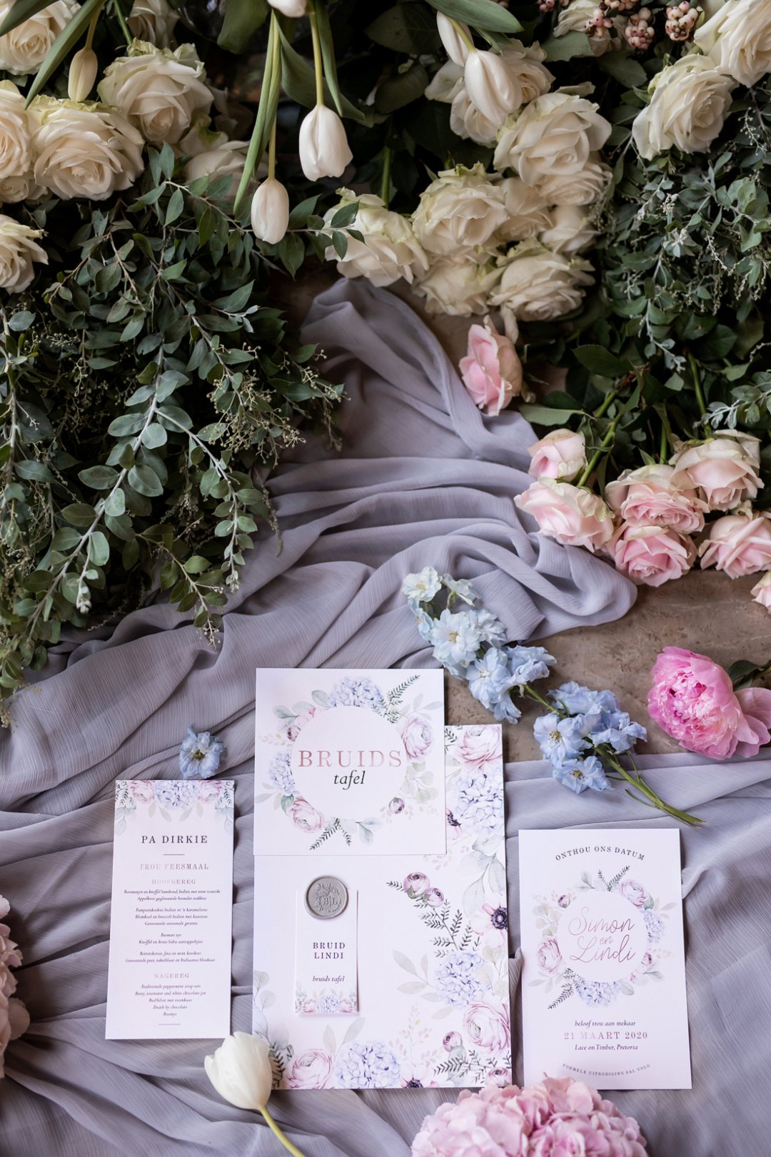 Sugarbird Creative se missie is om iets uniek en eksklusief vir elke tipe bruidspaar te ontwerp. Sy werk volgens die troue se tema, kleurskema, asook die paartjie se persoonlikhede en styl. Hierdie skryfbehoefte-stel is vir ʼn bruid wat van ʼn moderne, tog sagte styl hou. Dit sal die perfekte toevoeging tot ʼn spierwit troue met ʼn pastel kleur-palet wees! Die kersie op die koek is egter dat jy dit alles hier op een plek kan kry! Sê maar totsiens vir verder sukkel en soek! Sugarbird Creative verskaf ʼn volle blommekrans skryfbehoefte-stel, sodat jou gaste al vanaf die héél eerste uitnodiging jou troue se tema kan opsom.