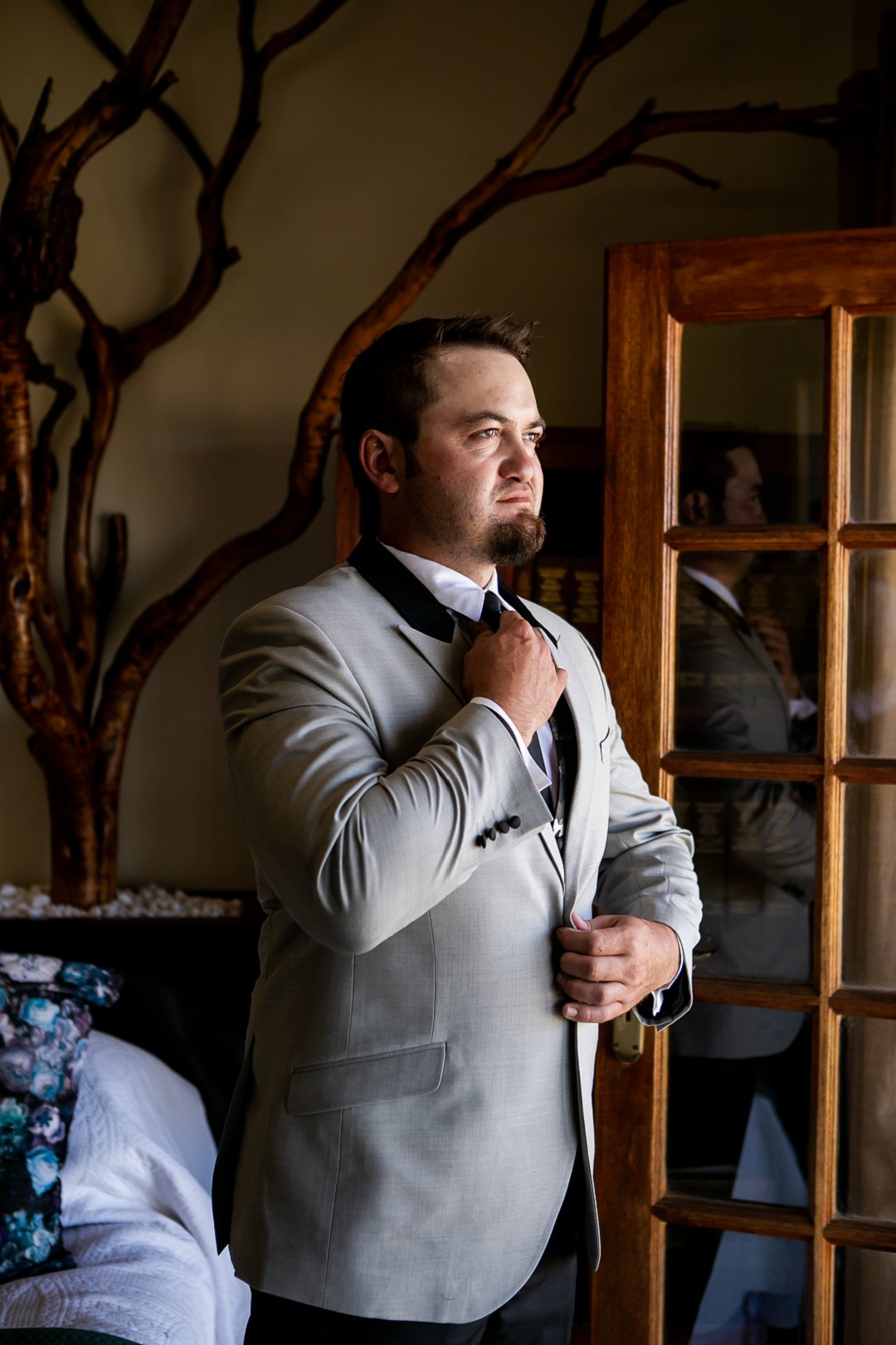 Zaré was nog altyd mal oor die 1920’s, maar tog modern. Baie detail, elegant, skitter en glans. Beukes is mal oor jag en die plaaslewe. Dus het ons probeer die 1920’s en ʼn plaastroue saam te gooi. Dus die rok (1920’s geïnspireerd – Baie kant, pêrel detail en veertjies), pak (jag geïnspireerd – Blink kamoefleer onderbaadjie en koeël manchet-knope.